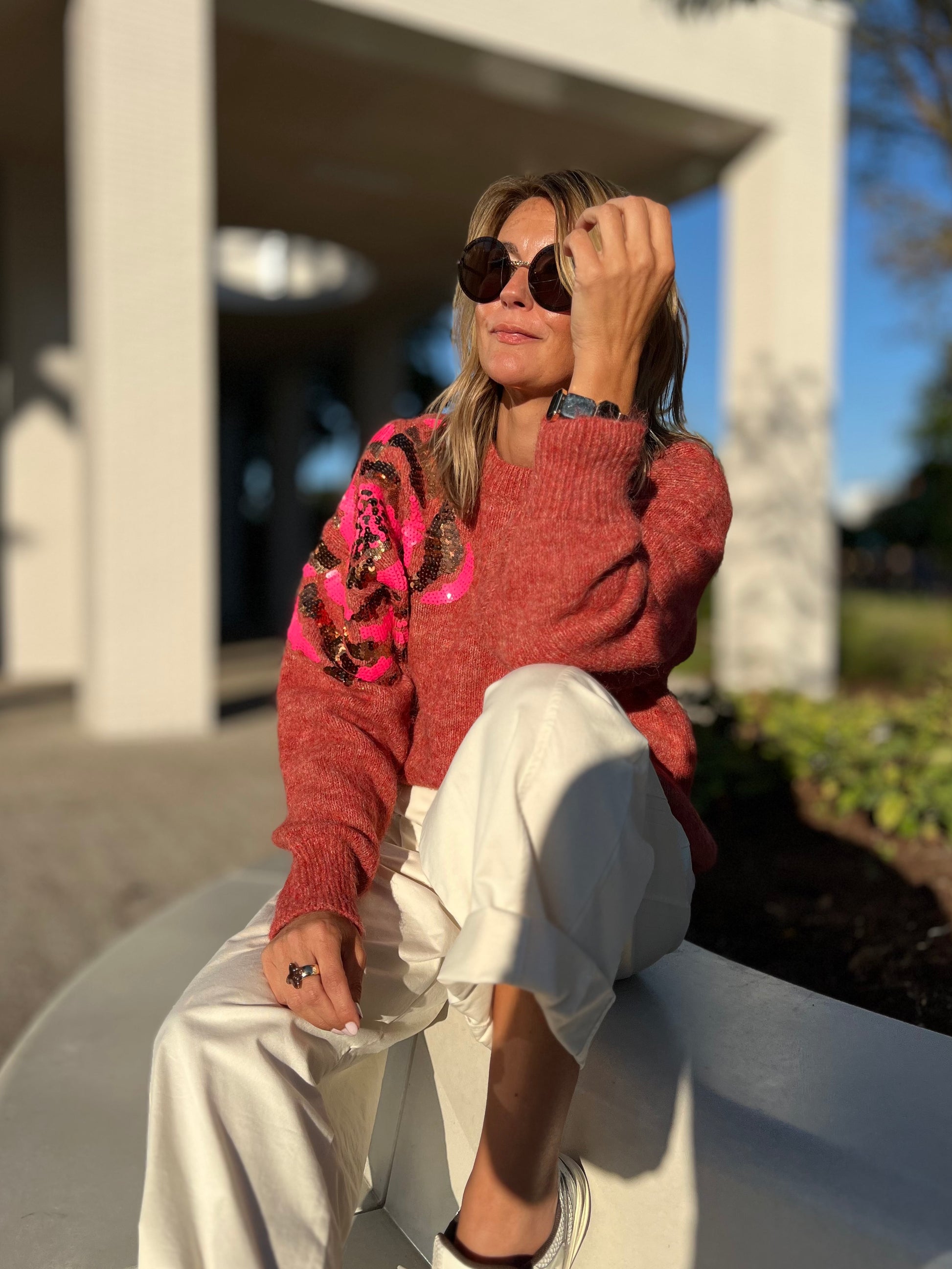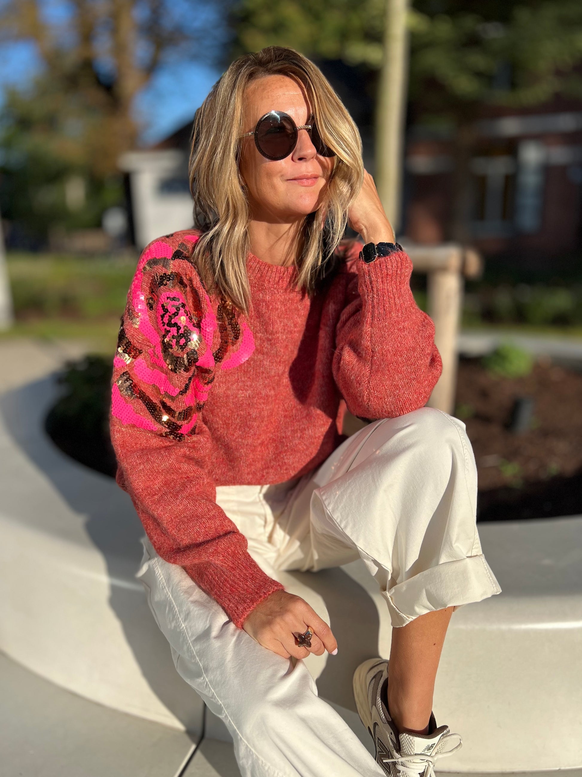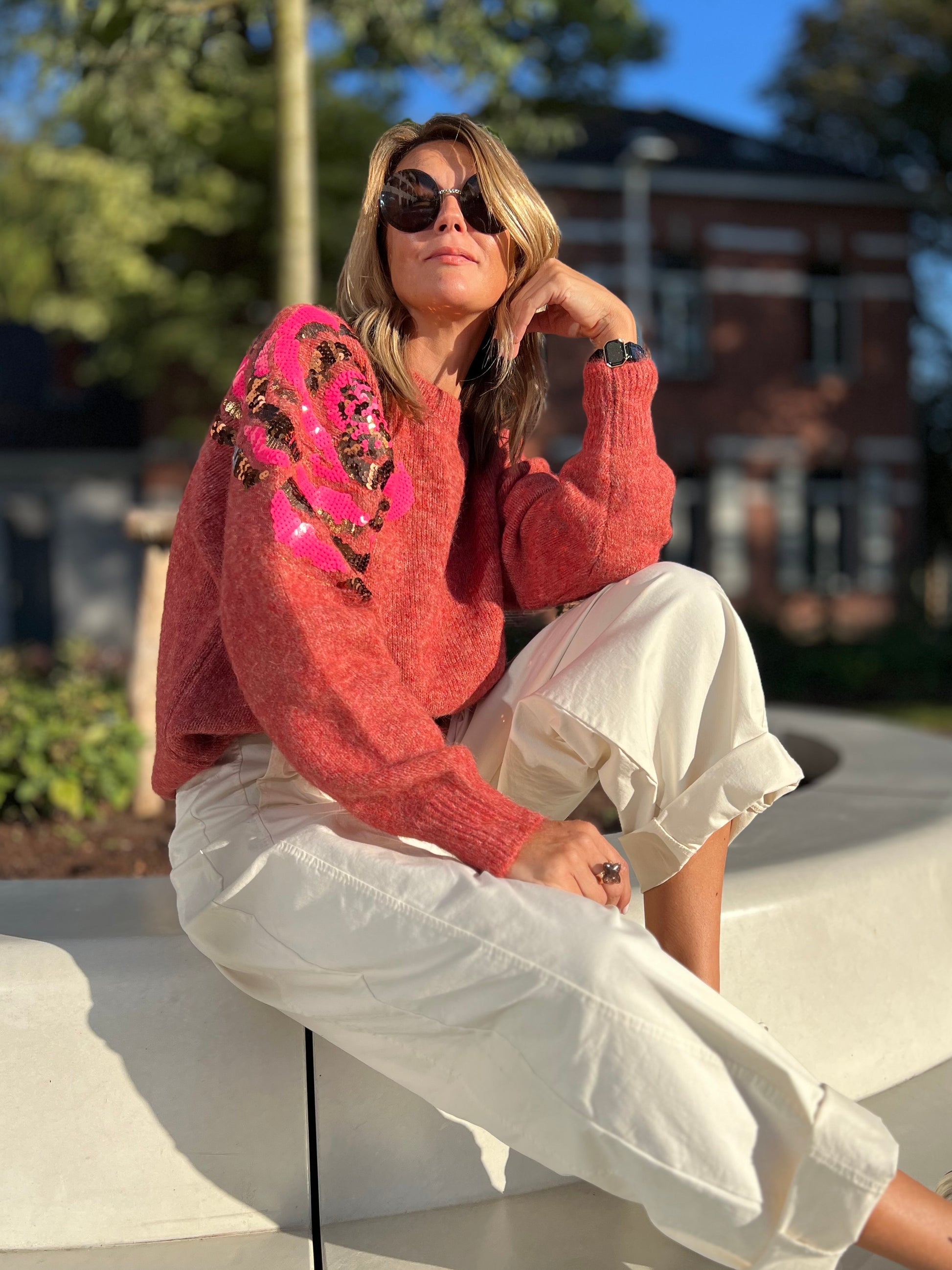 De warme oranje roestbruine kleur van de Alba pull vormt een prachtig contrast met een opvallens schouderdetail rijkelijk afgewerkt met glinsterende pailletten in fuchsia en goud. Het zachte breisel voelt heerlijk comfortabel aan, terwijl de relaxed fit zorgt voor een moderne, nonchalante look.