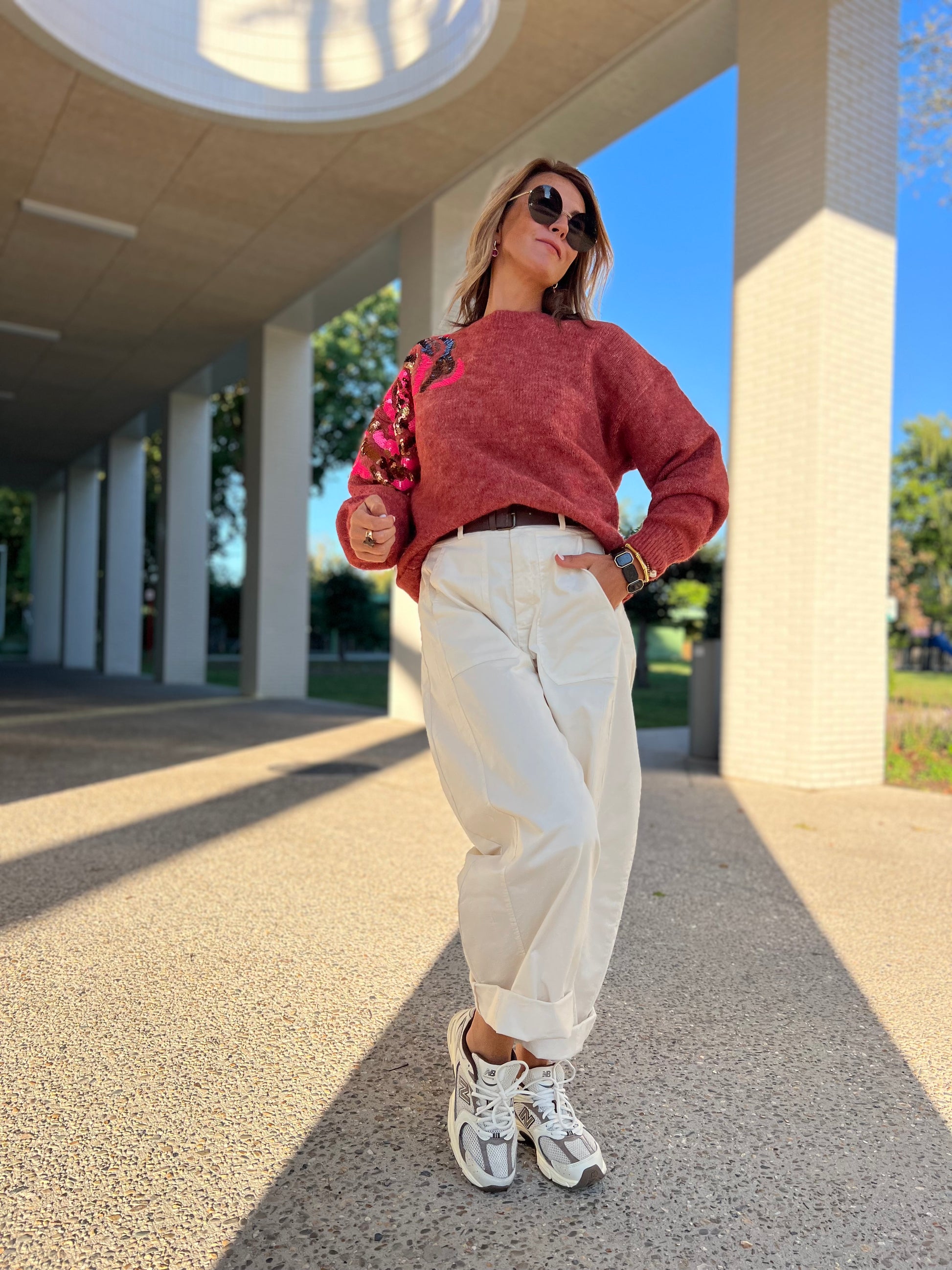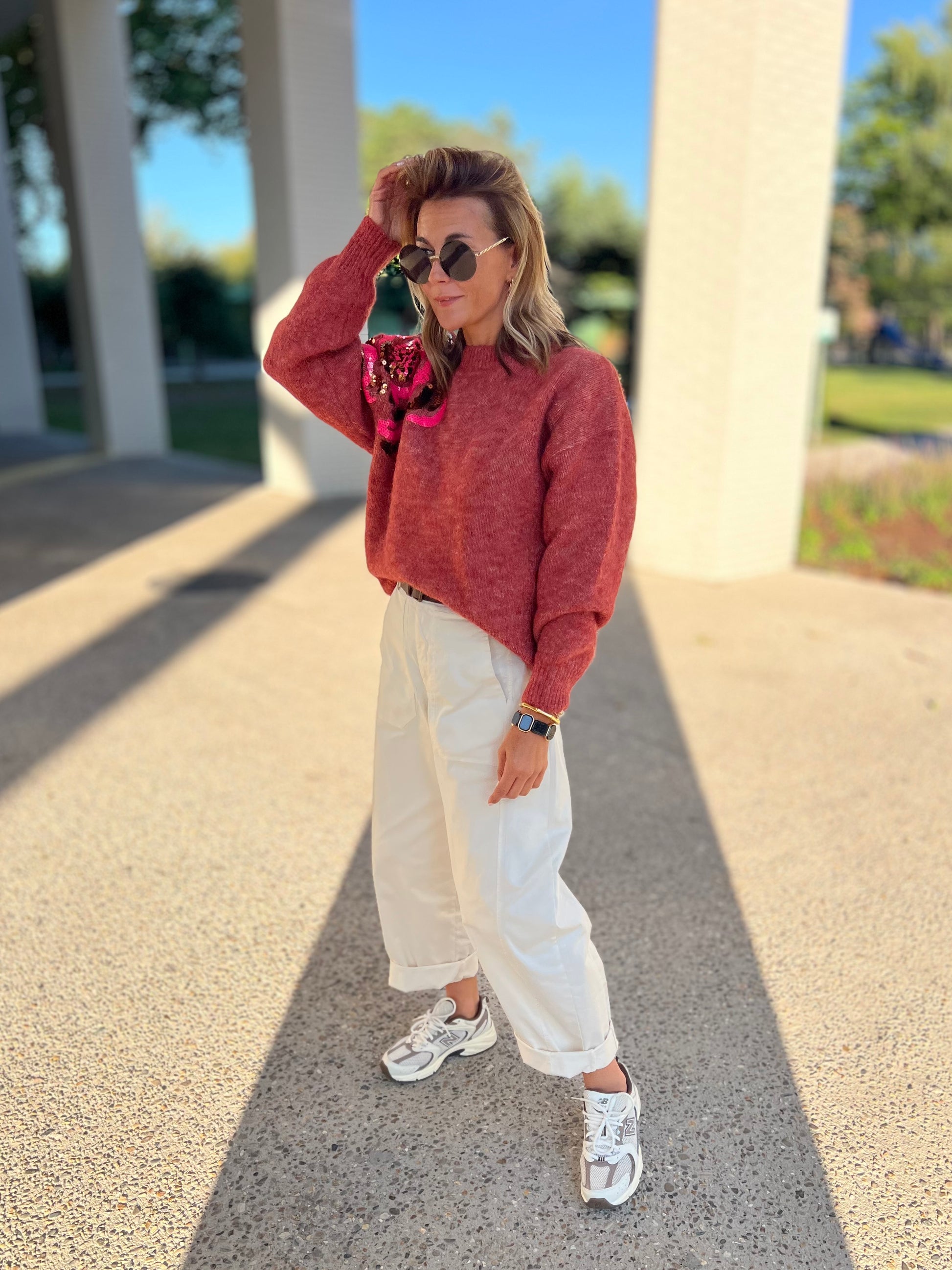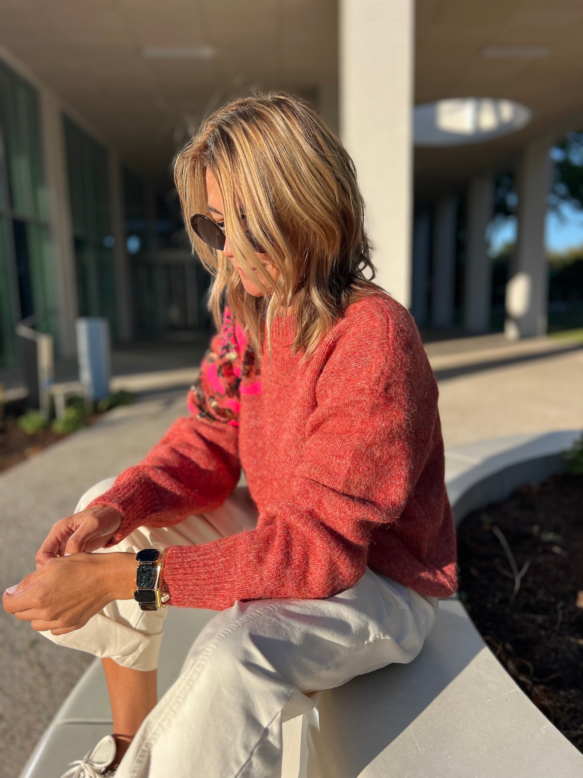 De warme oranje roestbruine kleur van de Alba pull vormt een prachtig contrast met een opvallens schouderdetail rijkelijk afgewerkt met glinsterende pailletten in fuchsia en goud. Het zachte breisel voelt heerlijk comfortabel aan, terwijl de relaxed fit zorgt voor een moderne, nonchalante look.