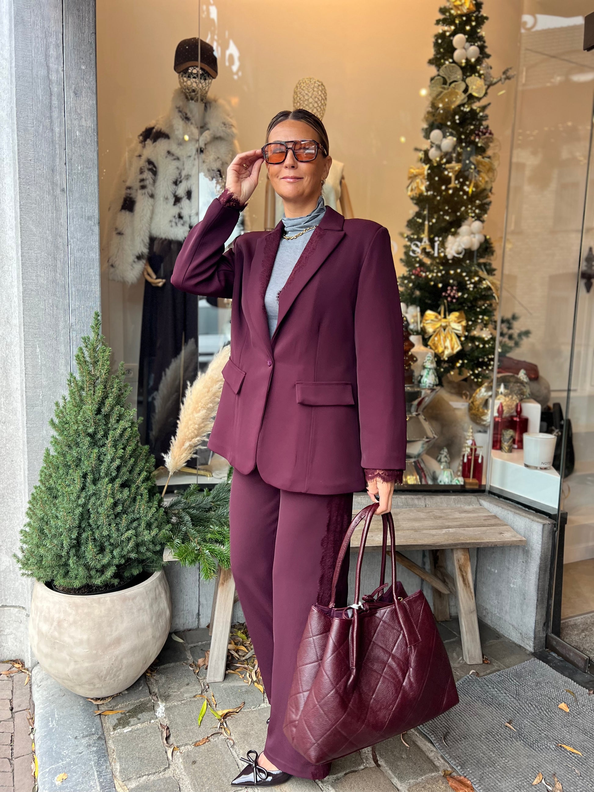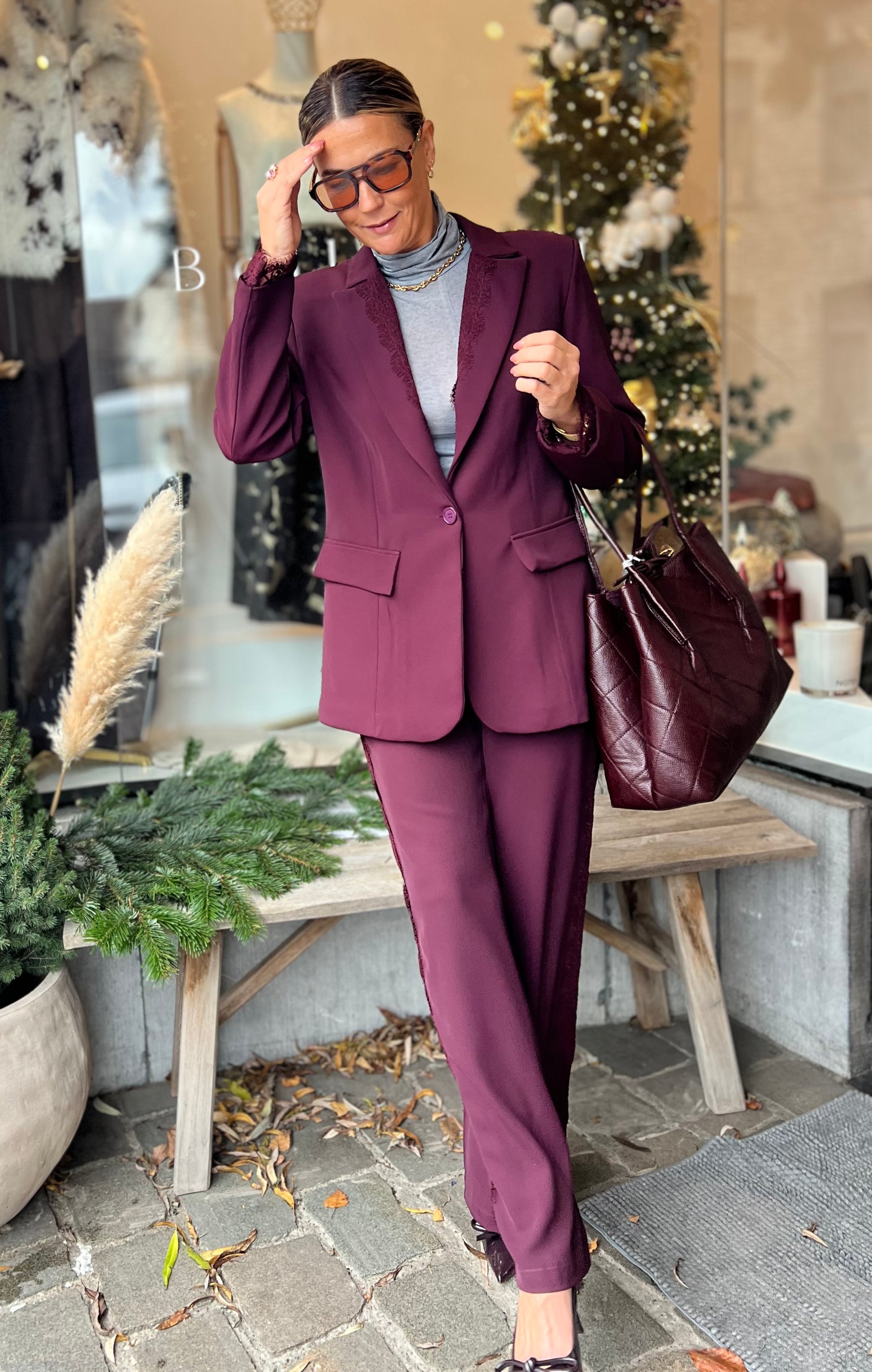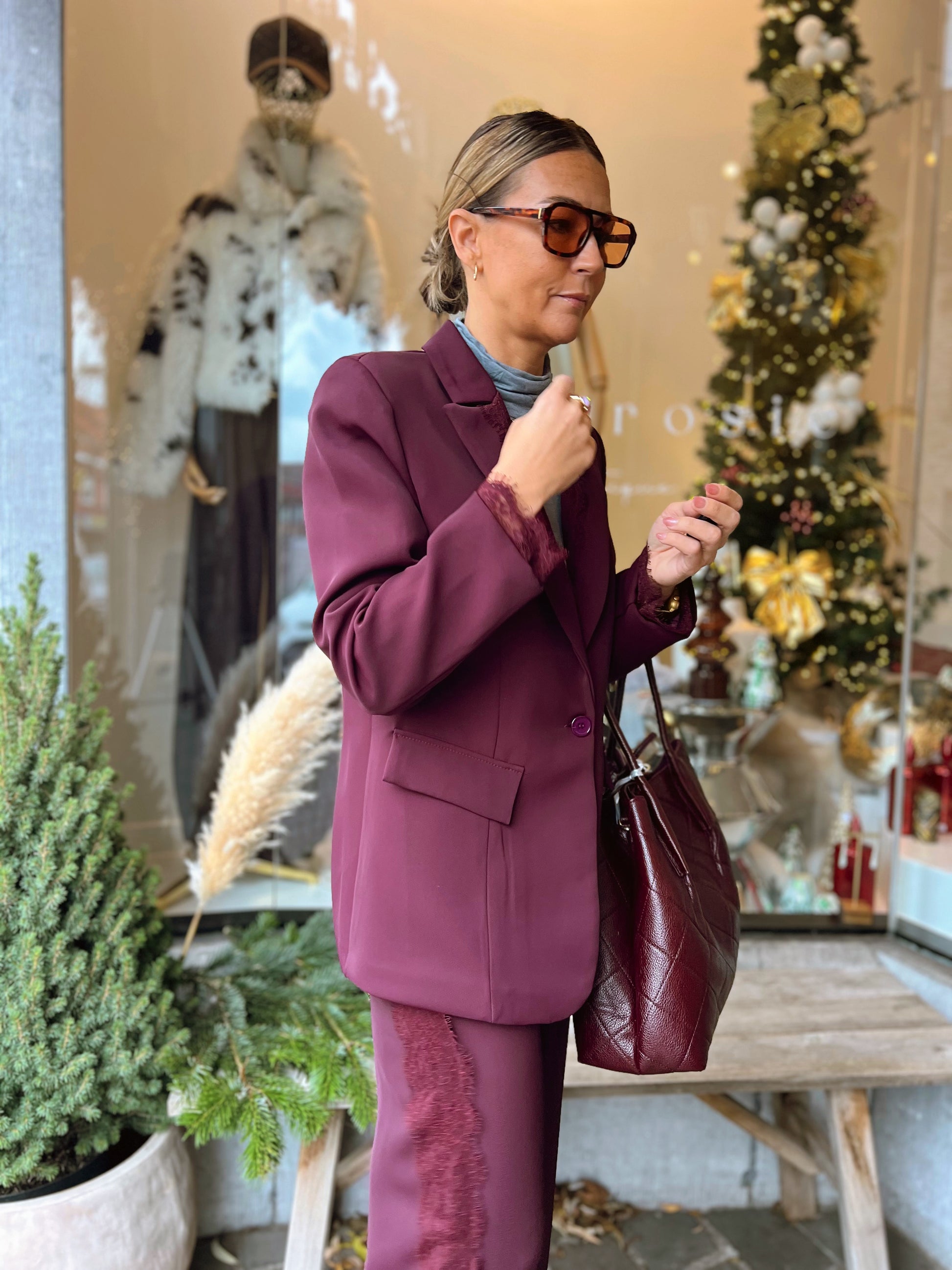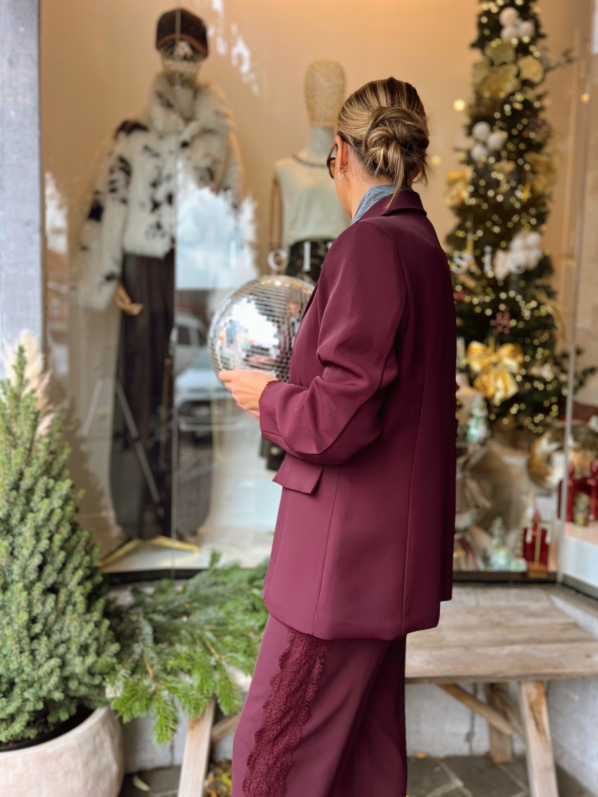 De bordeaux blazer. Een recite, vrouwelijke snit zorgt voor een elegante uitstraling, terwijl het subtiele kanten detail aan de mouw en kraag een verfijnde, vrouwelijke touch geeft.