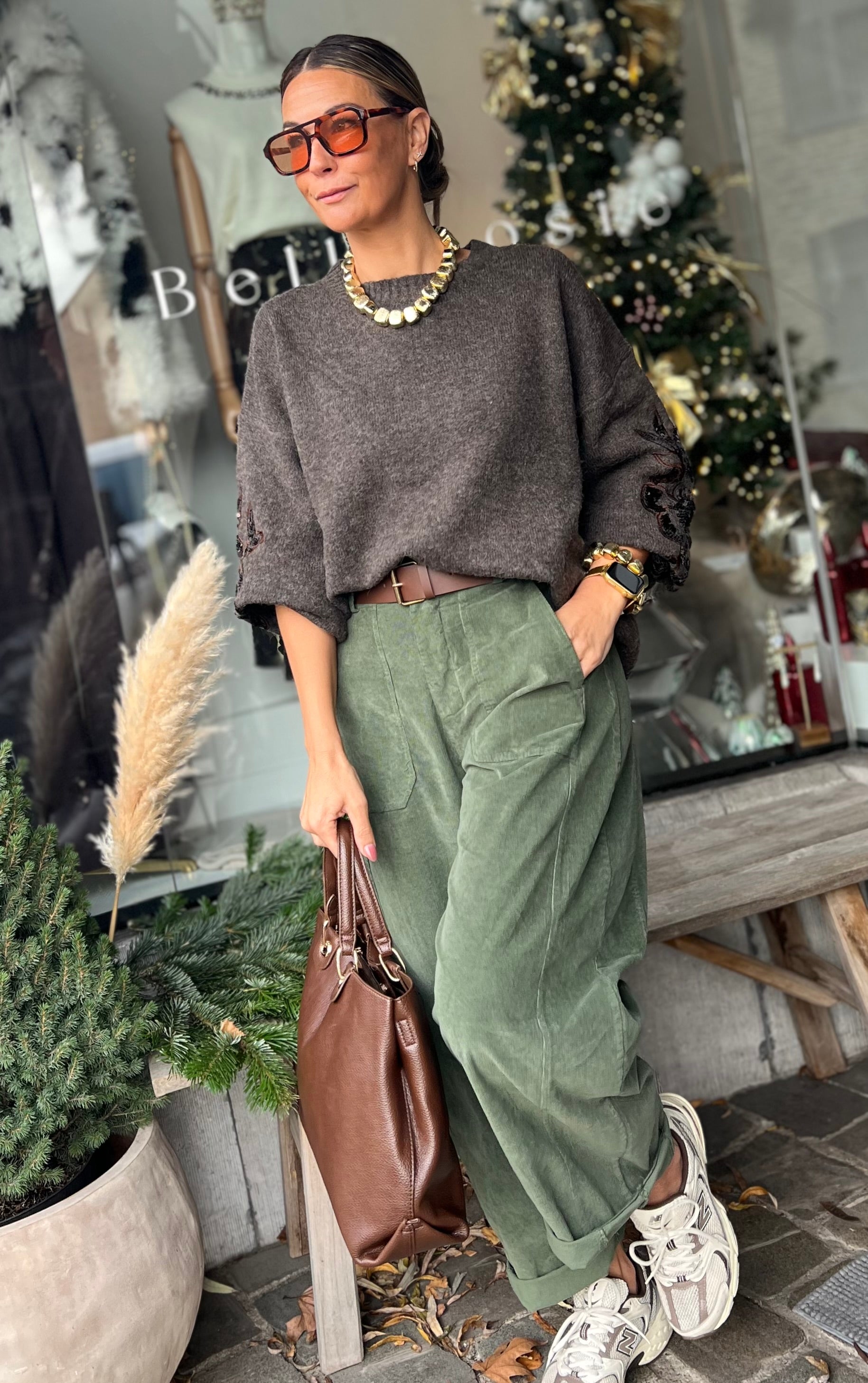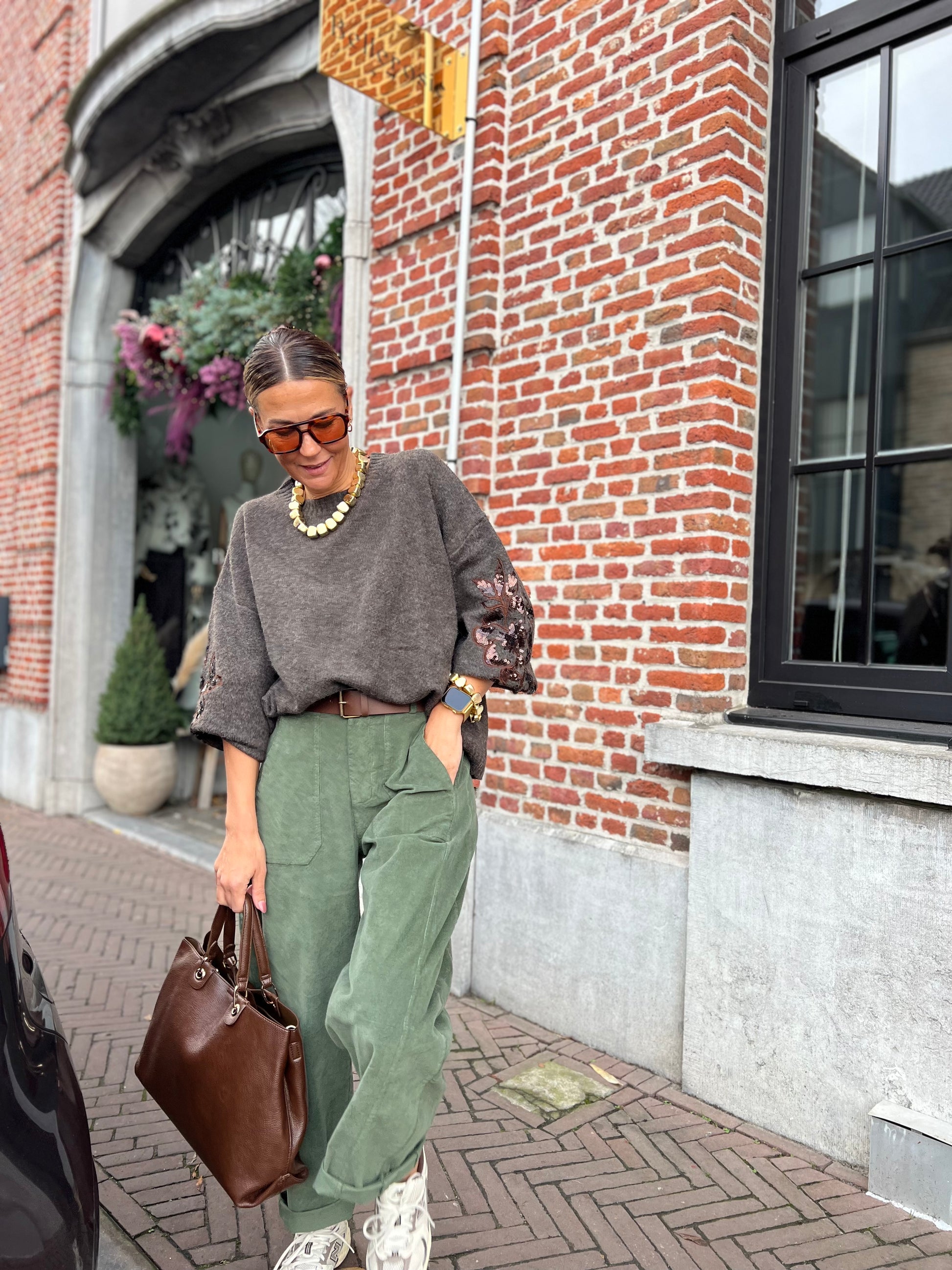Deze in een dongergroene kleur en een ribfluwelen stof