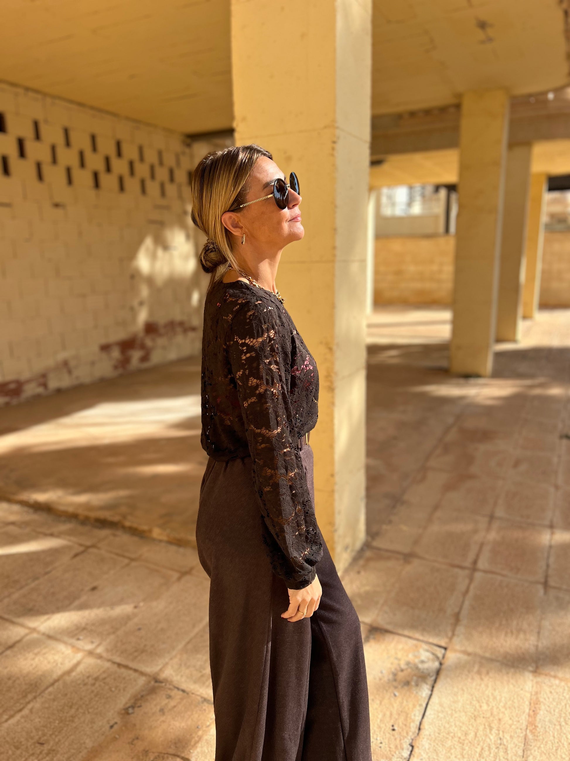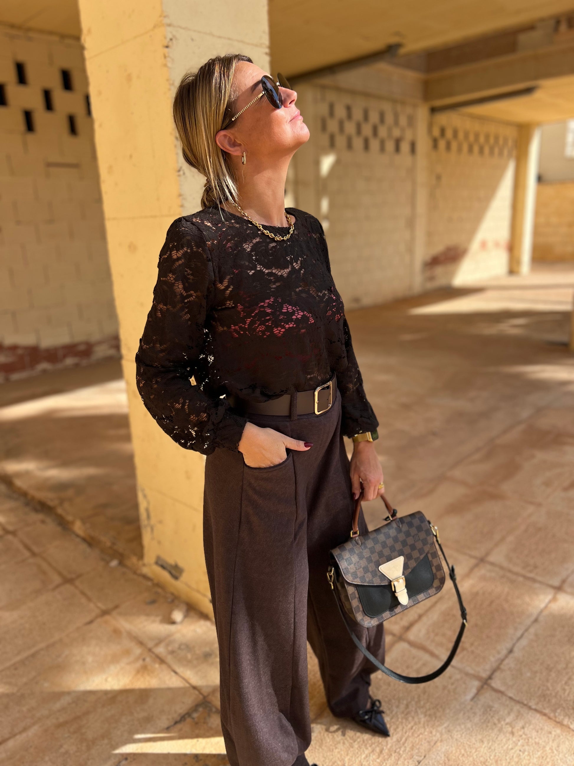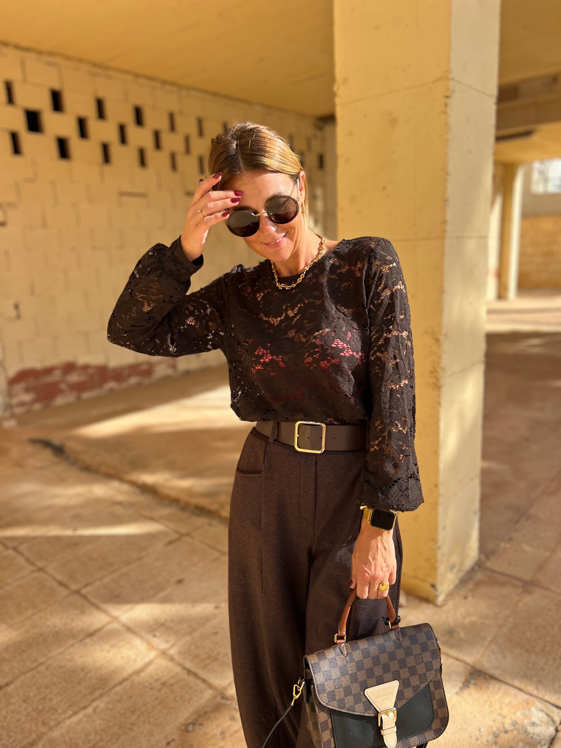 Een elegante chocoladebruine kanten top met een ronde hals en lichte pofmouwen.