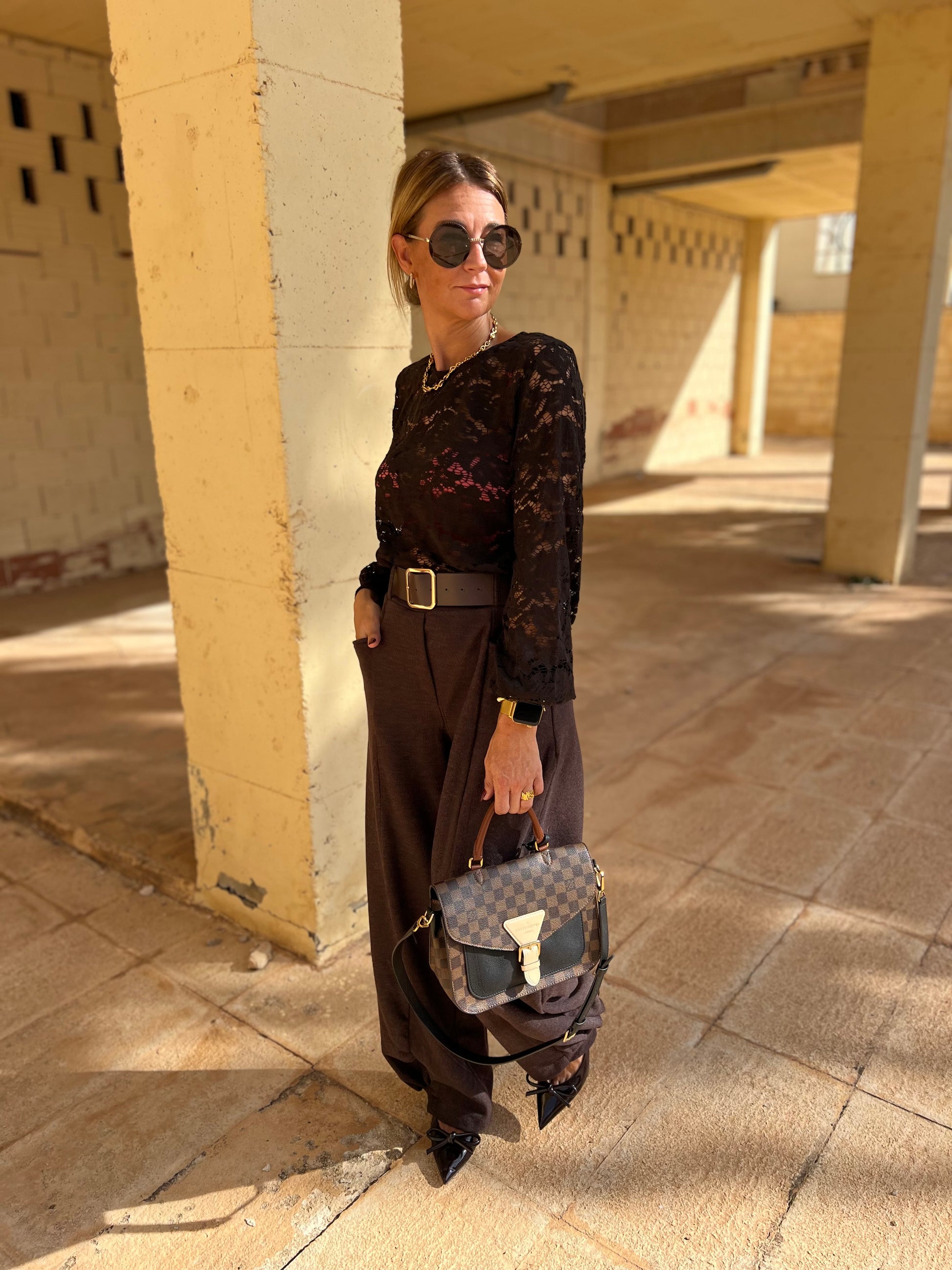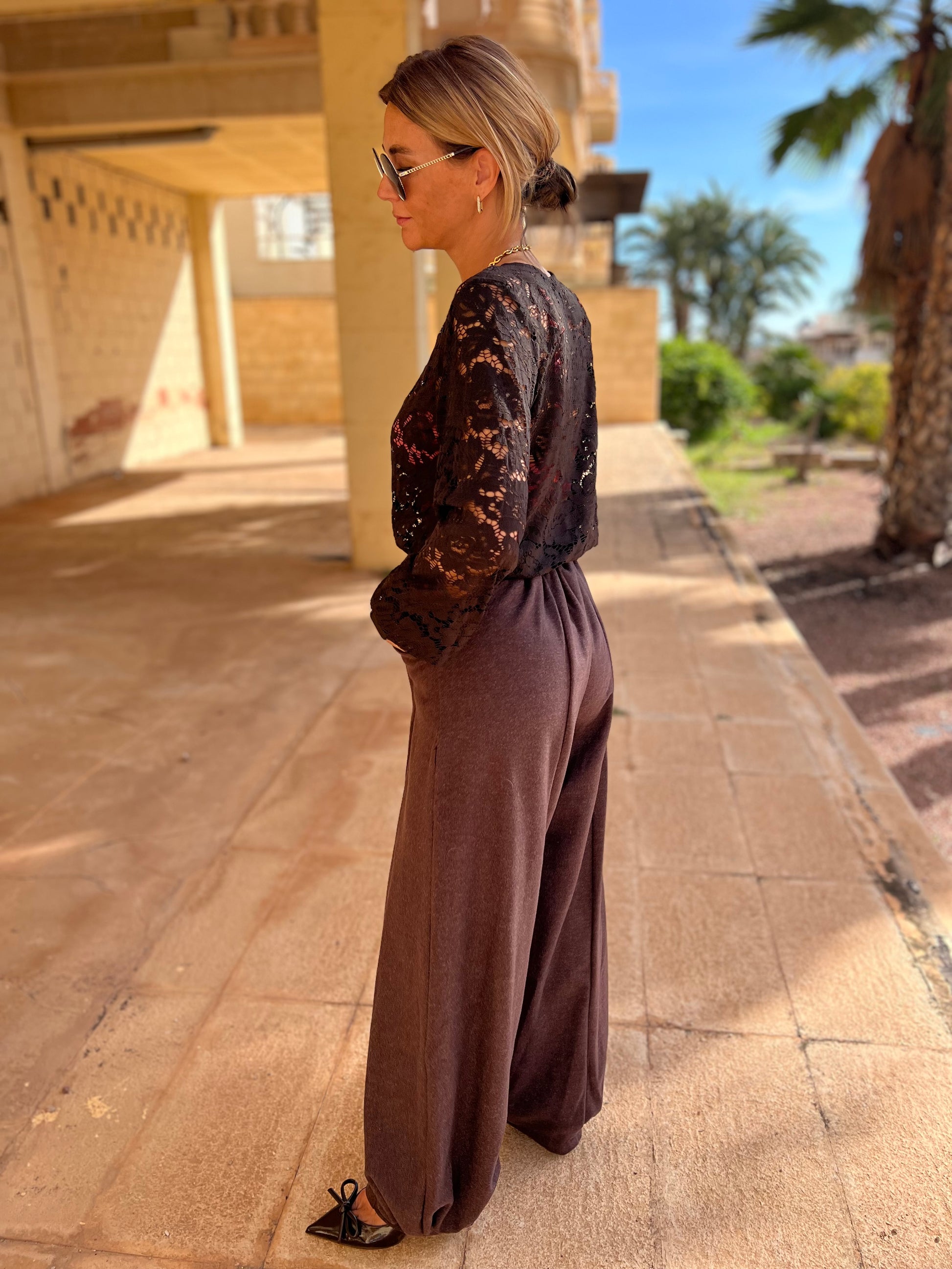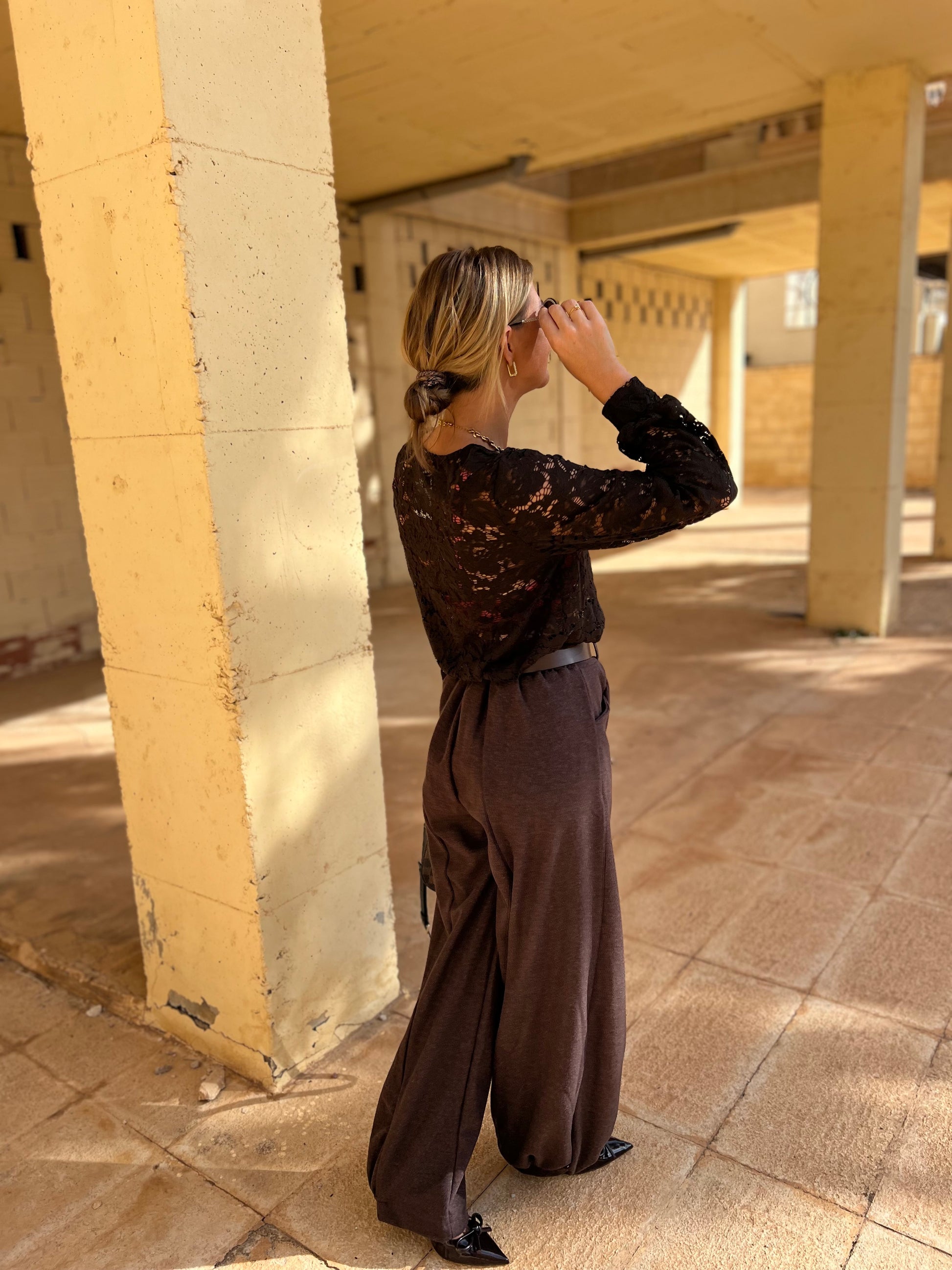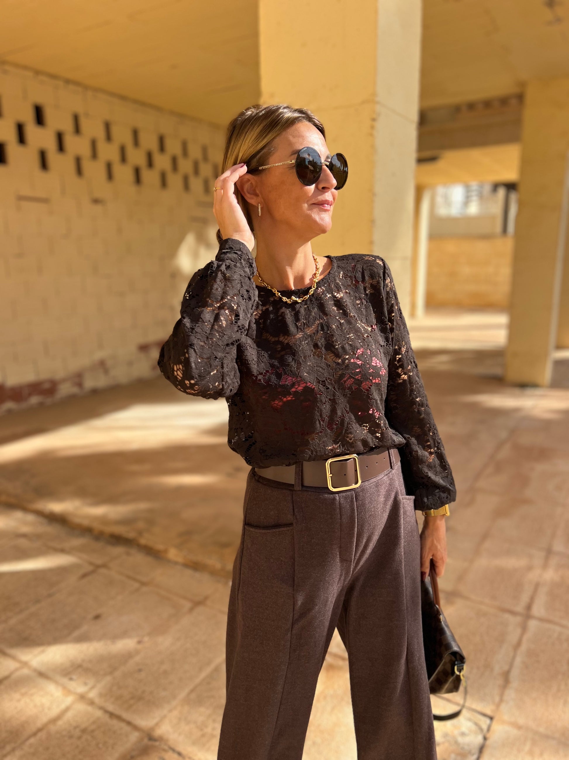 Een elegante chocoladebruine kanten top met een ronde hals en lichte pofmouwen.