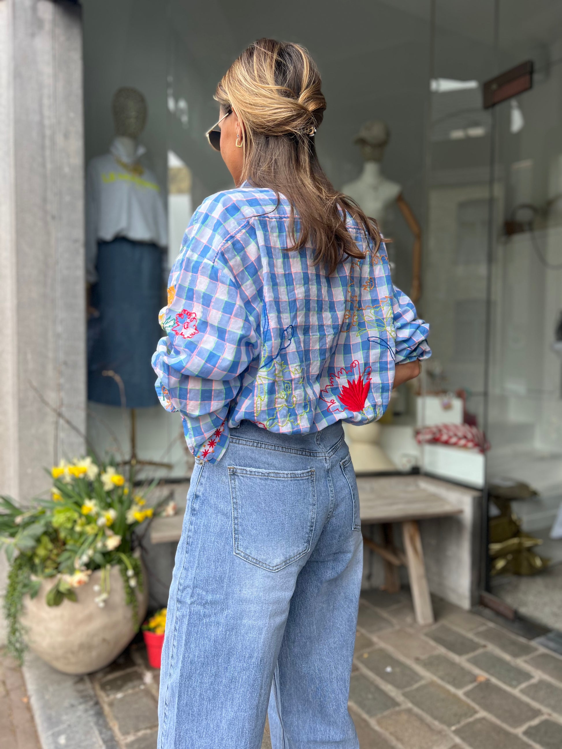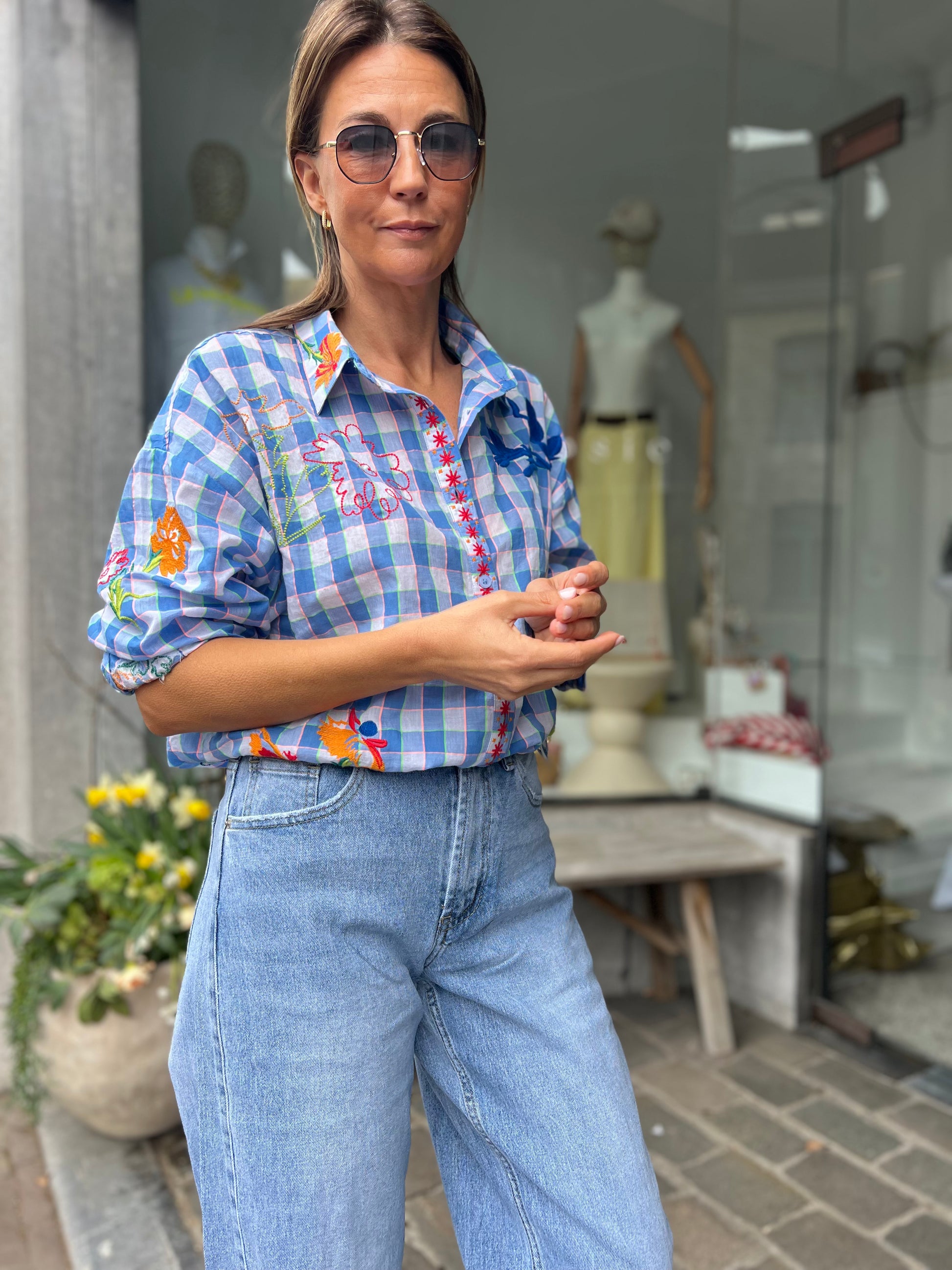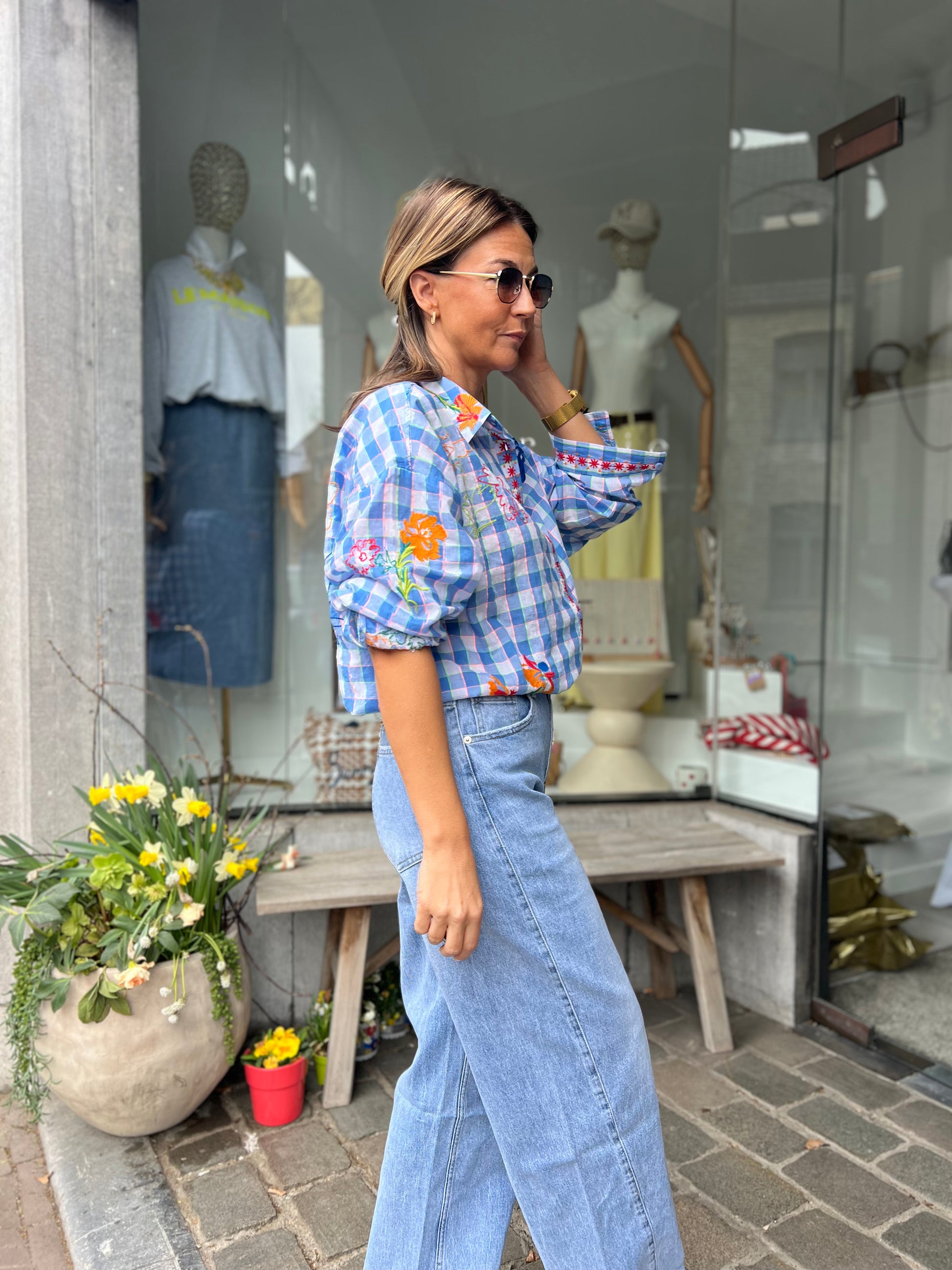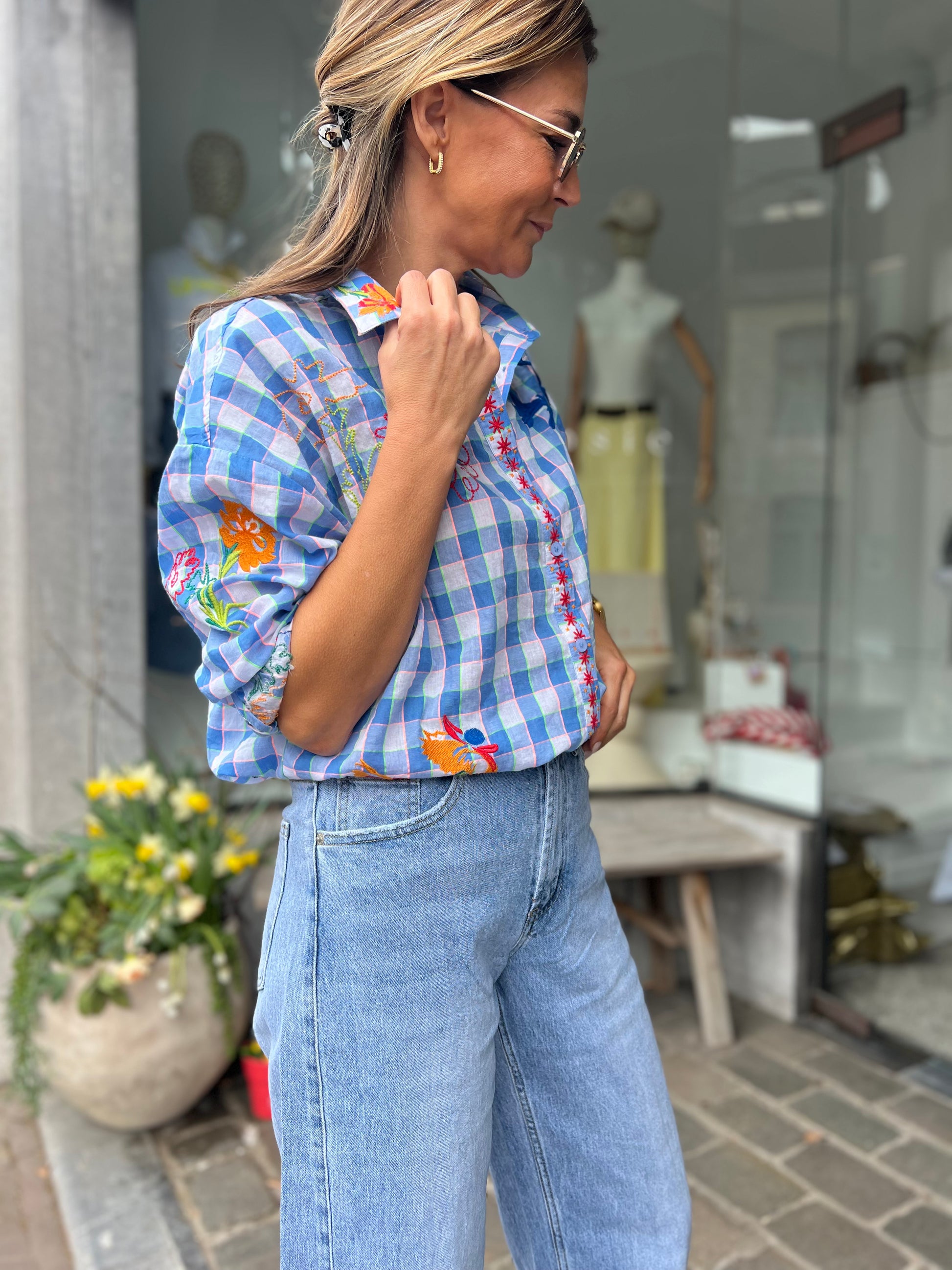Hoe mooi is deze blauw/witte ruitmotief blouse met felle details en kleurrijke borduursels. Check de speelse details zoals het bloemetje op de kraag 😉🧡