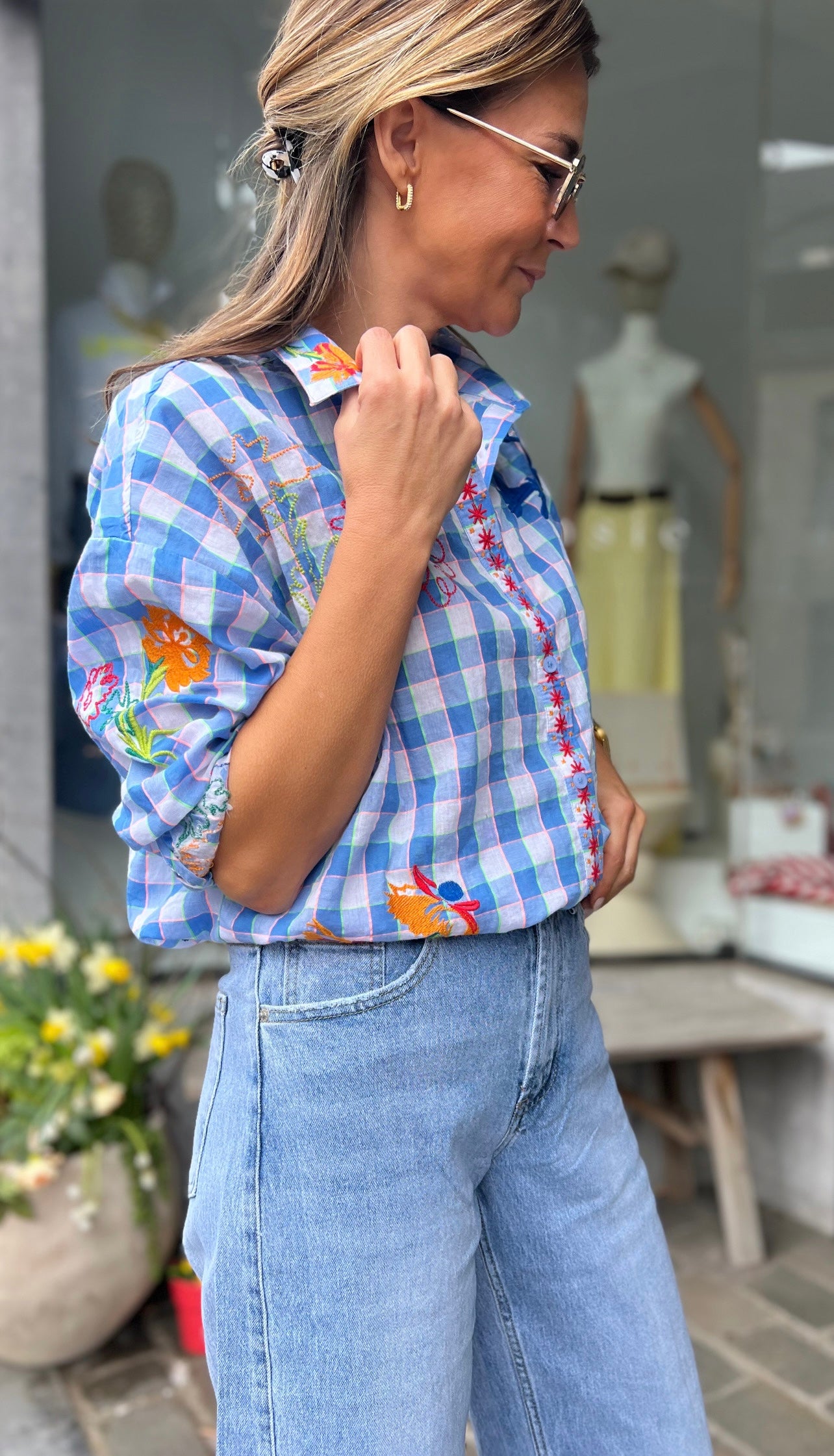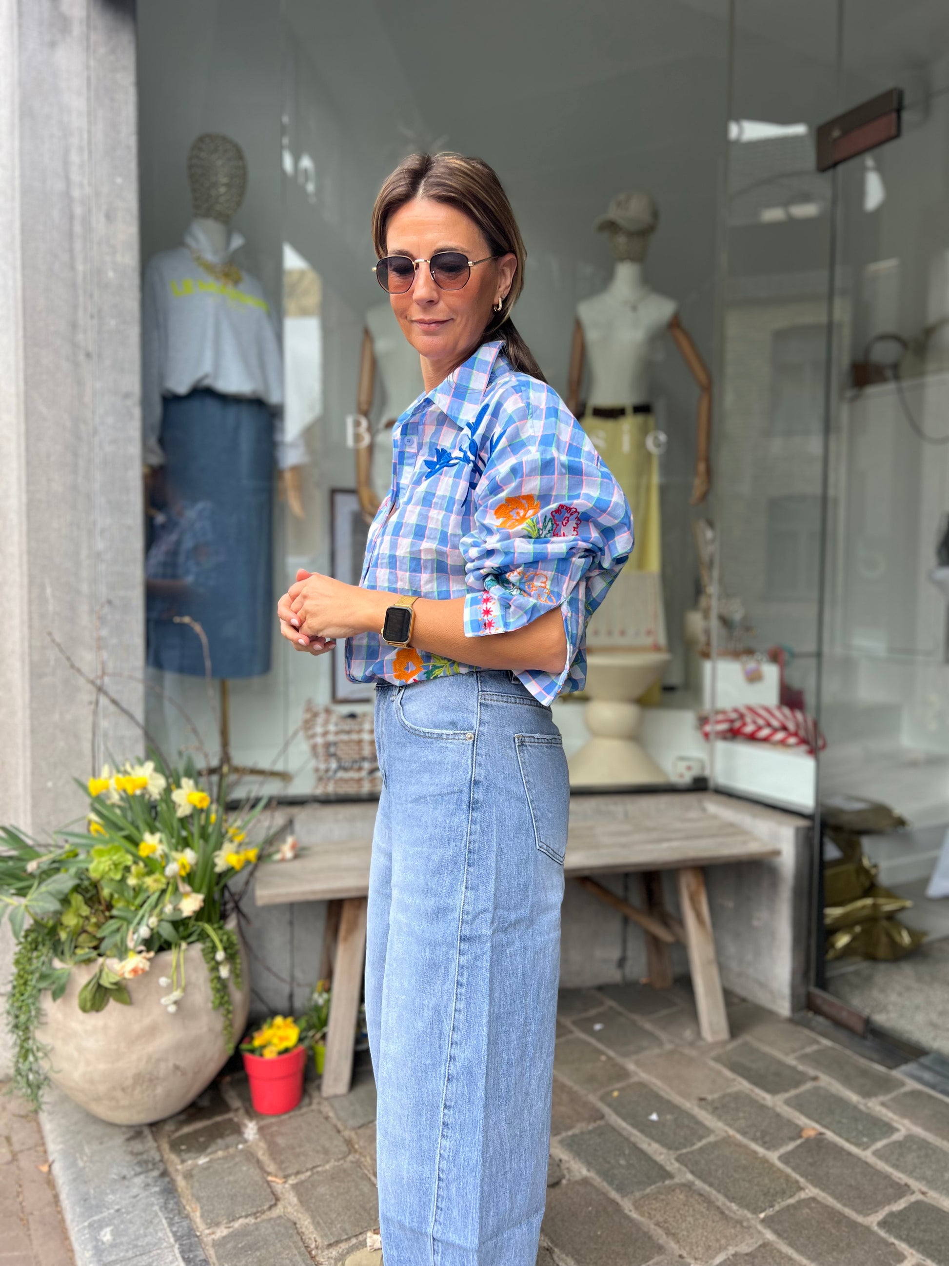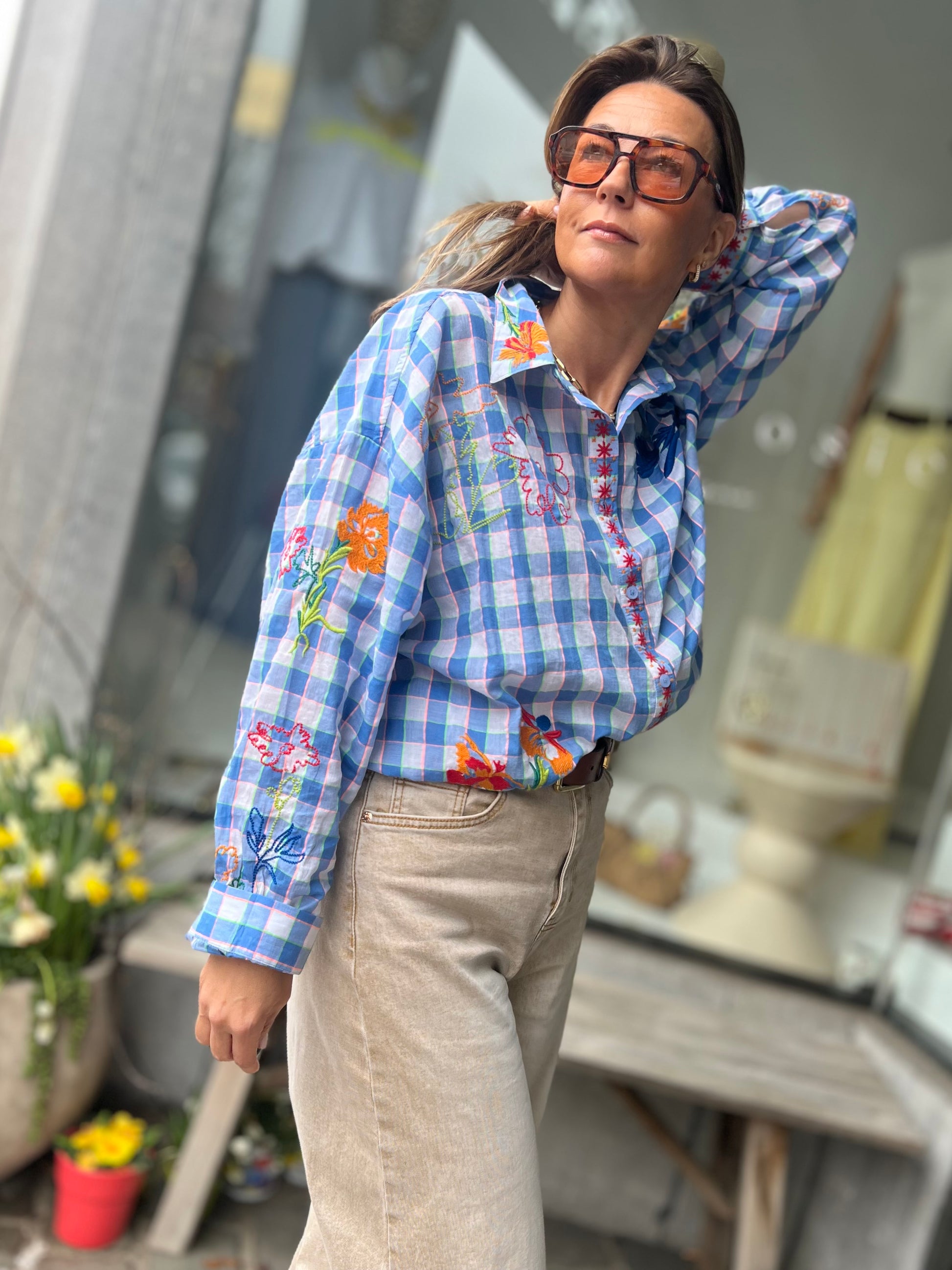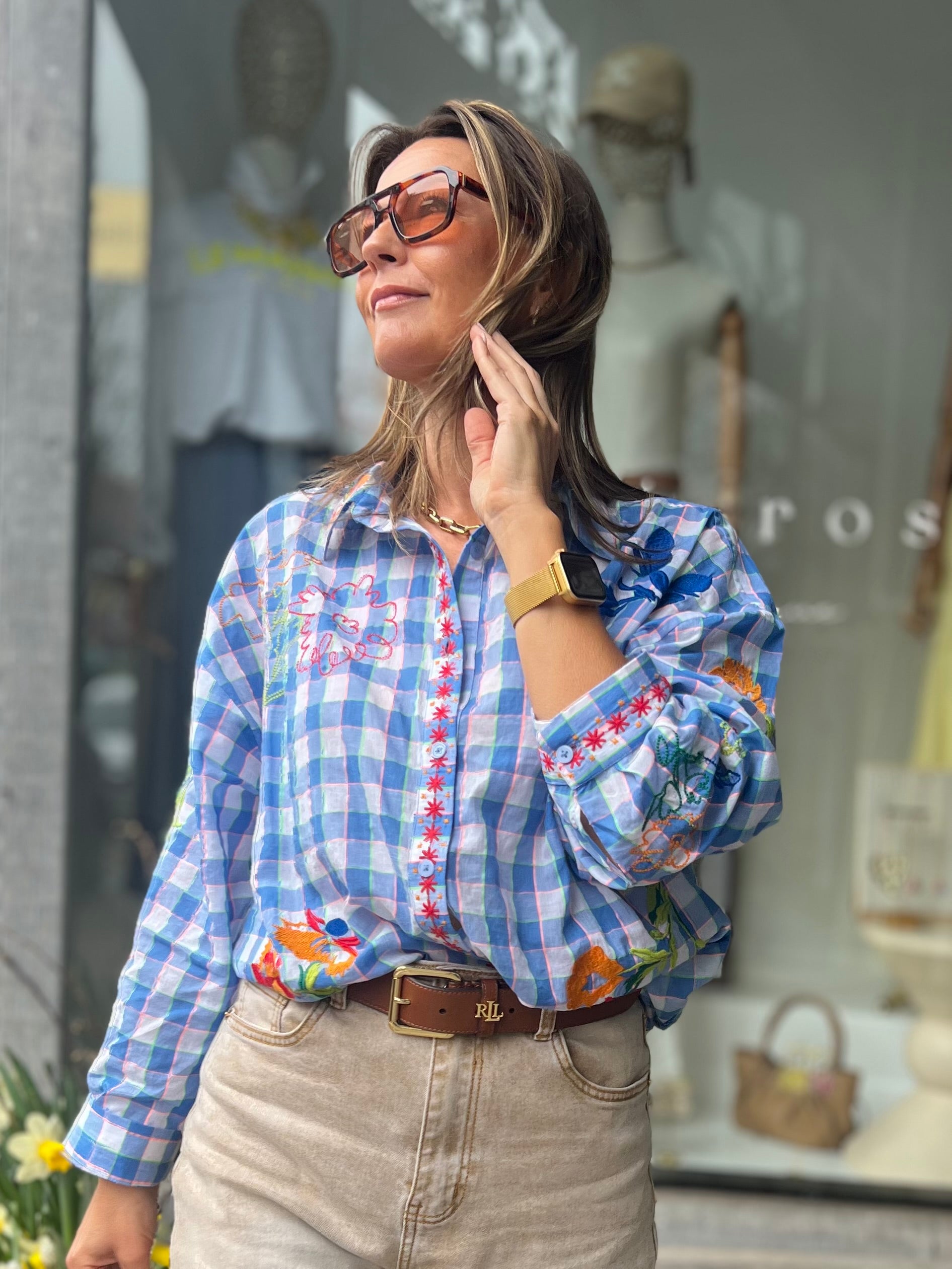 Hoe mooi is deze blauw/witte ruitmotief blouse met felle details en kleurrijke borduursels. Check de speelse details zoals het bloemetje op de kraag 😉🧡