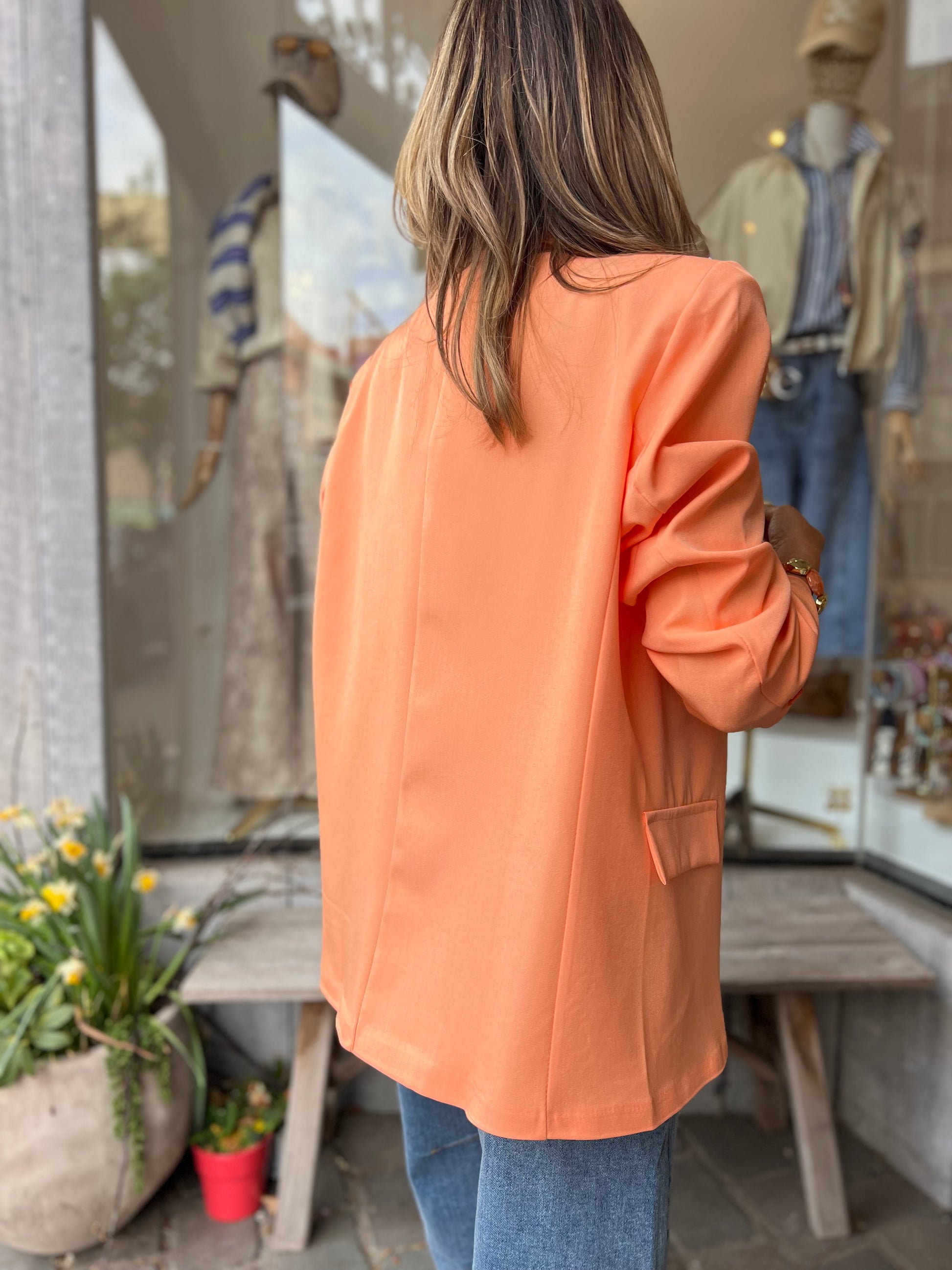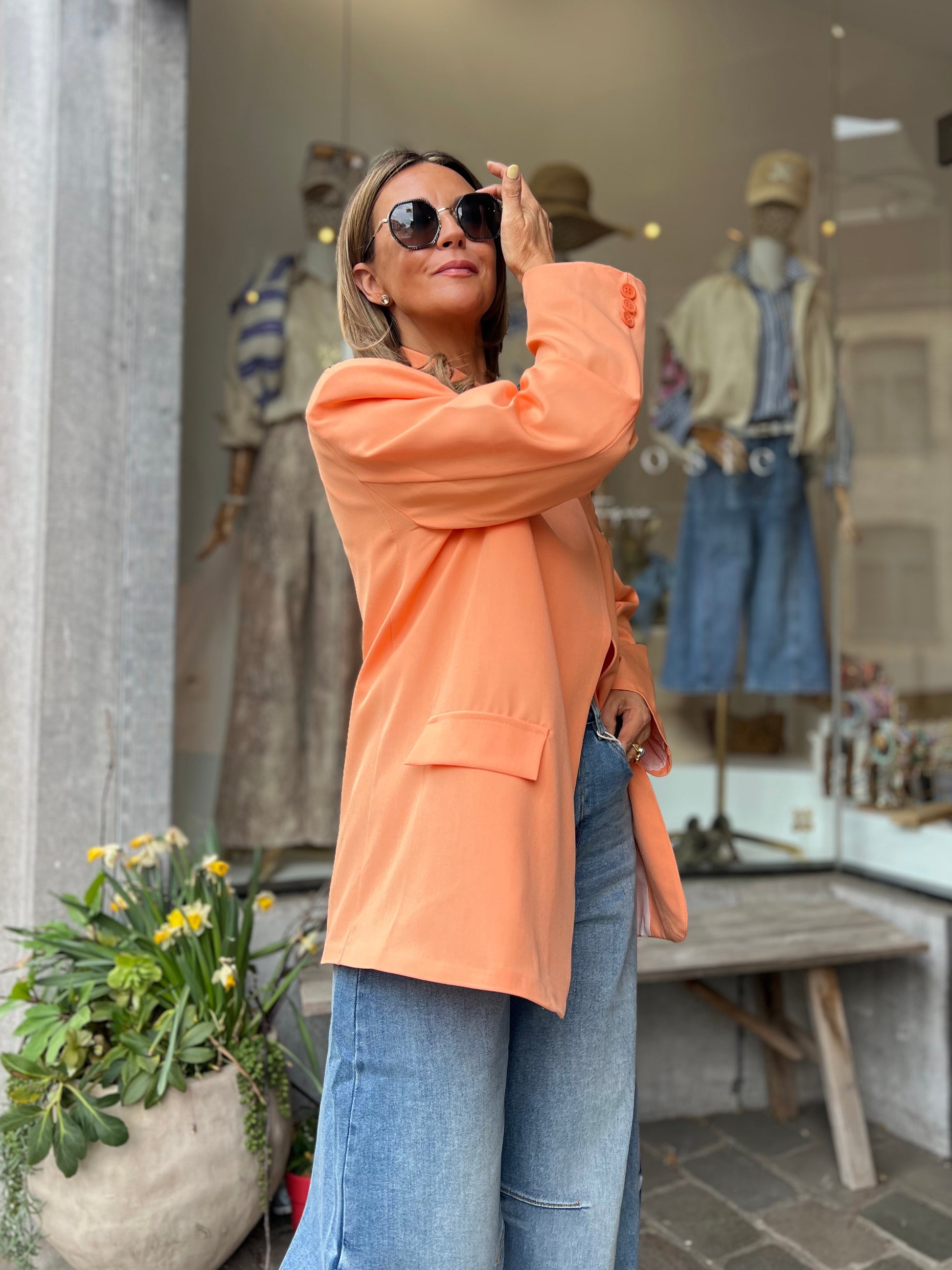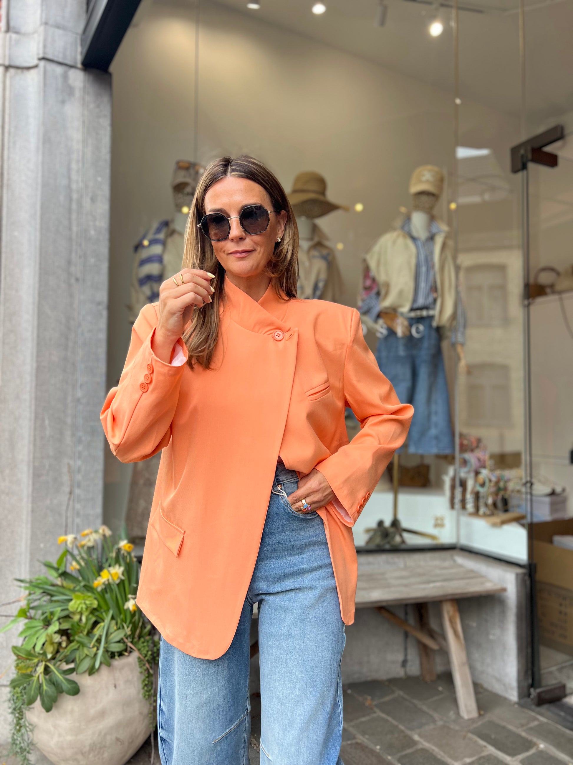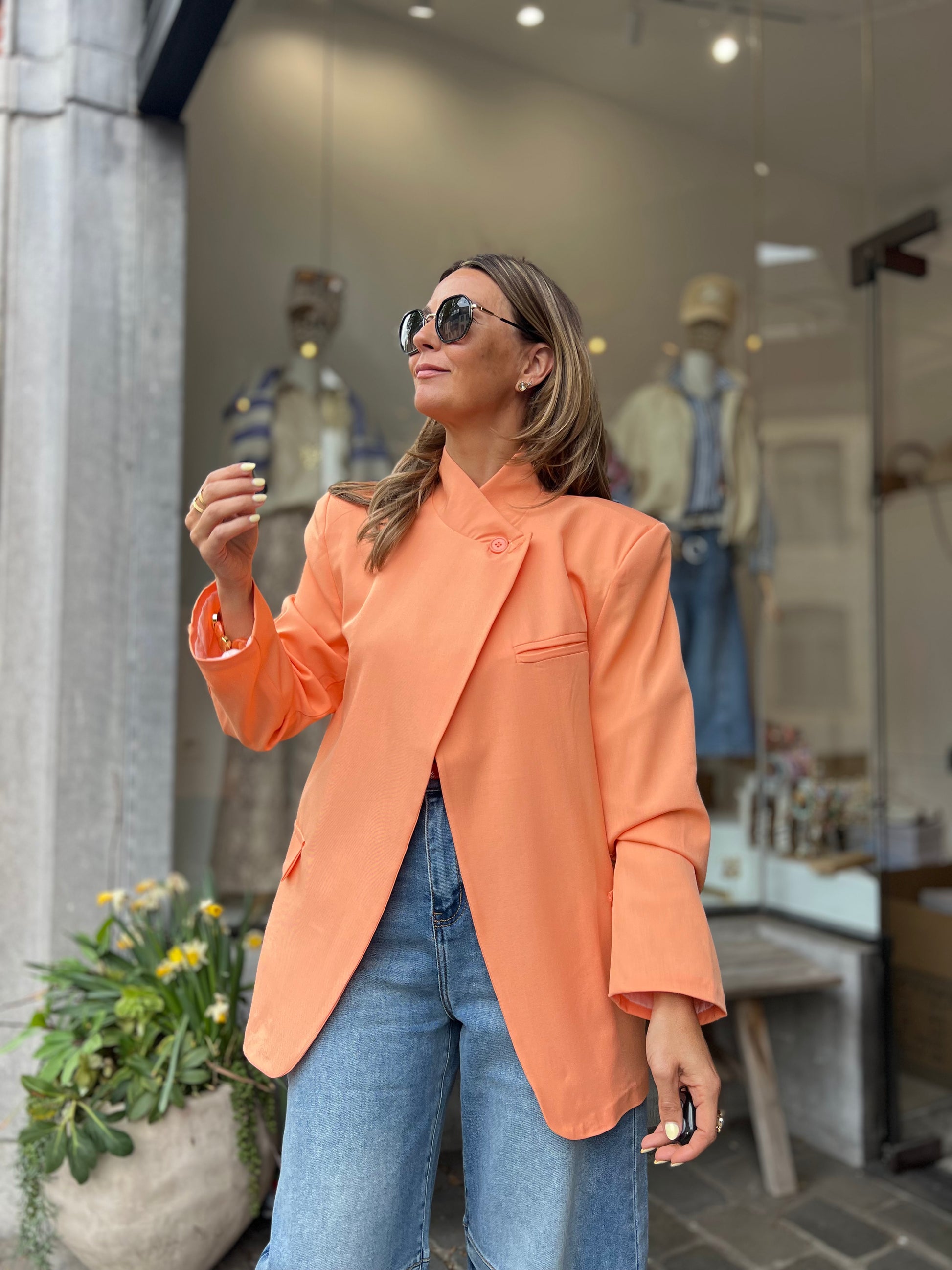 Zalmoranje blazer, helemaal trendy met de schuine knoop bovenaan of draag deze op de klassieke way en draai het kraagje om.