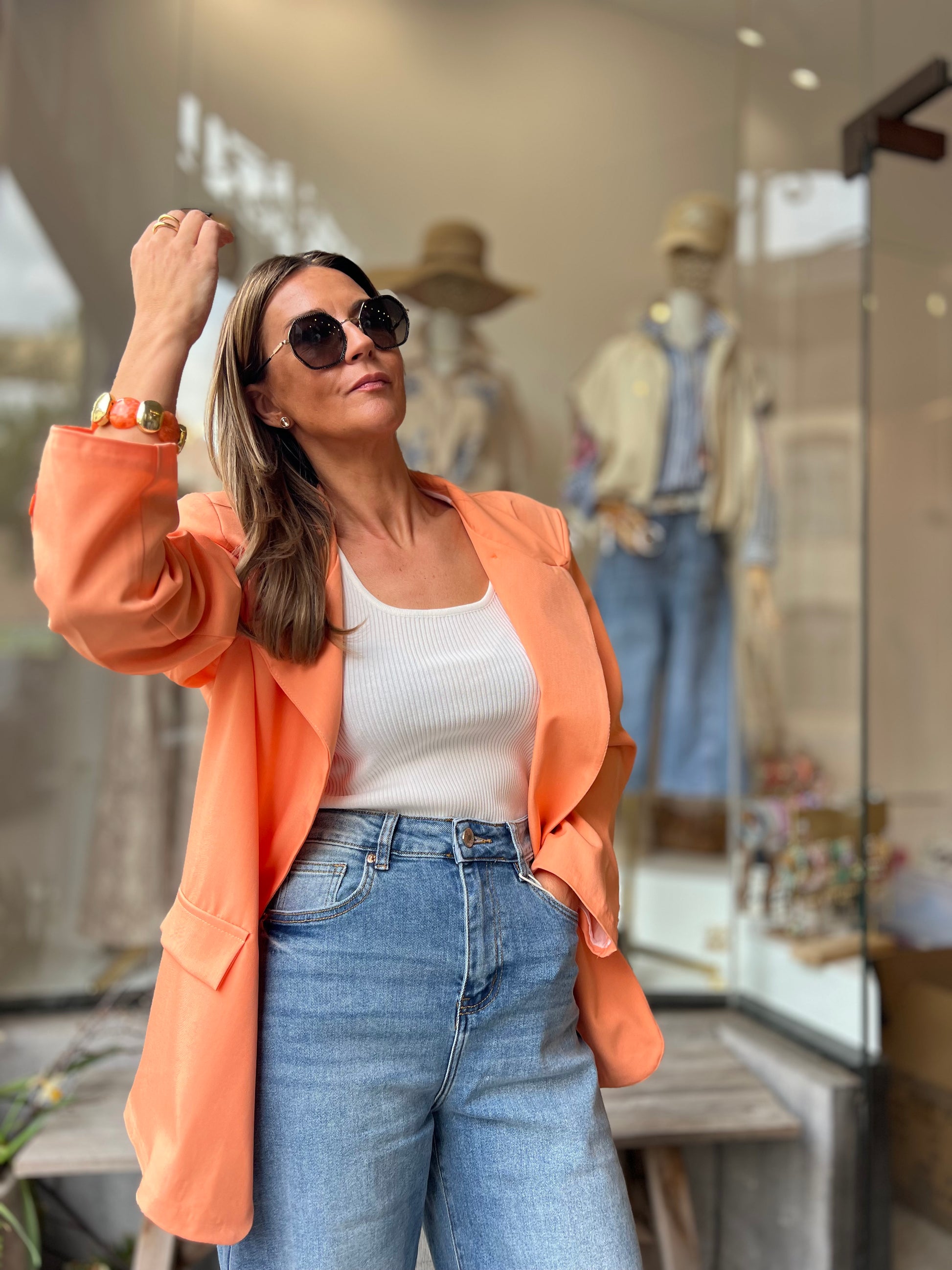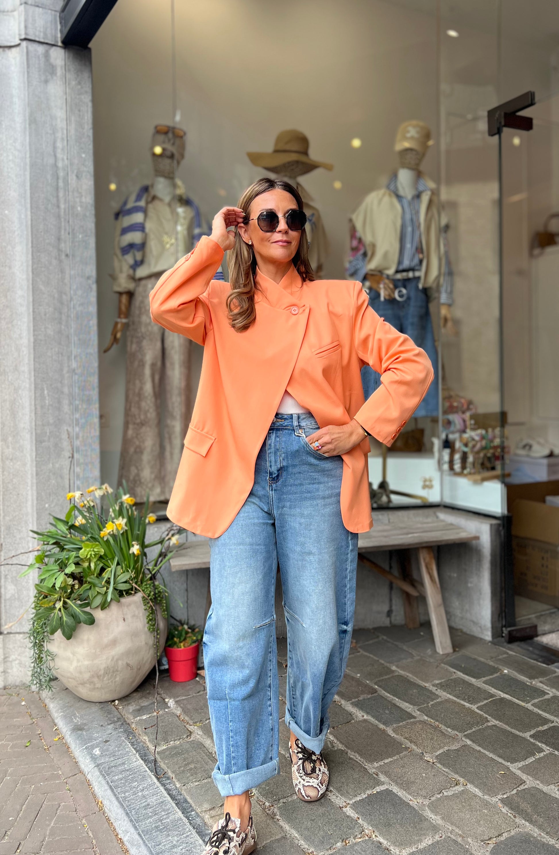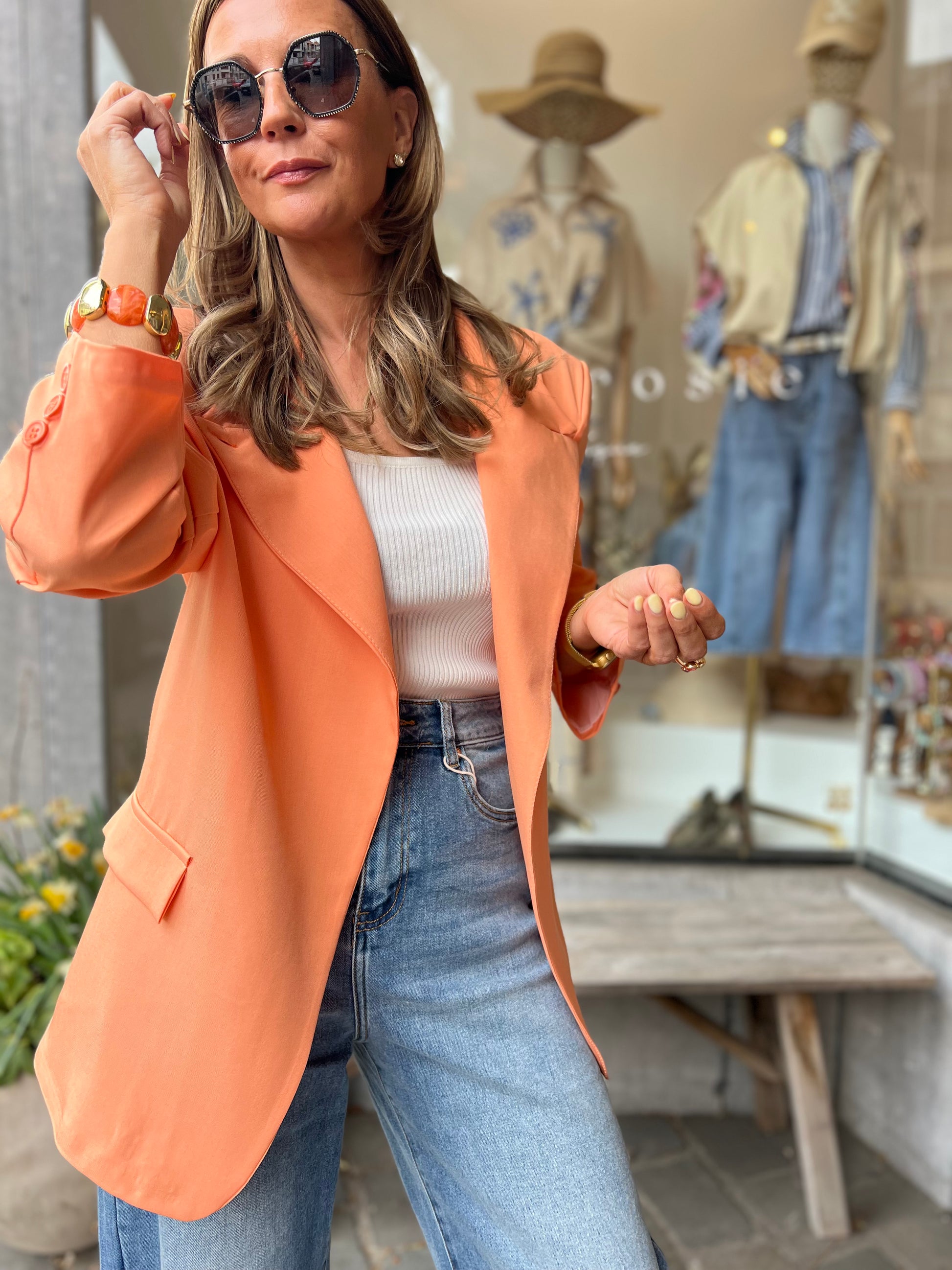 Zalmoranje blazer, helemaal trendy met de schuine knoop bovenaan of draag deze op de klassieke way en draai het kraagje om.