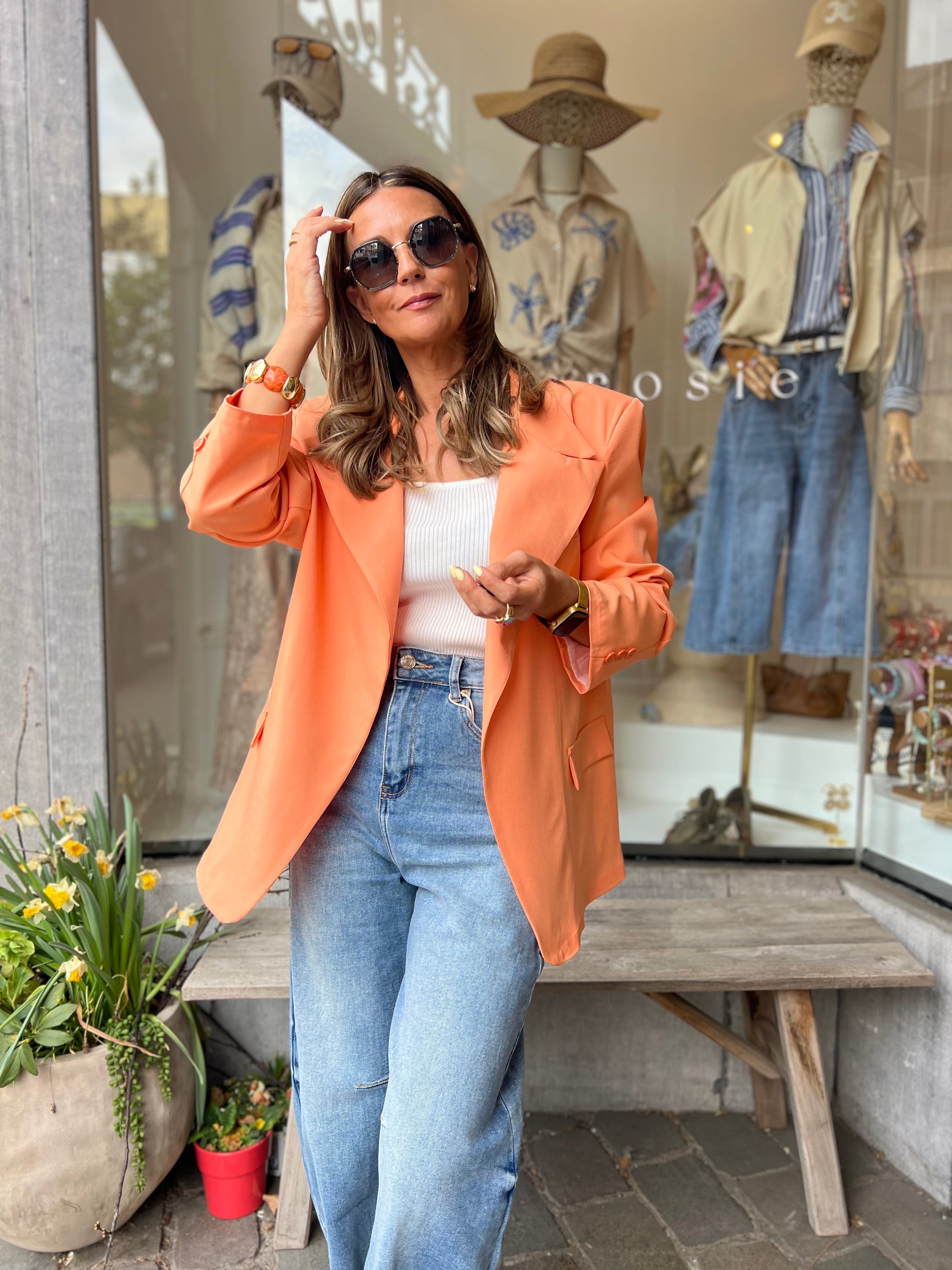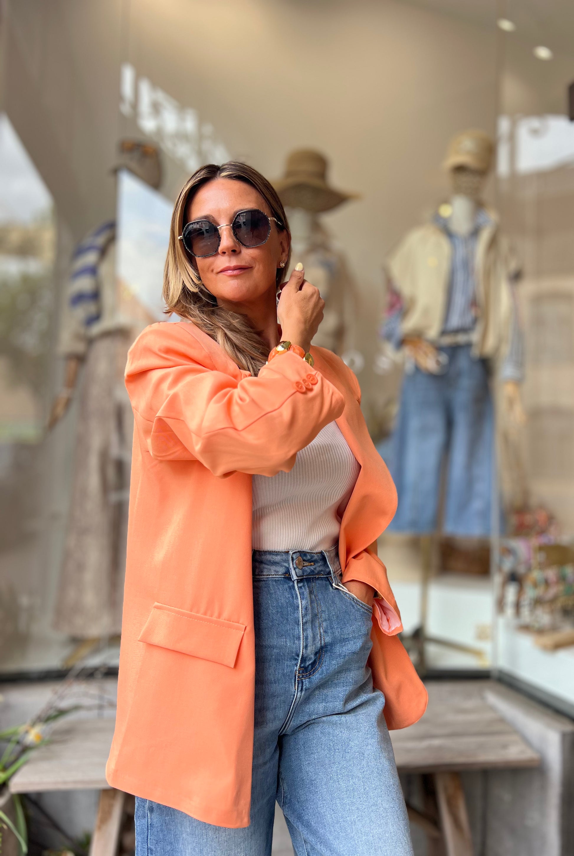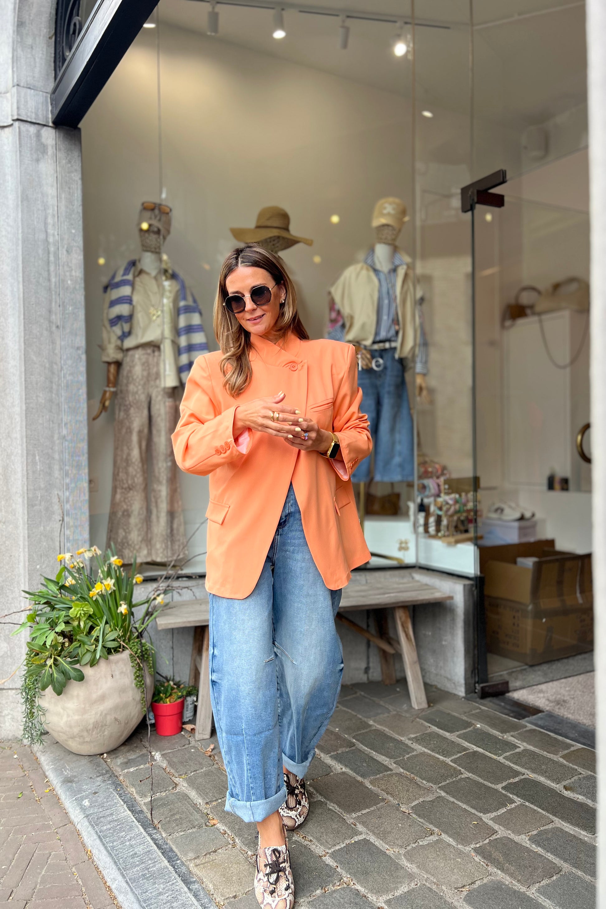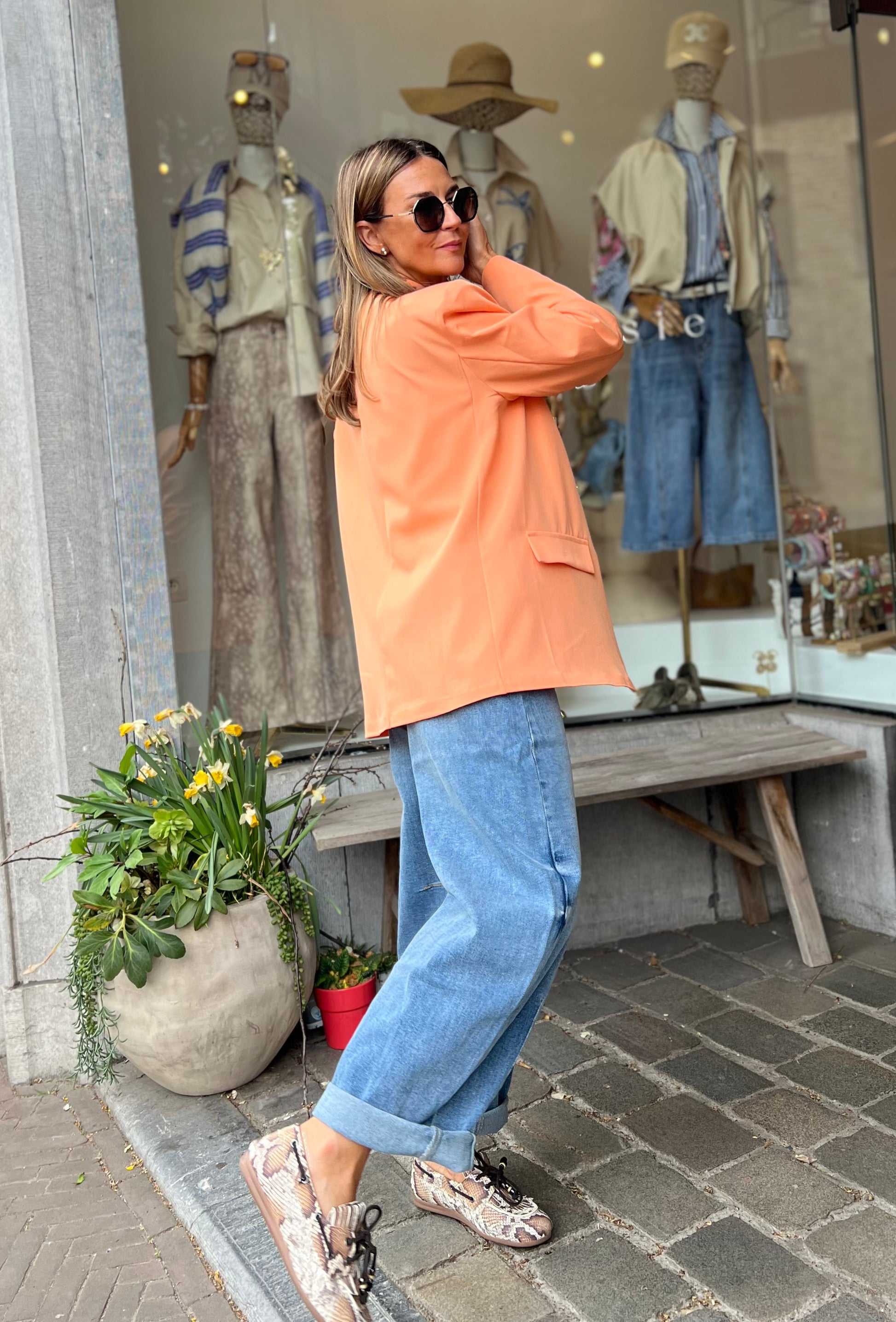 Zalmoranje blazer, helemaal trendy met de schuine knoop bovenaan of draag deze op de klassieke way en draai het kraagje om.