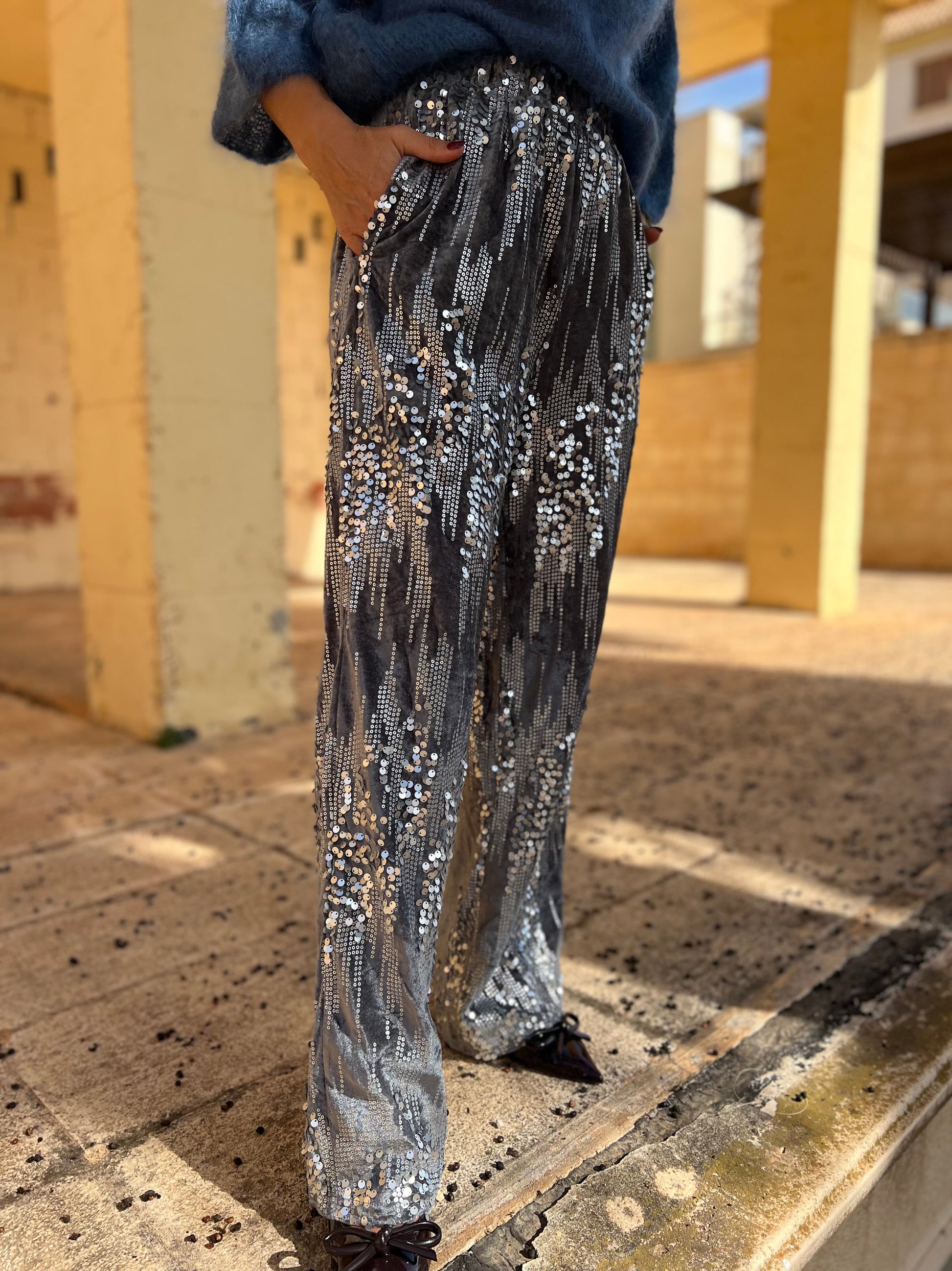 Broek in een zachte velvet stof, versierd met kleine en grotere pailletten in een zigzagpatroon.
