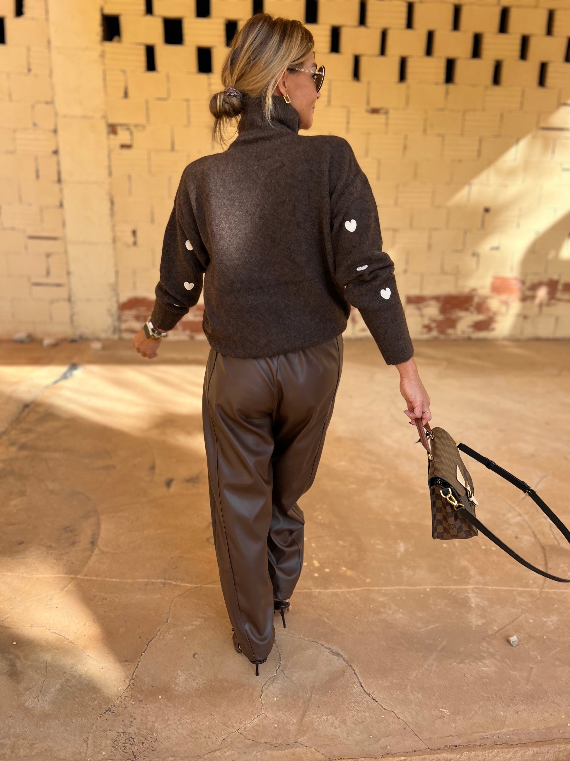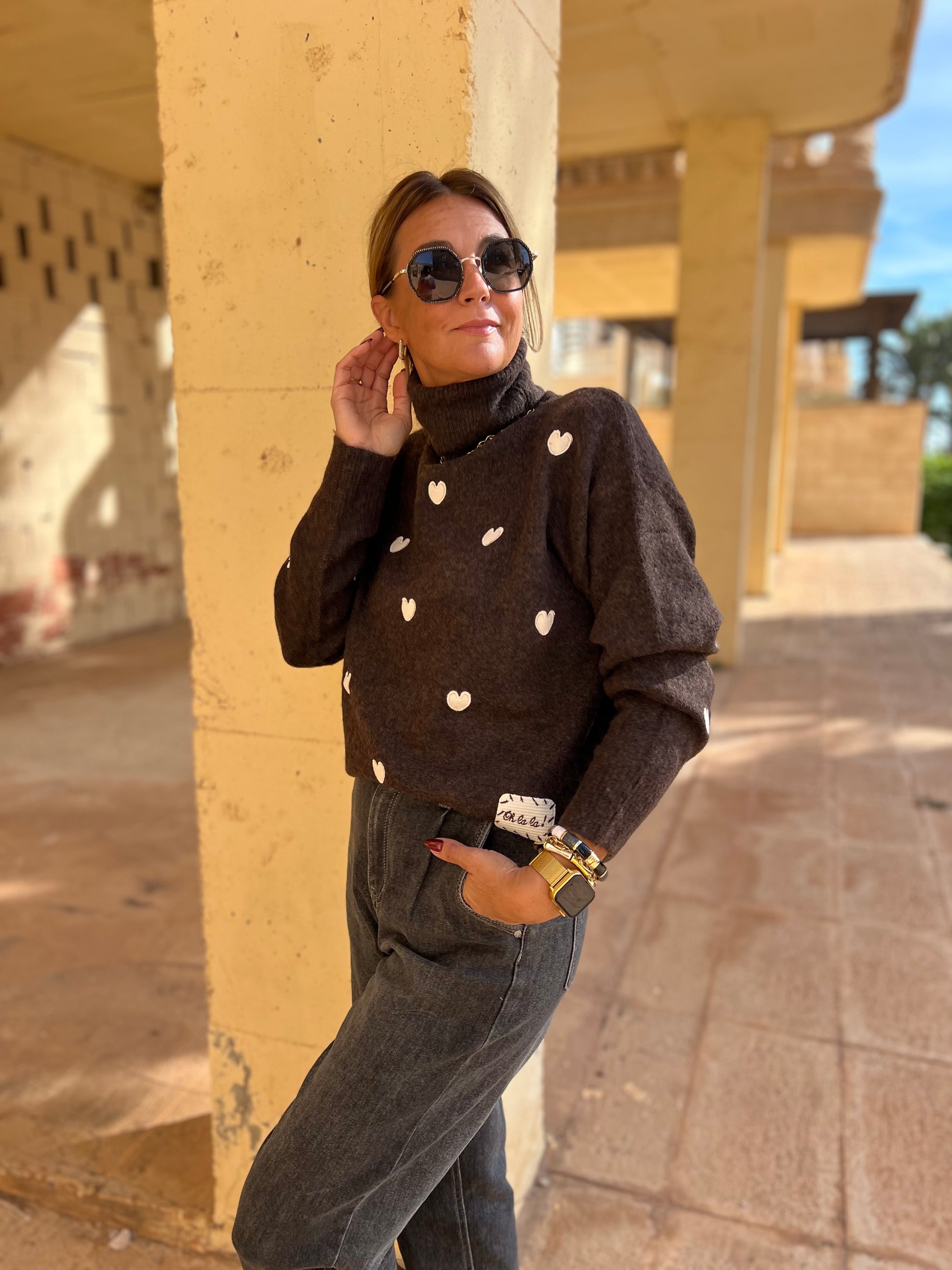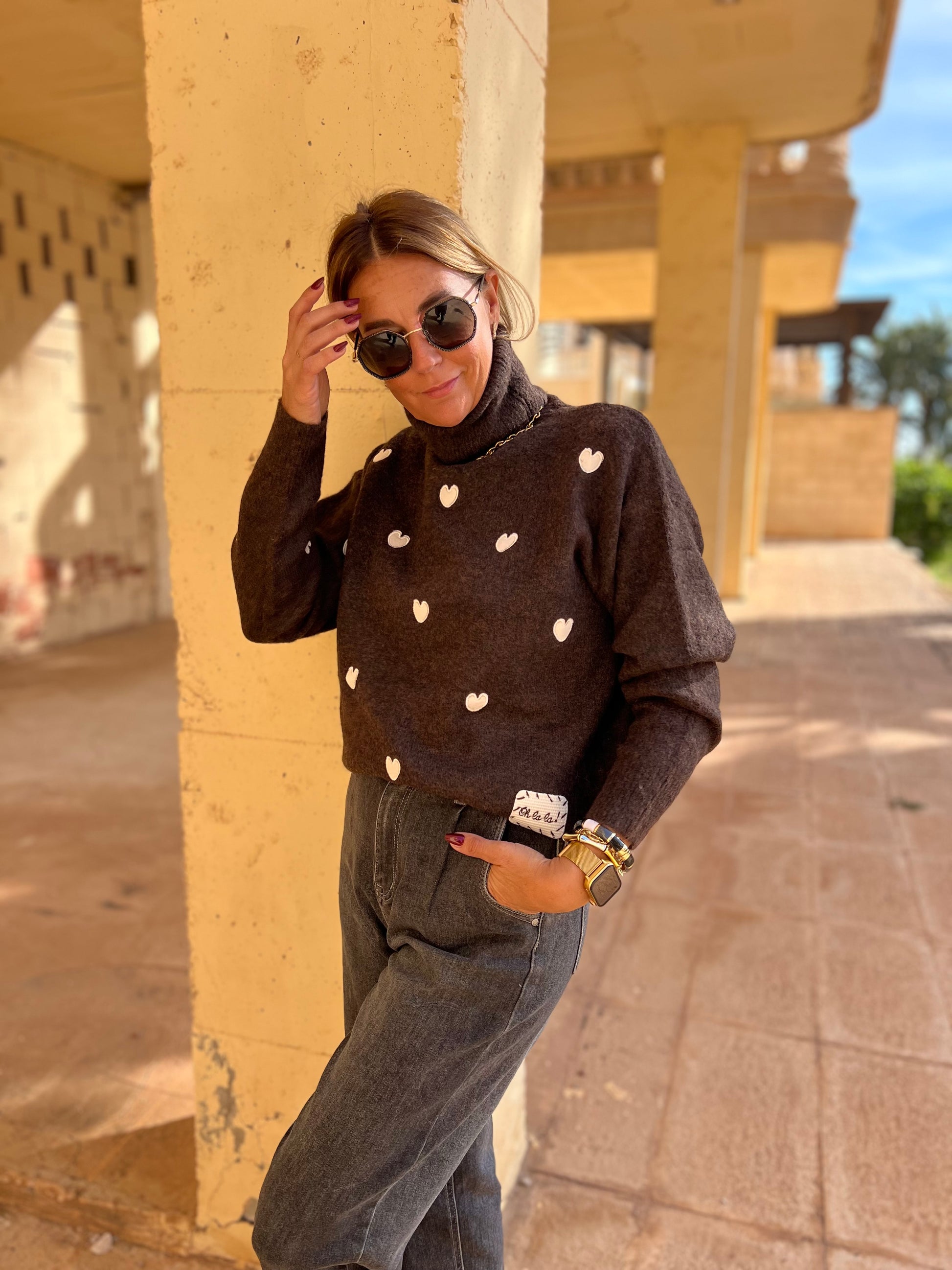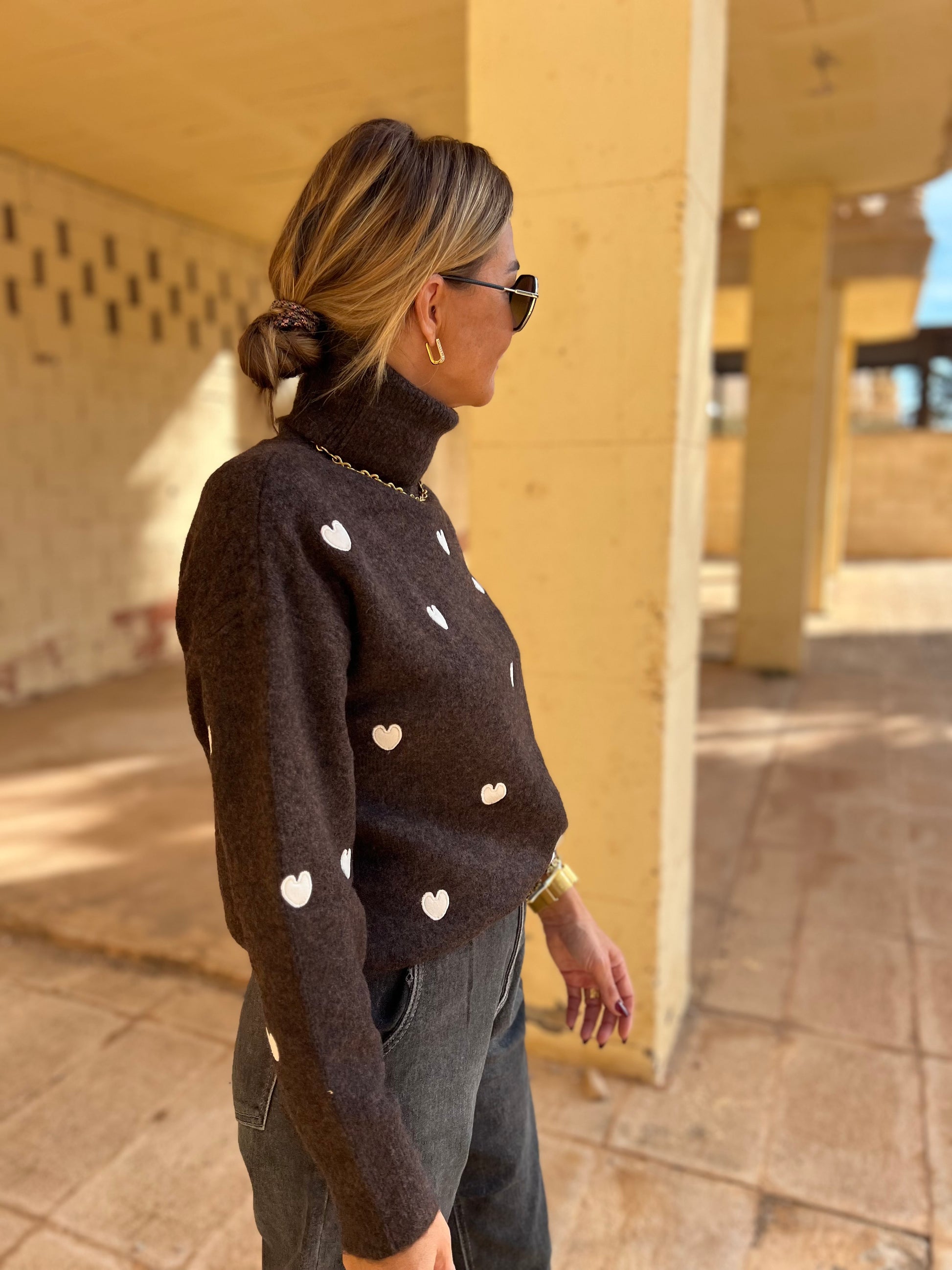 Pull met rolkraag, versierd met contrasterende witte hartjes vooraan en op de mouwen.