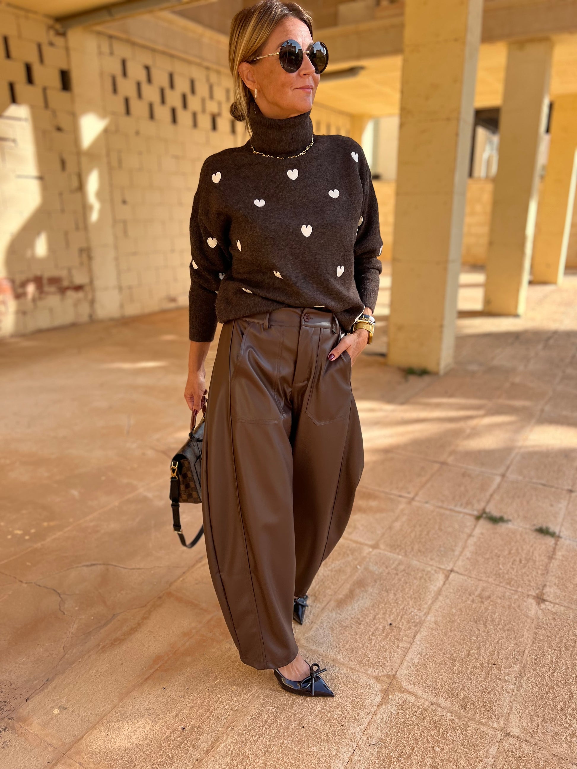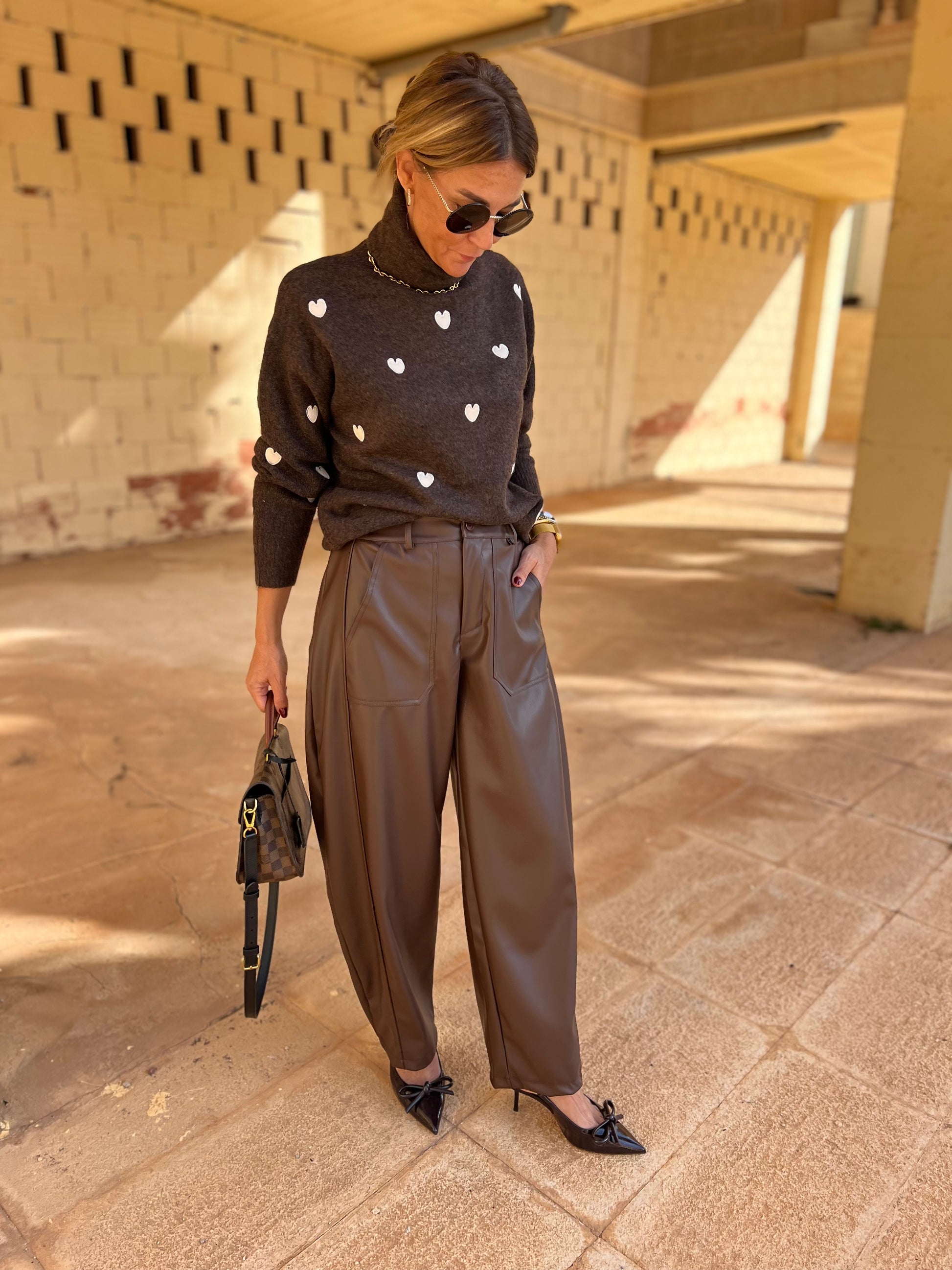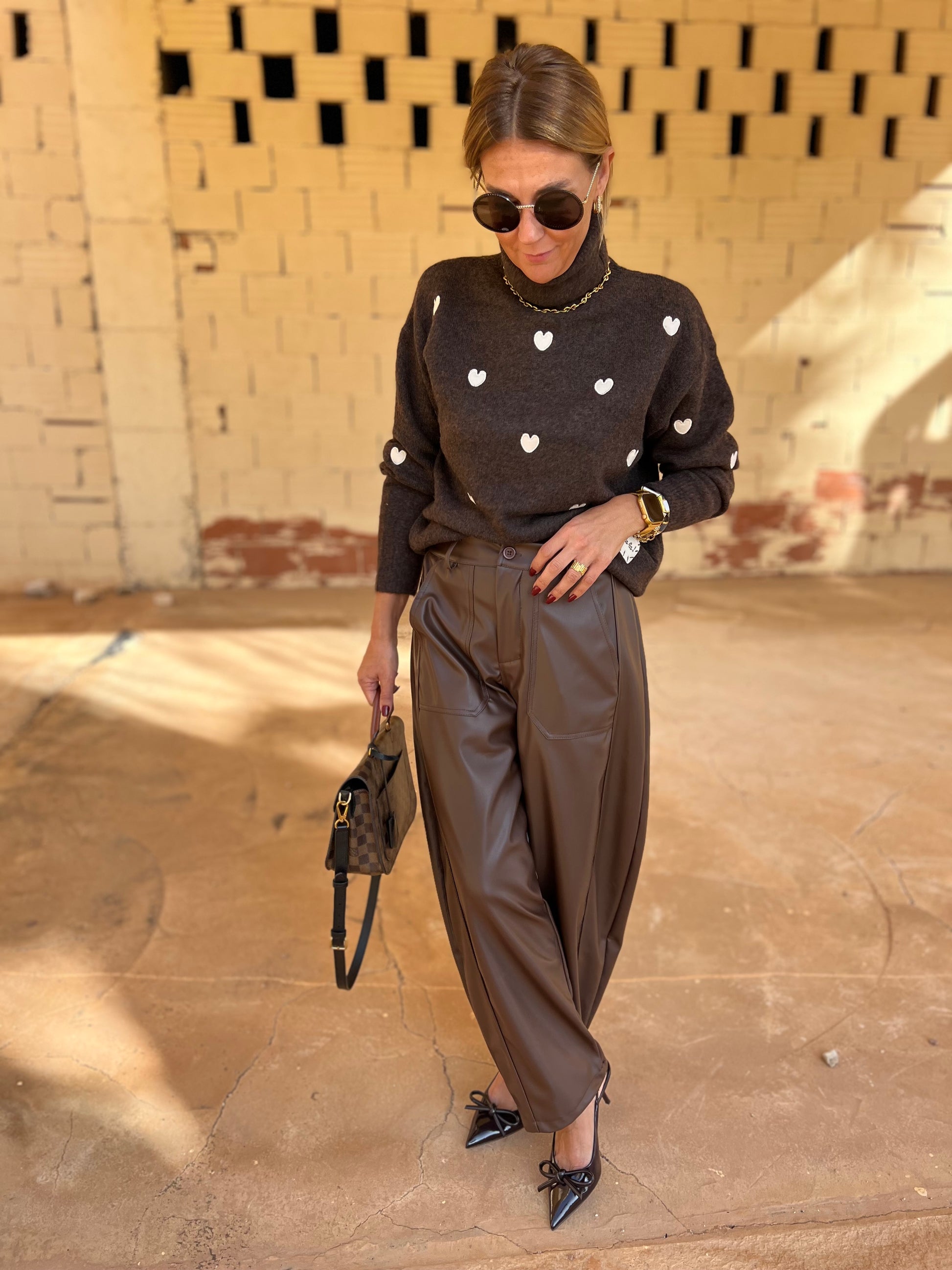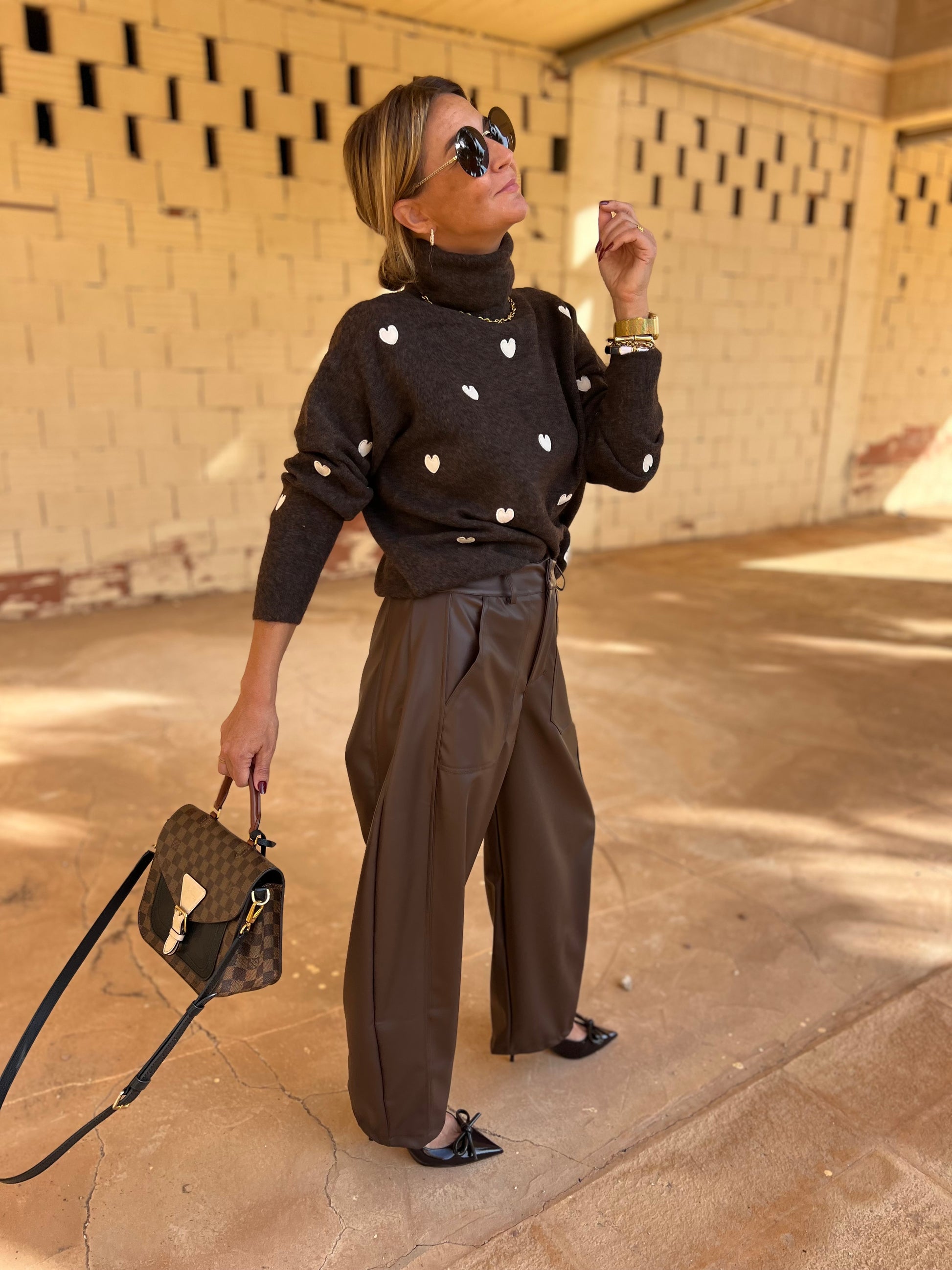 Pull met rolkraag, versierd met contrasterende witte hartjes vooraan en op de mouwen.