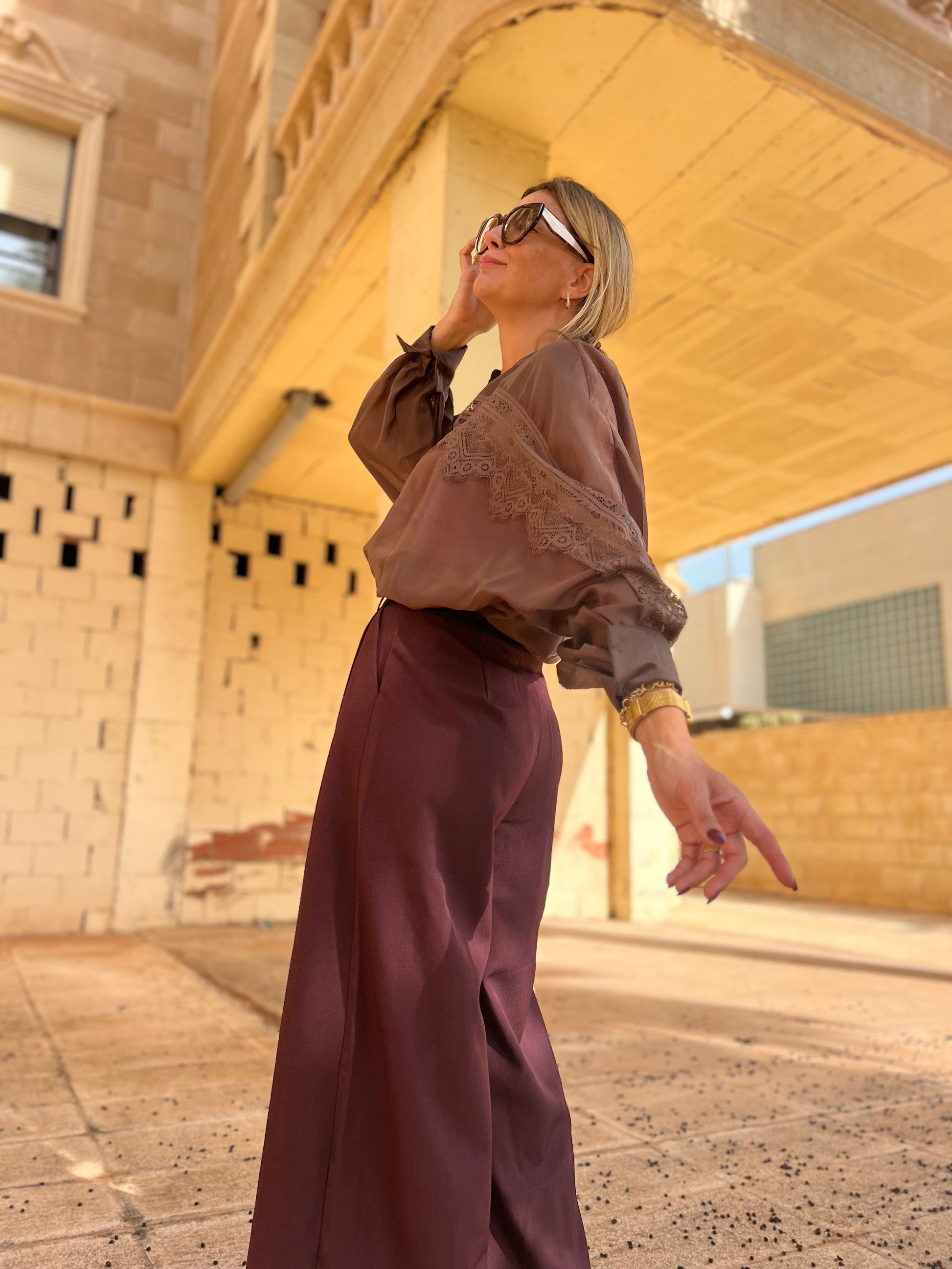 Blouse afgewerkt met kanten details aan de mouwen en vooraan.