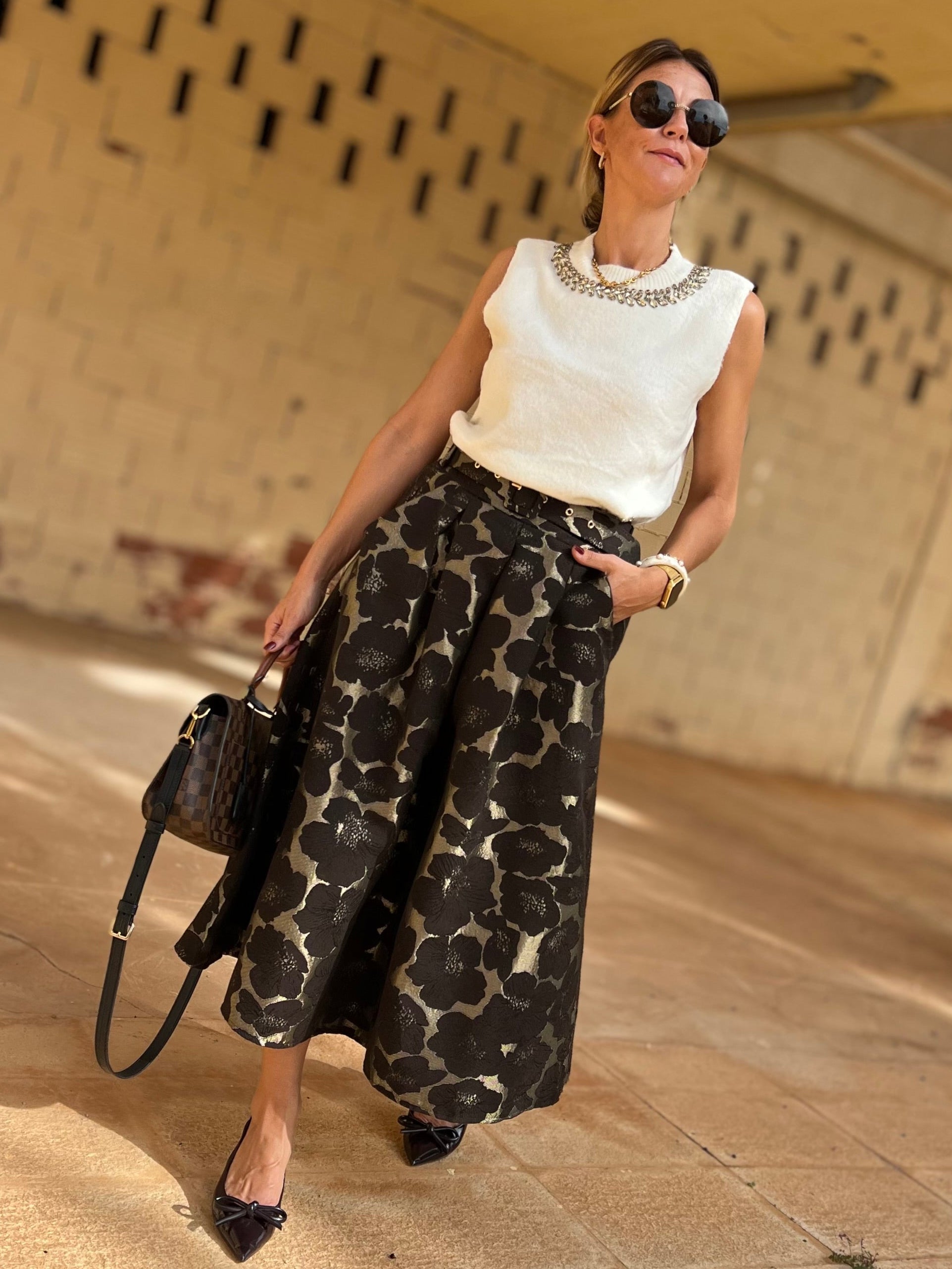 De rok heeft een verfijnd bloemenmotief in diepe bruine en gouden aardtinten.