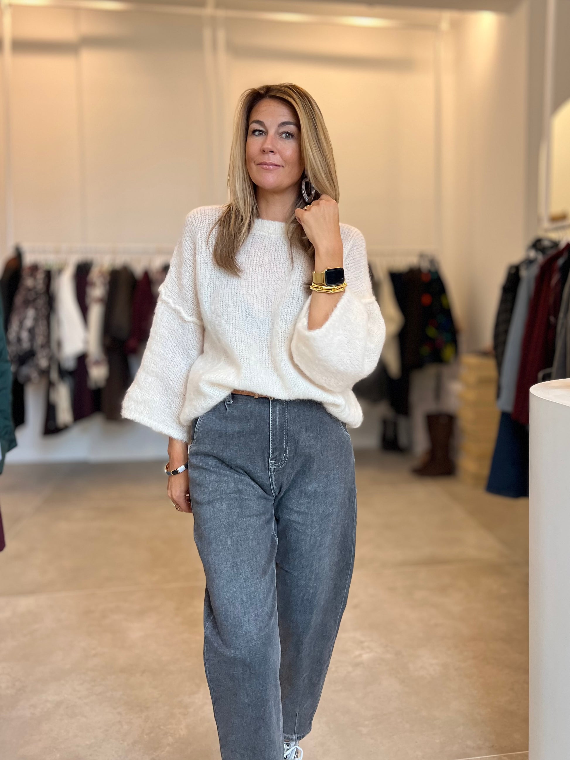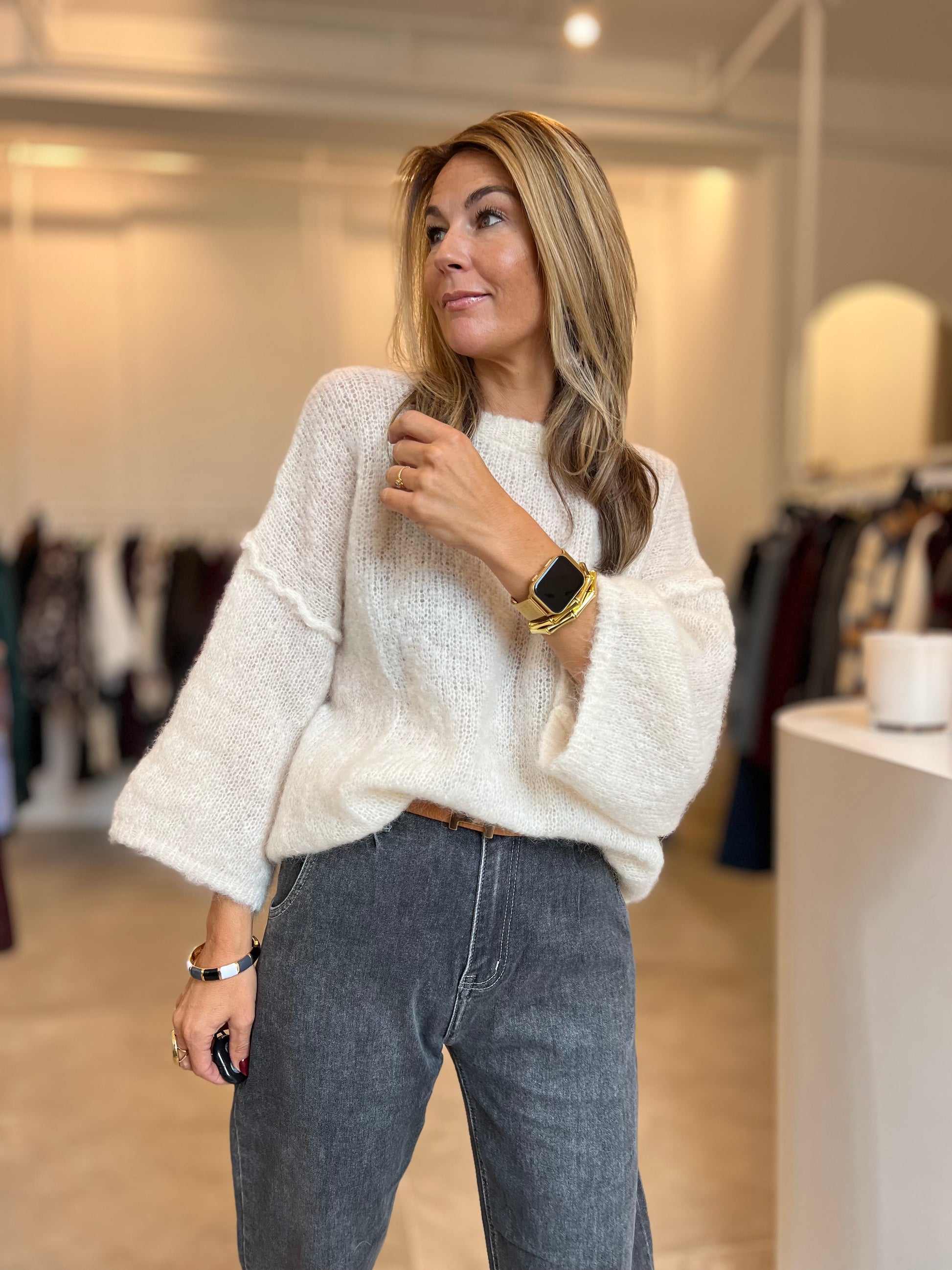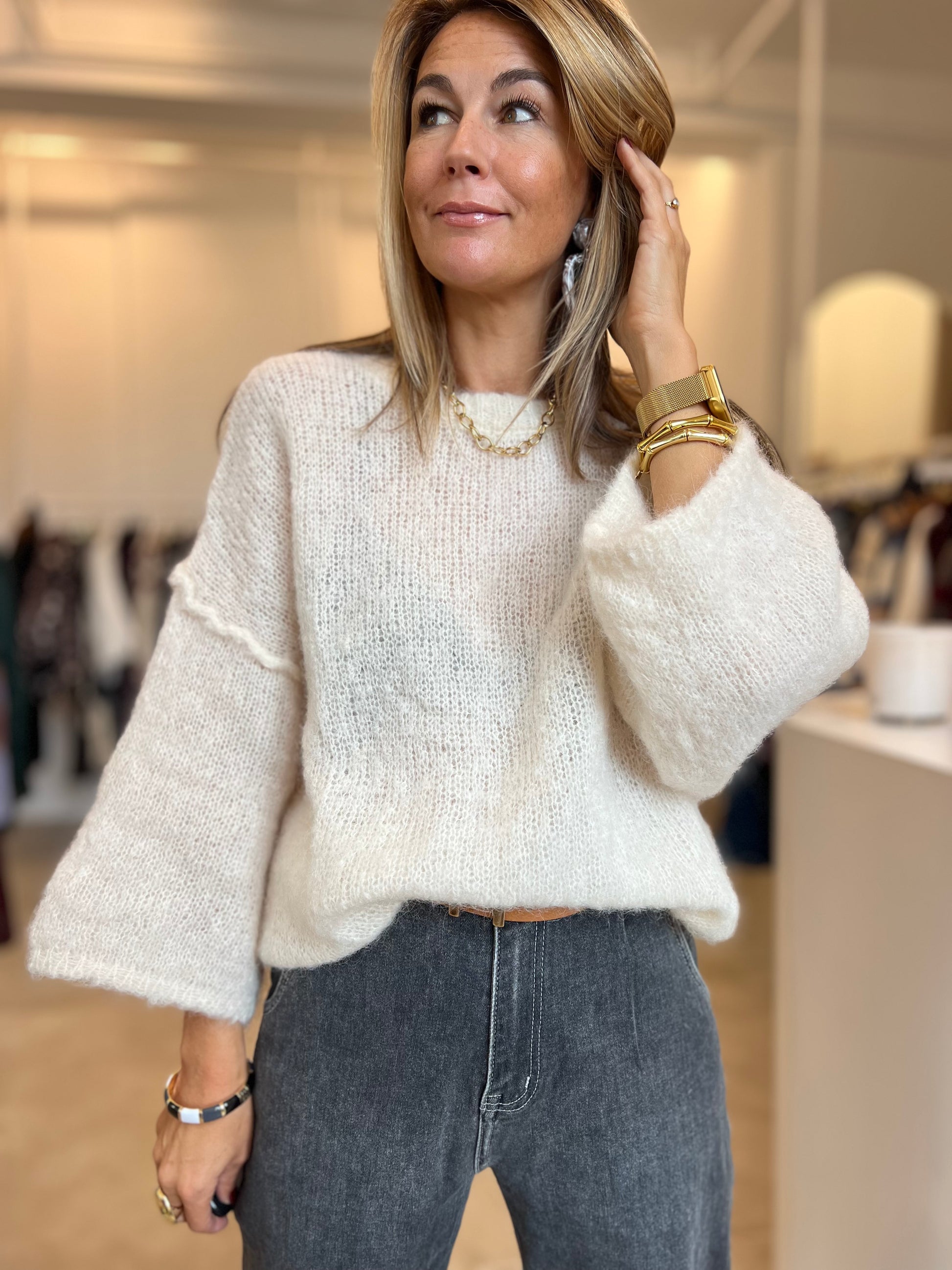 Een heerlijk zacht gebreide pull in mohair met ronde hals en wijde 3/4 mouwen.