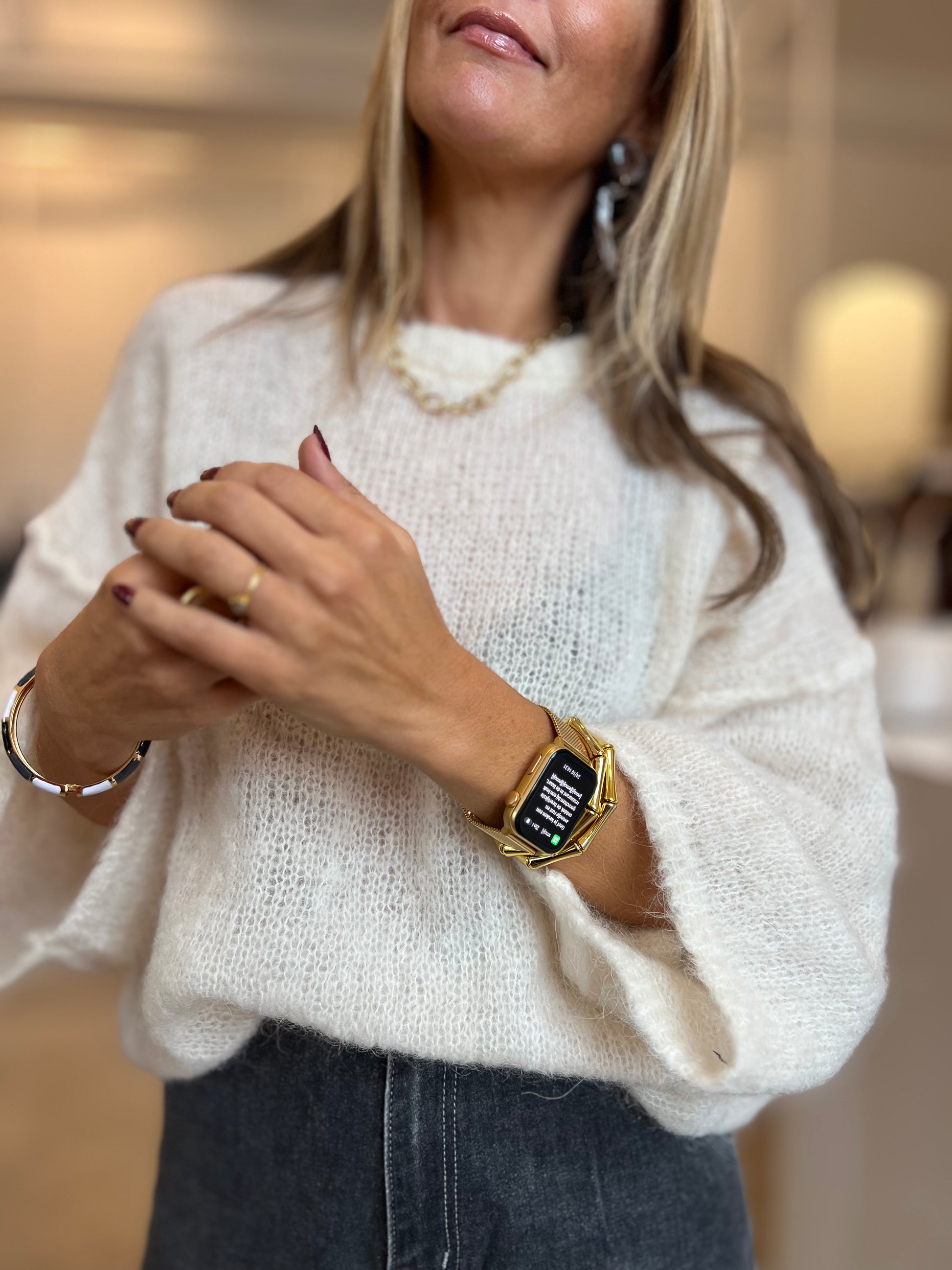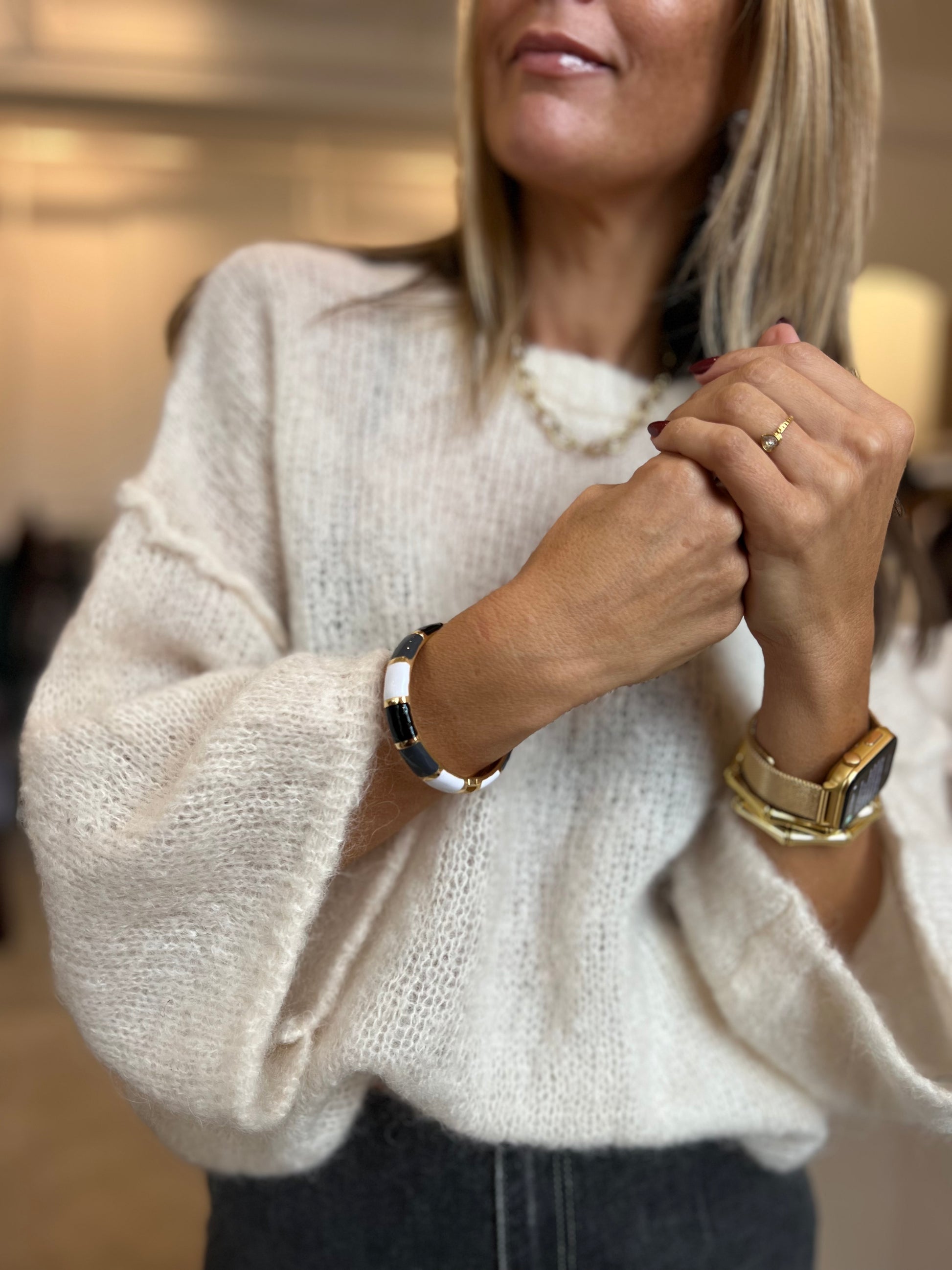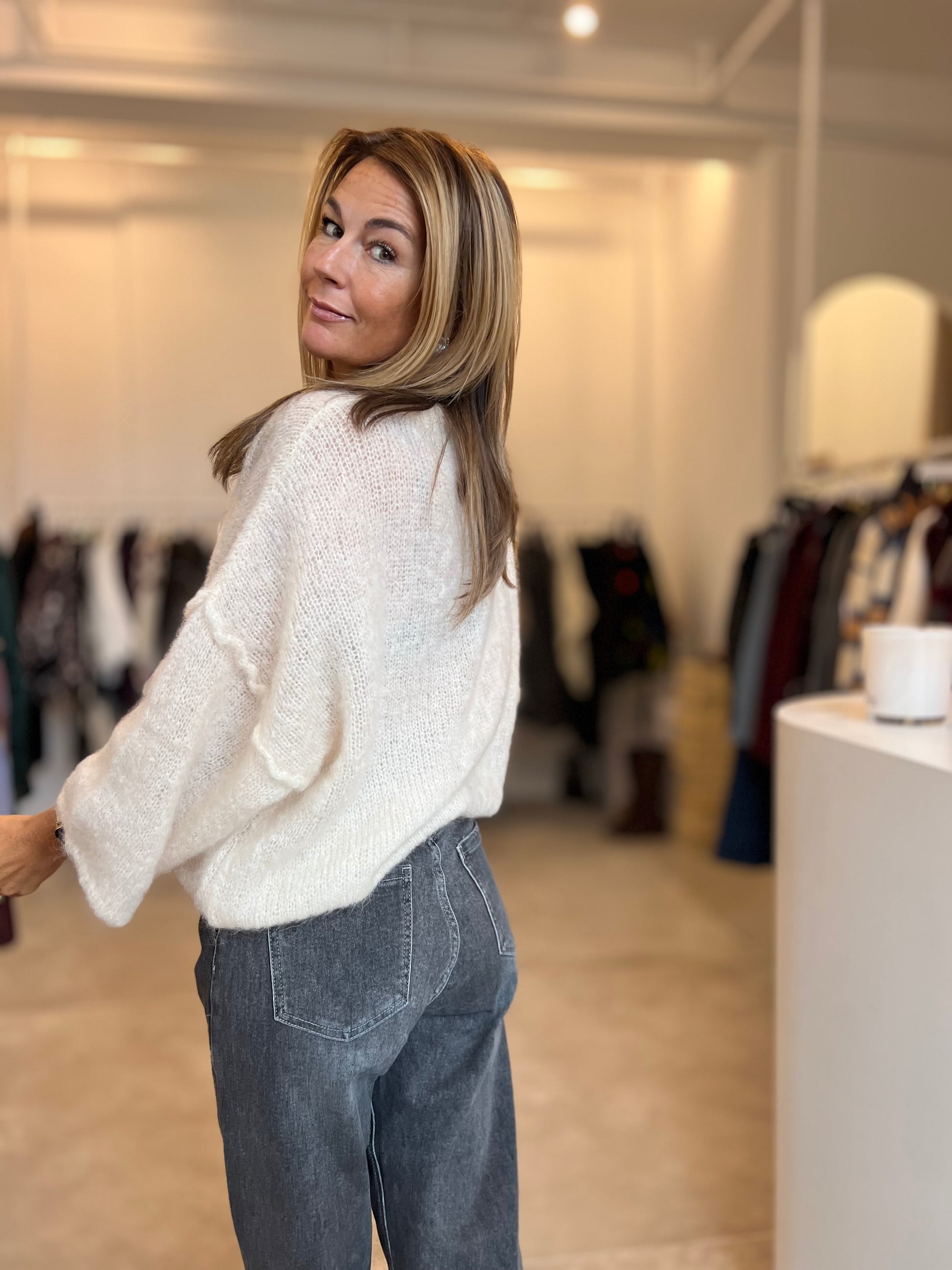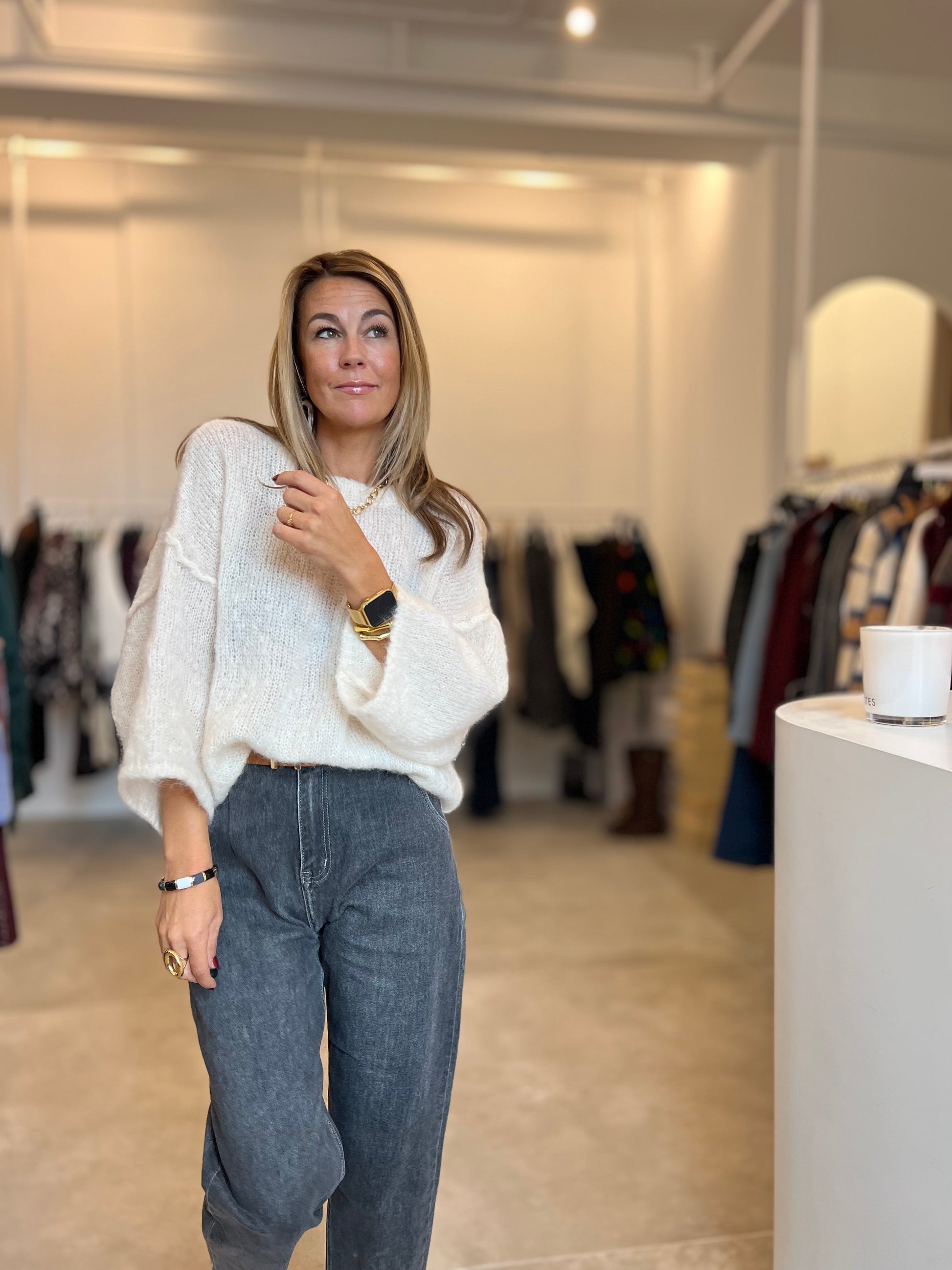 Een heerlijk zacht gebreide pull in mohair met ronde hals en wijde 3/4 mouwen.
