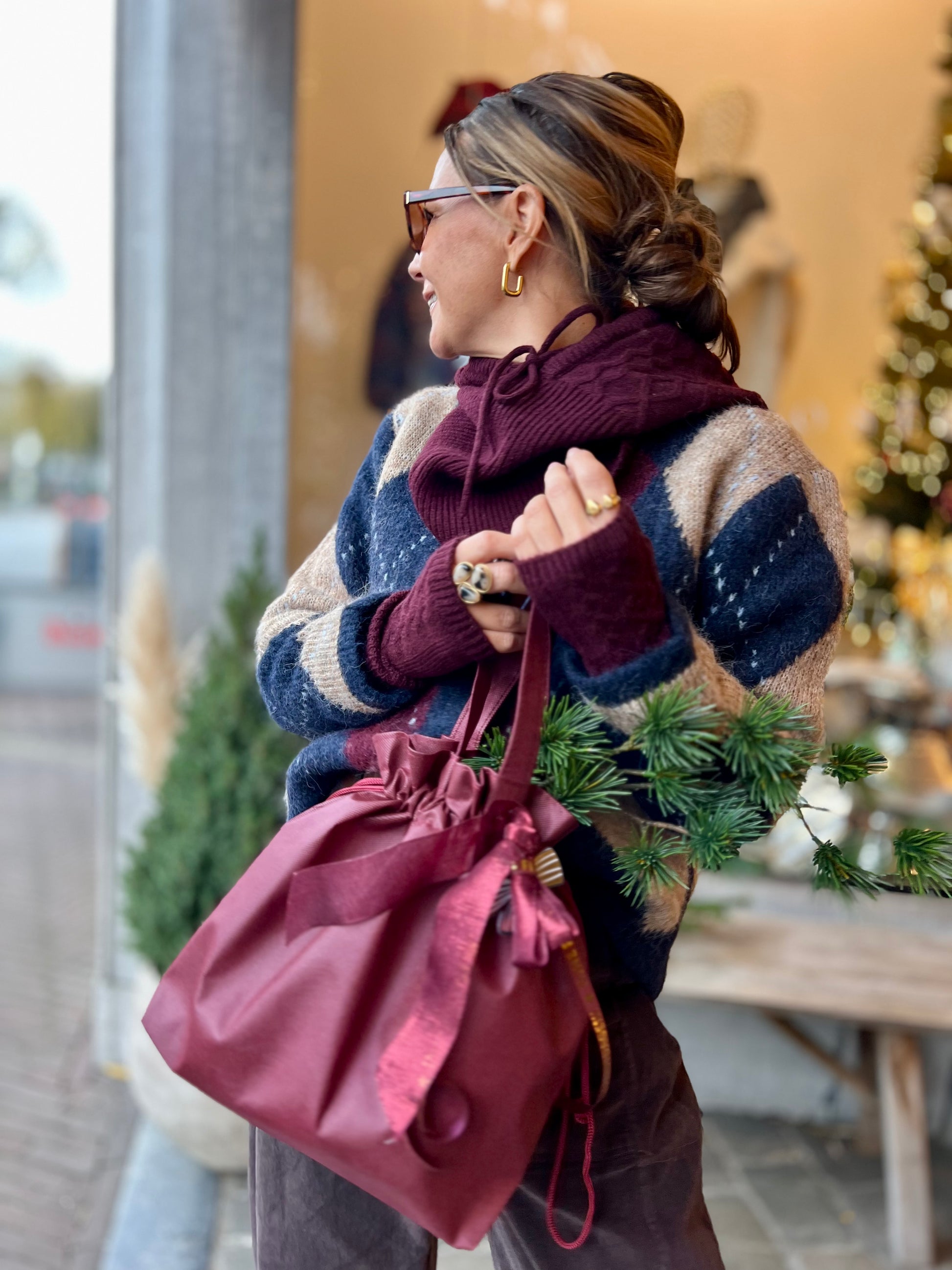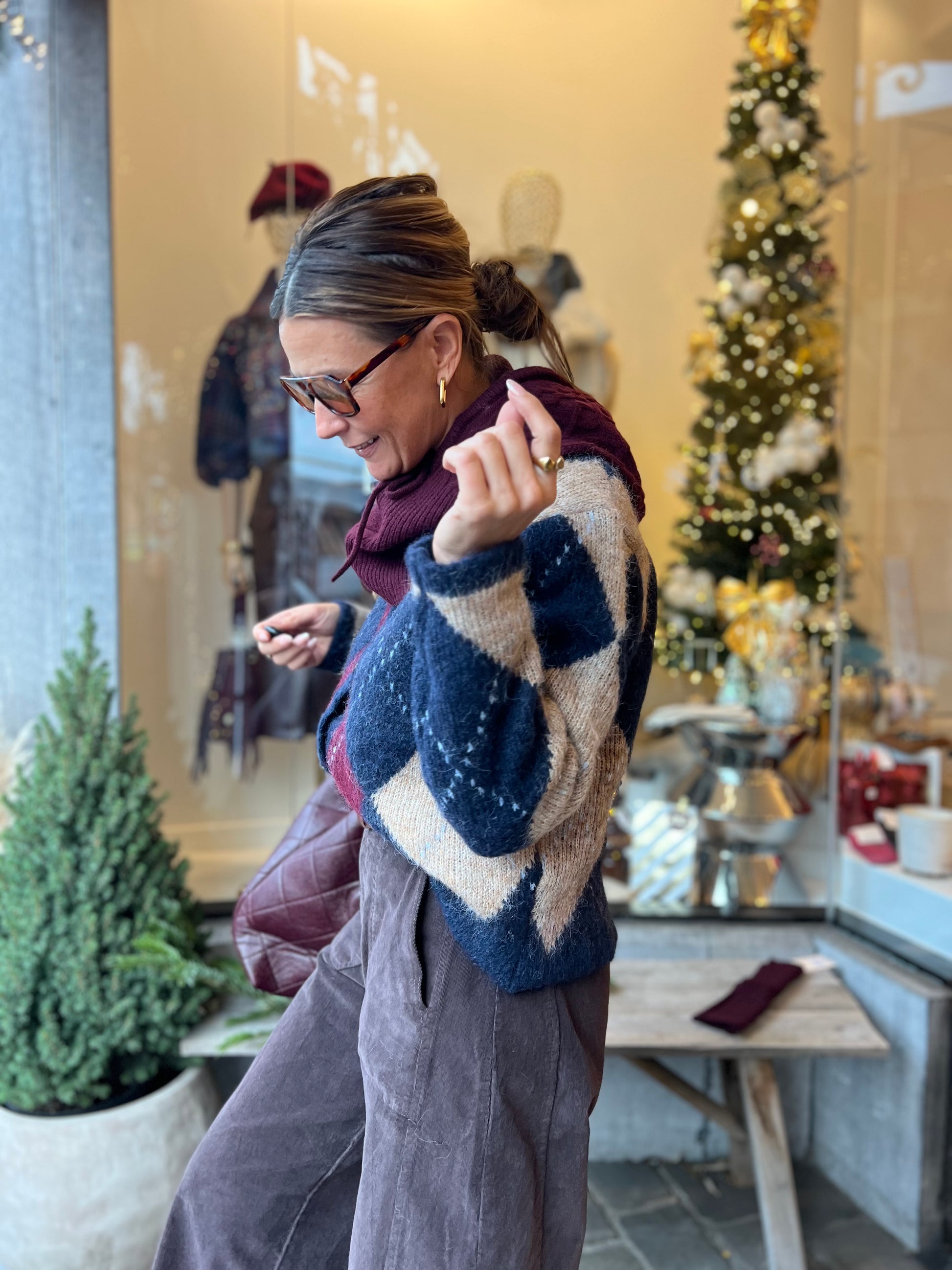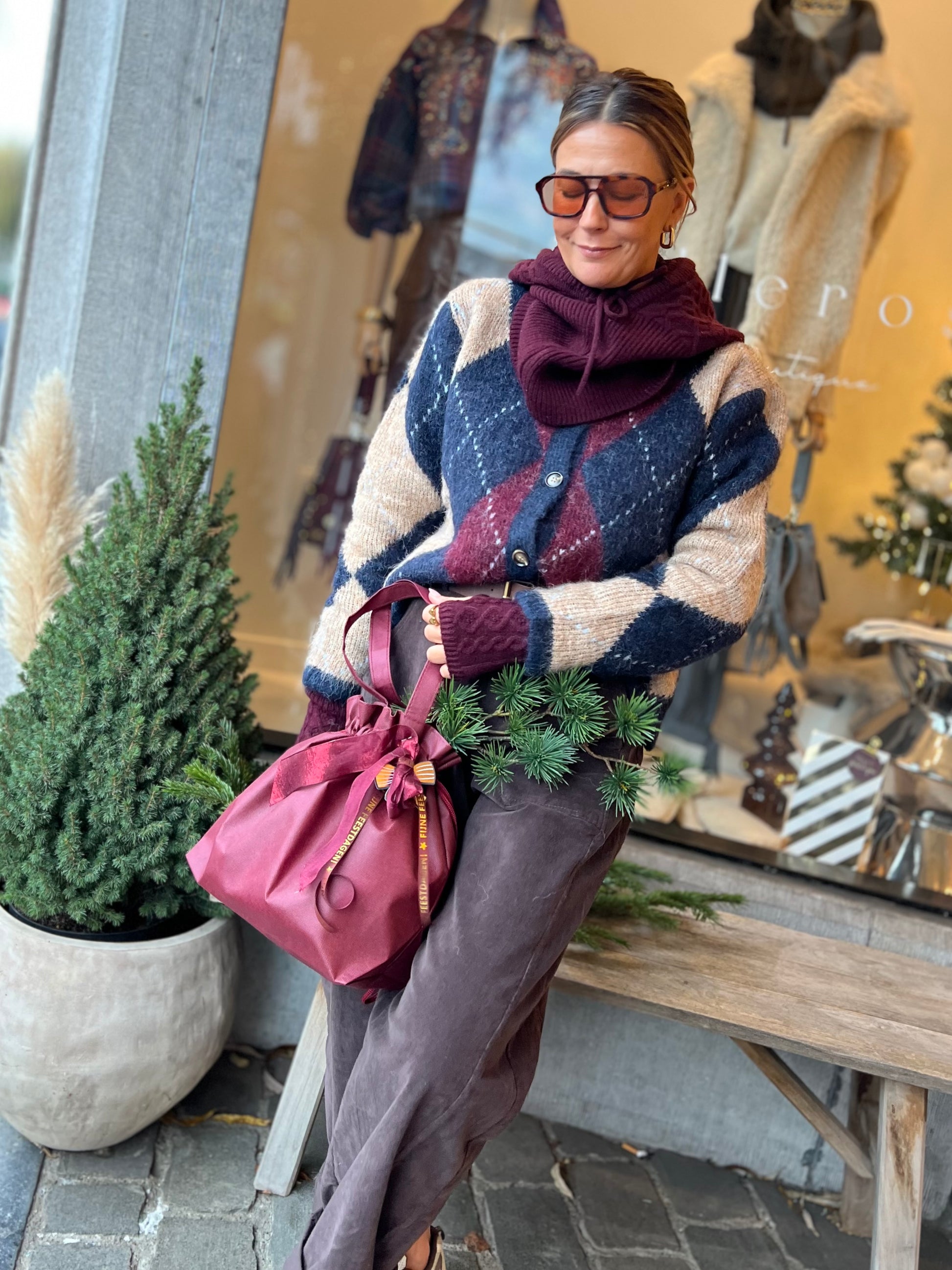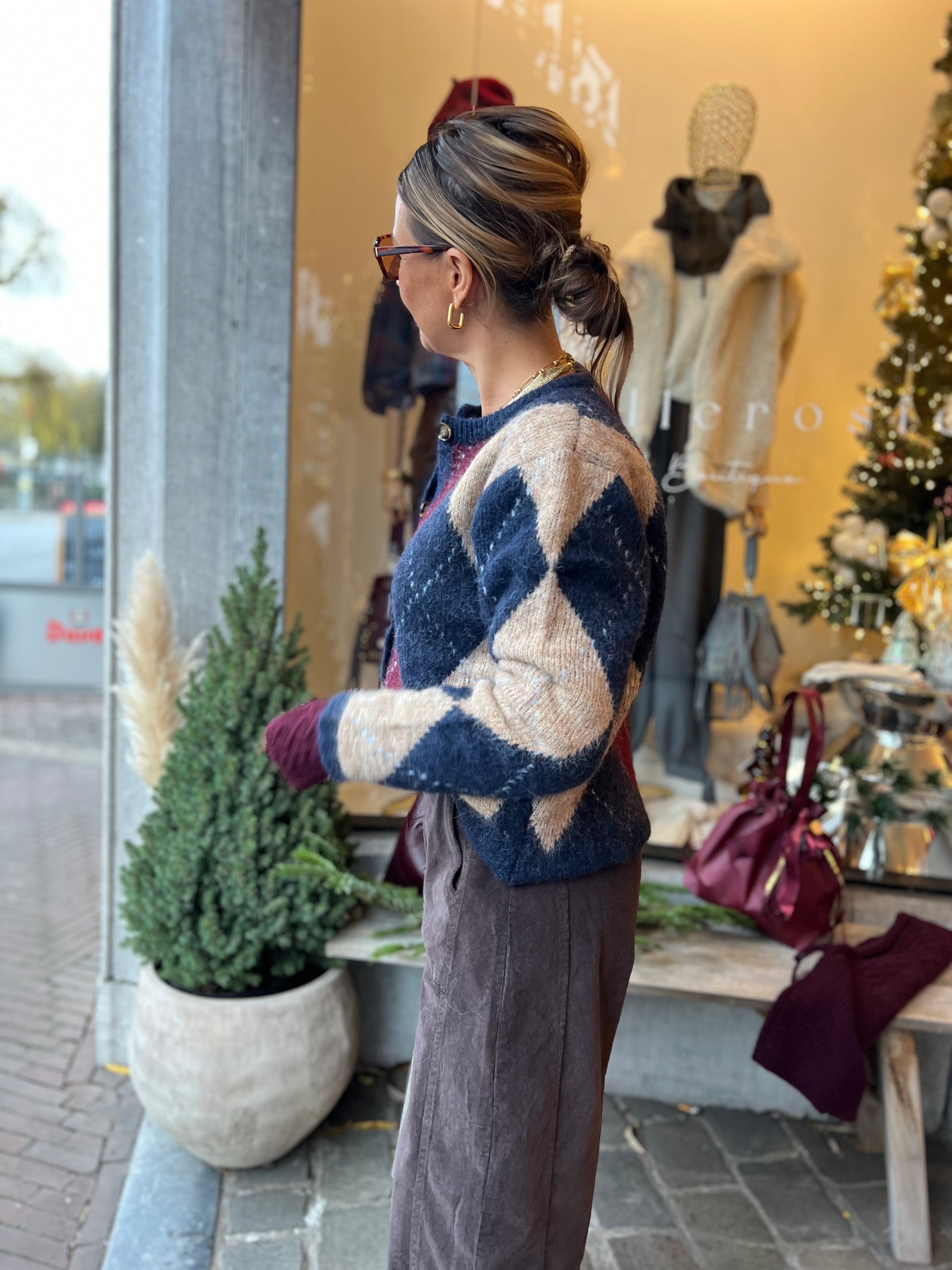 Stijlvolle gebreide vest in zacht ruitpatroon in blauw, bordeaux en beige.