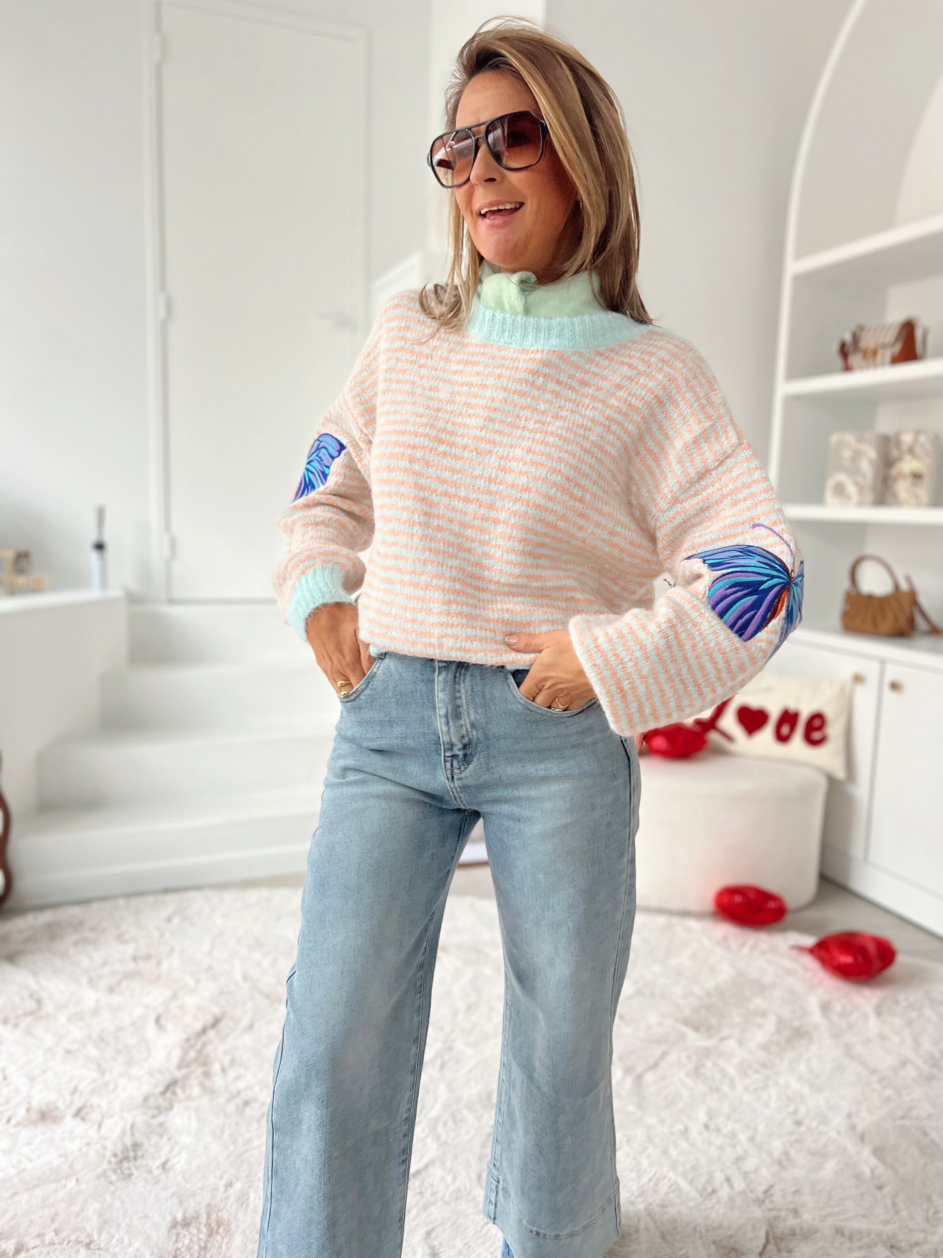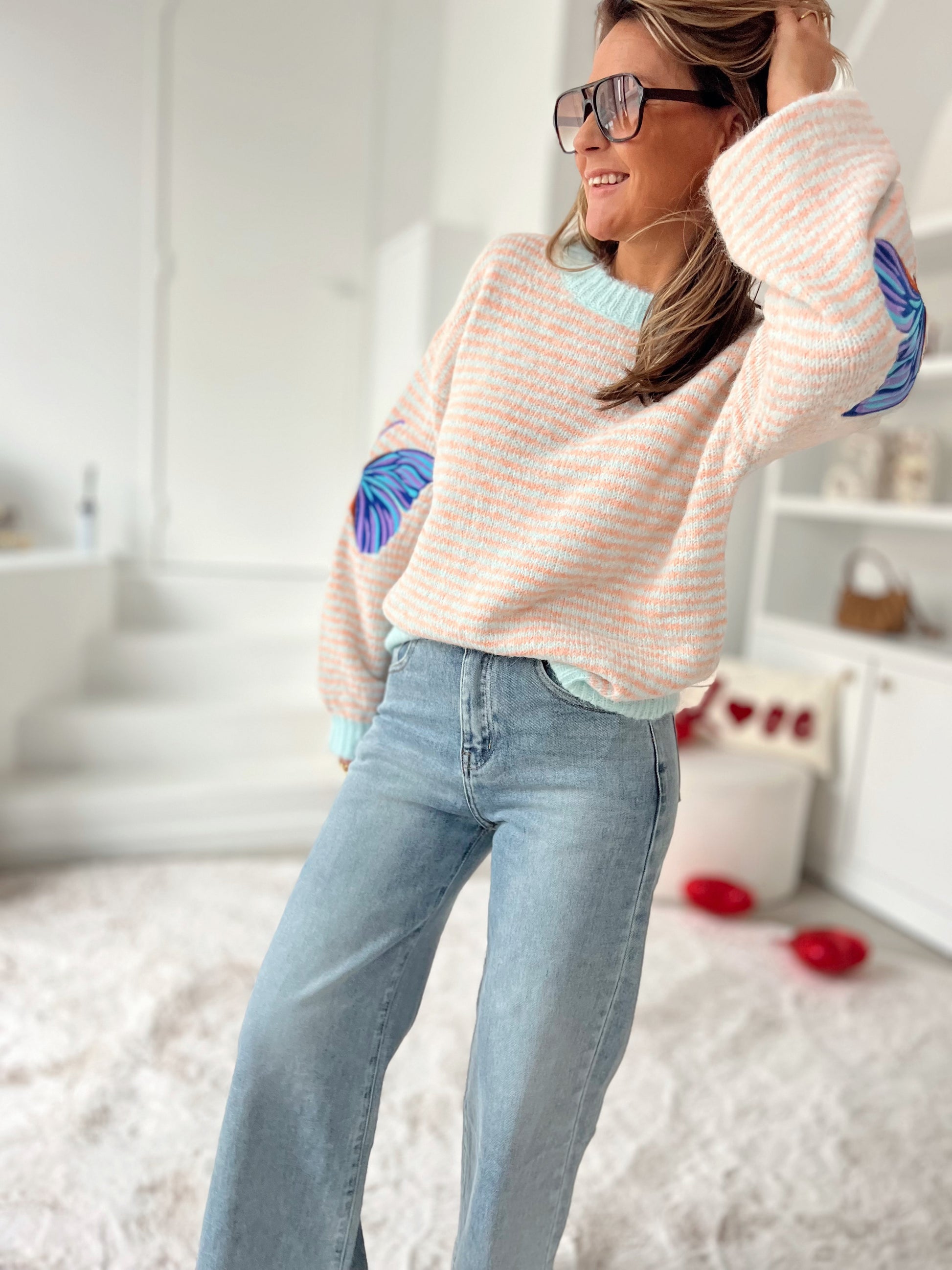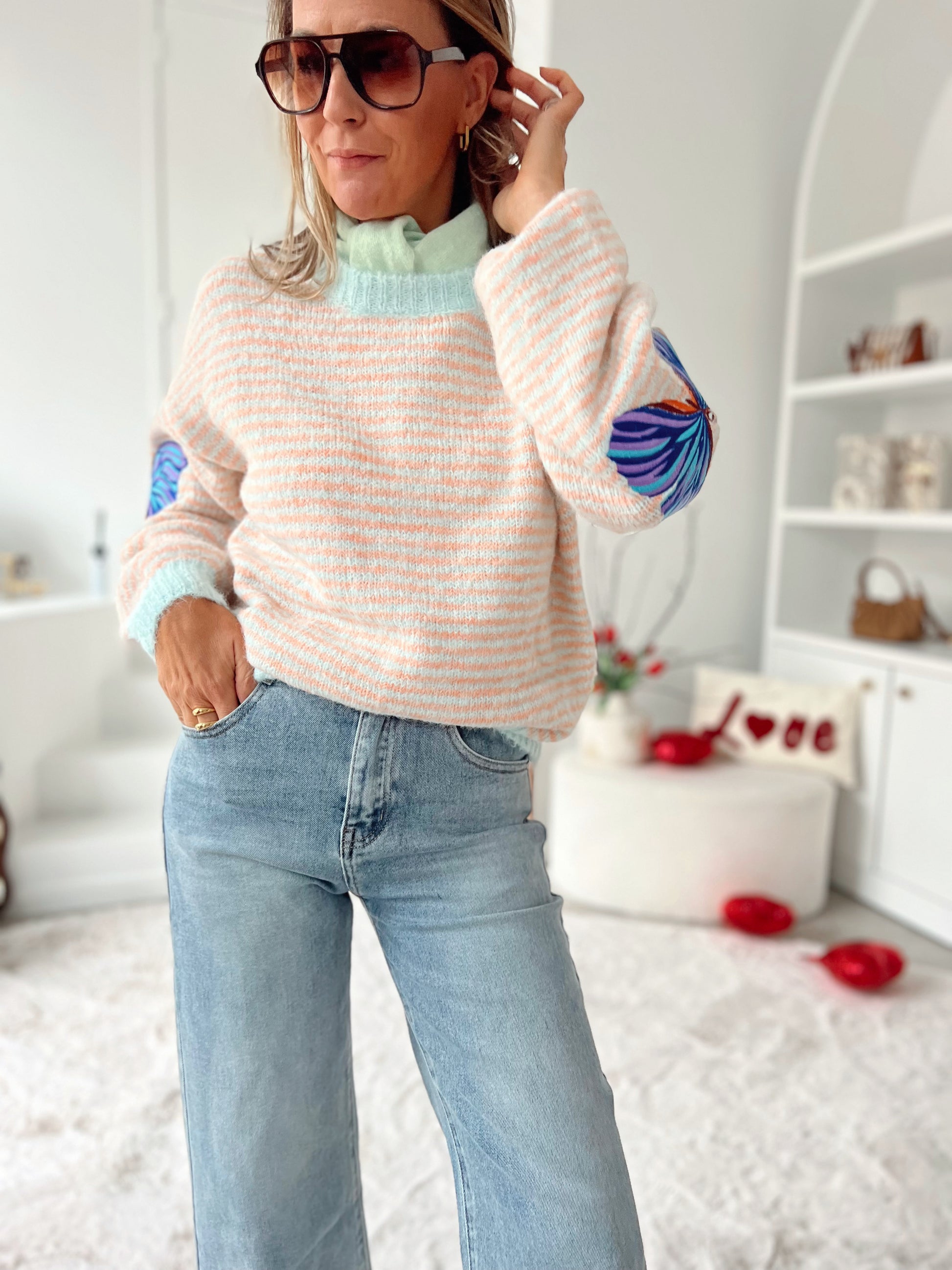 Pastelkleurige pull met ronde hals en lange mouwen.
