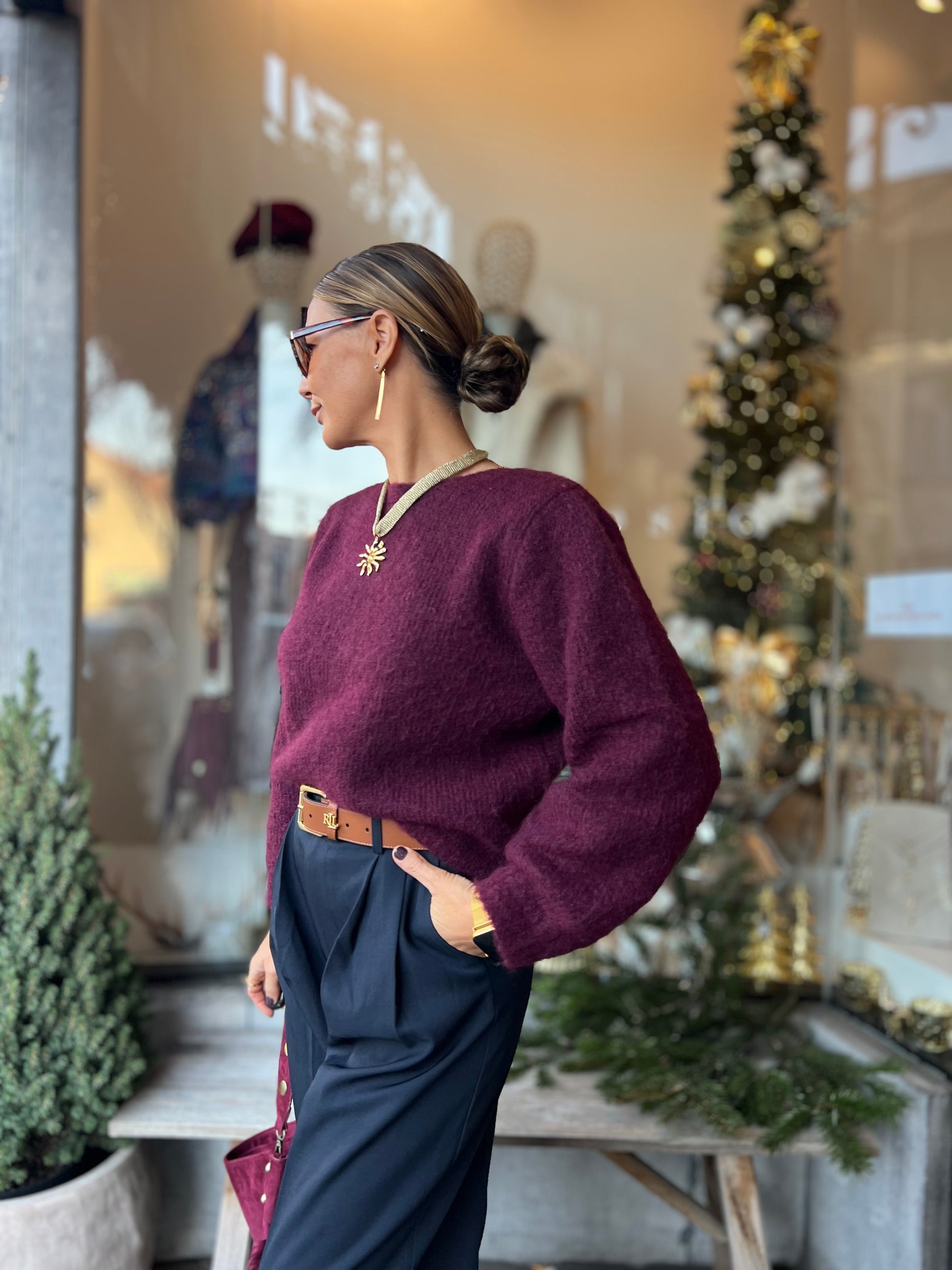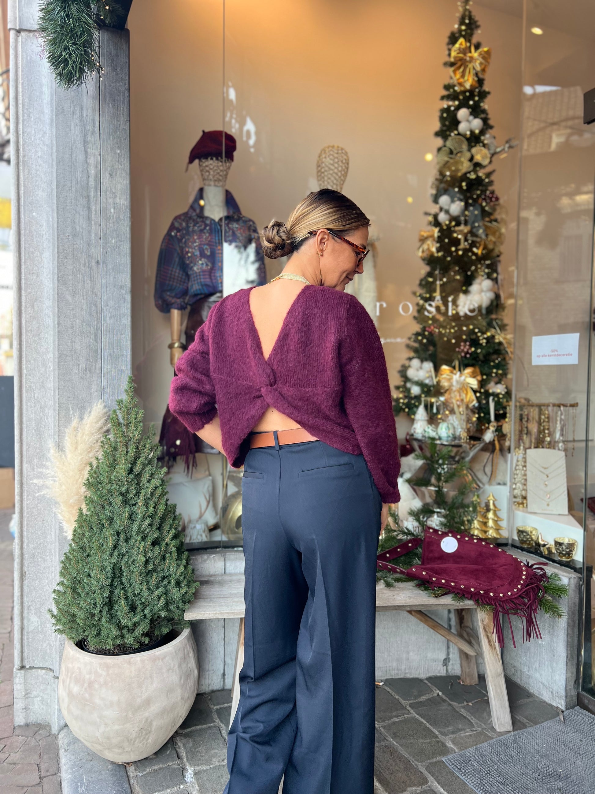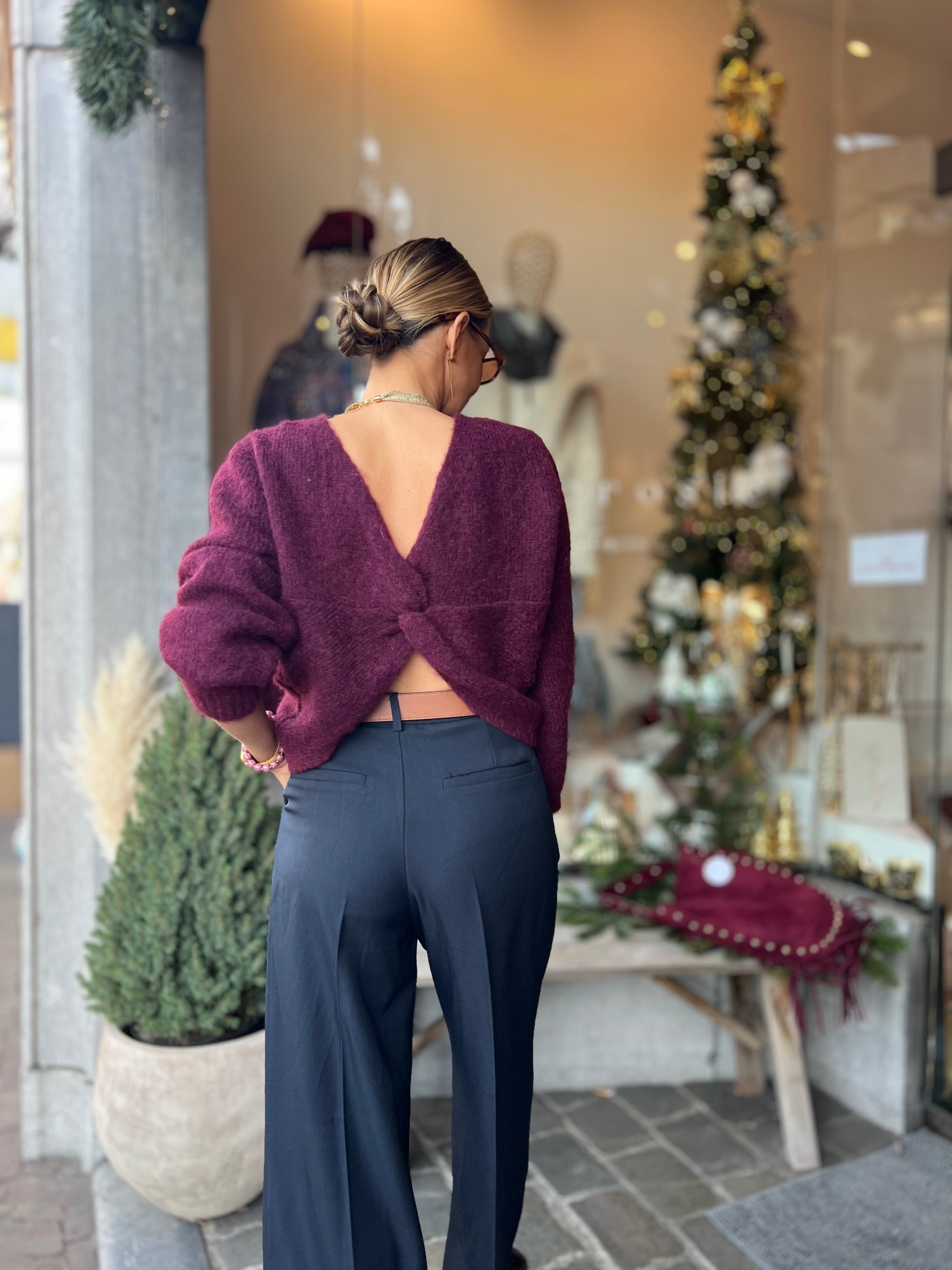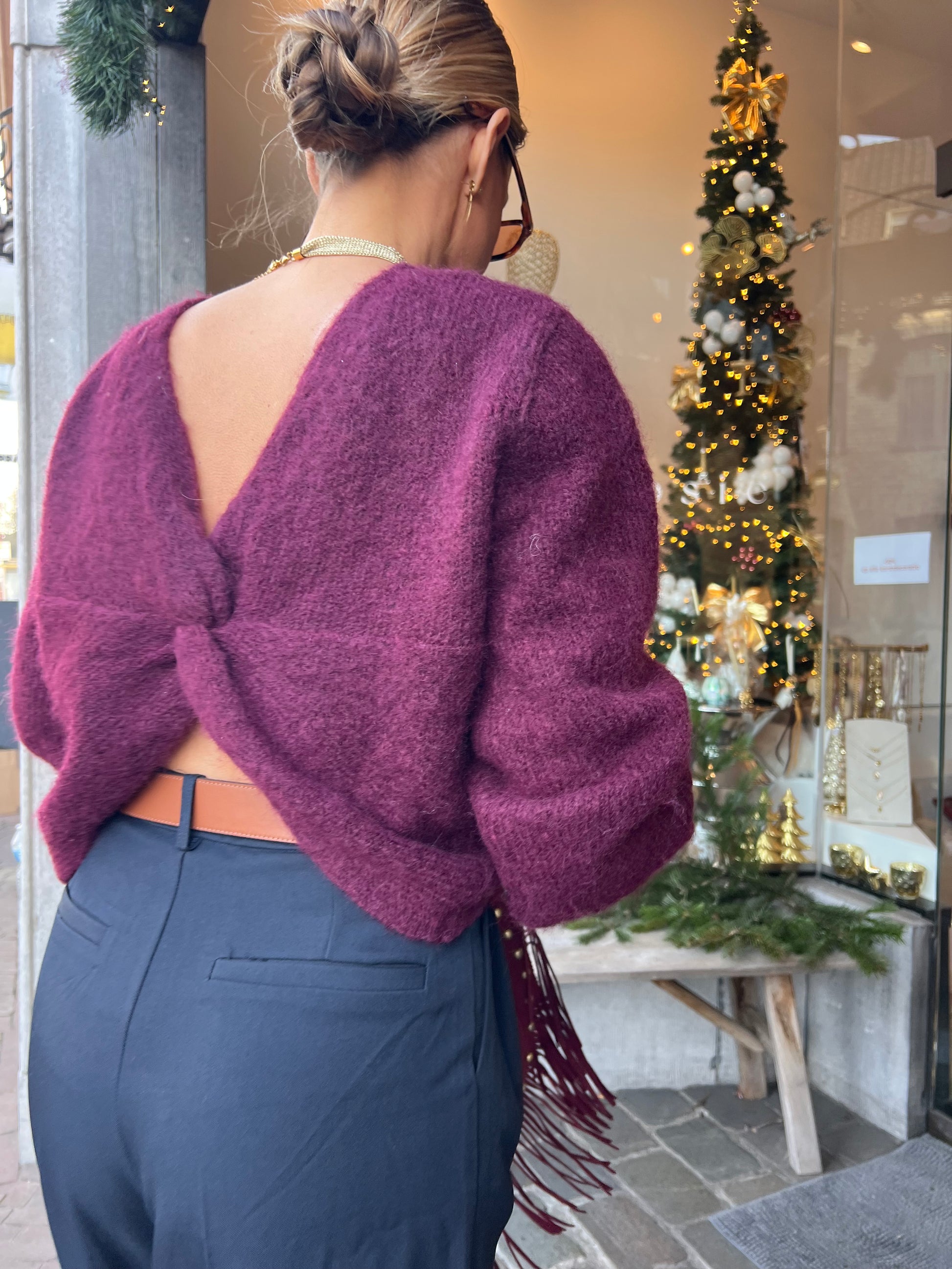 Burgundykleurige pull.