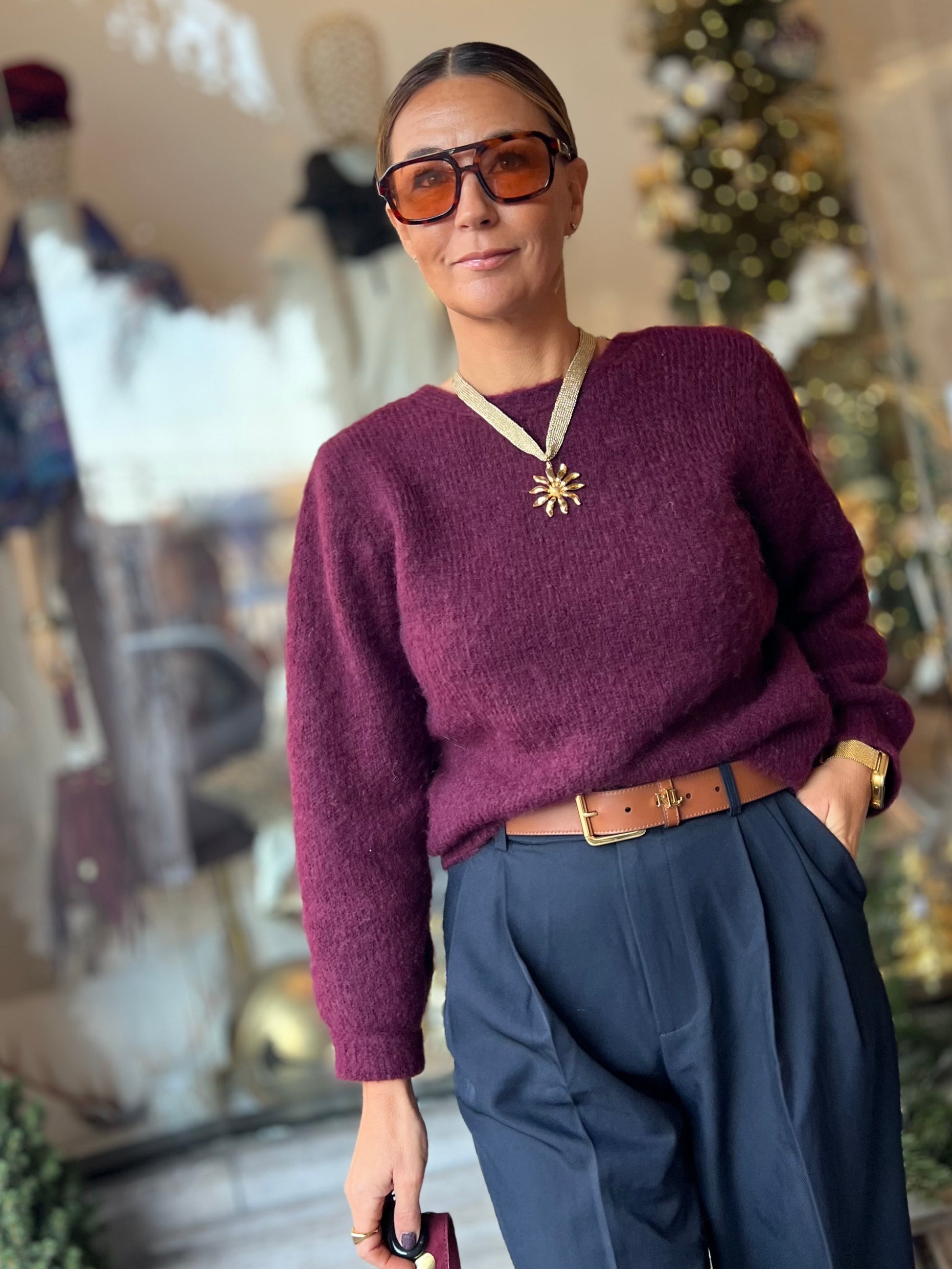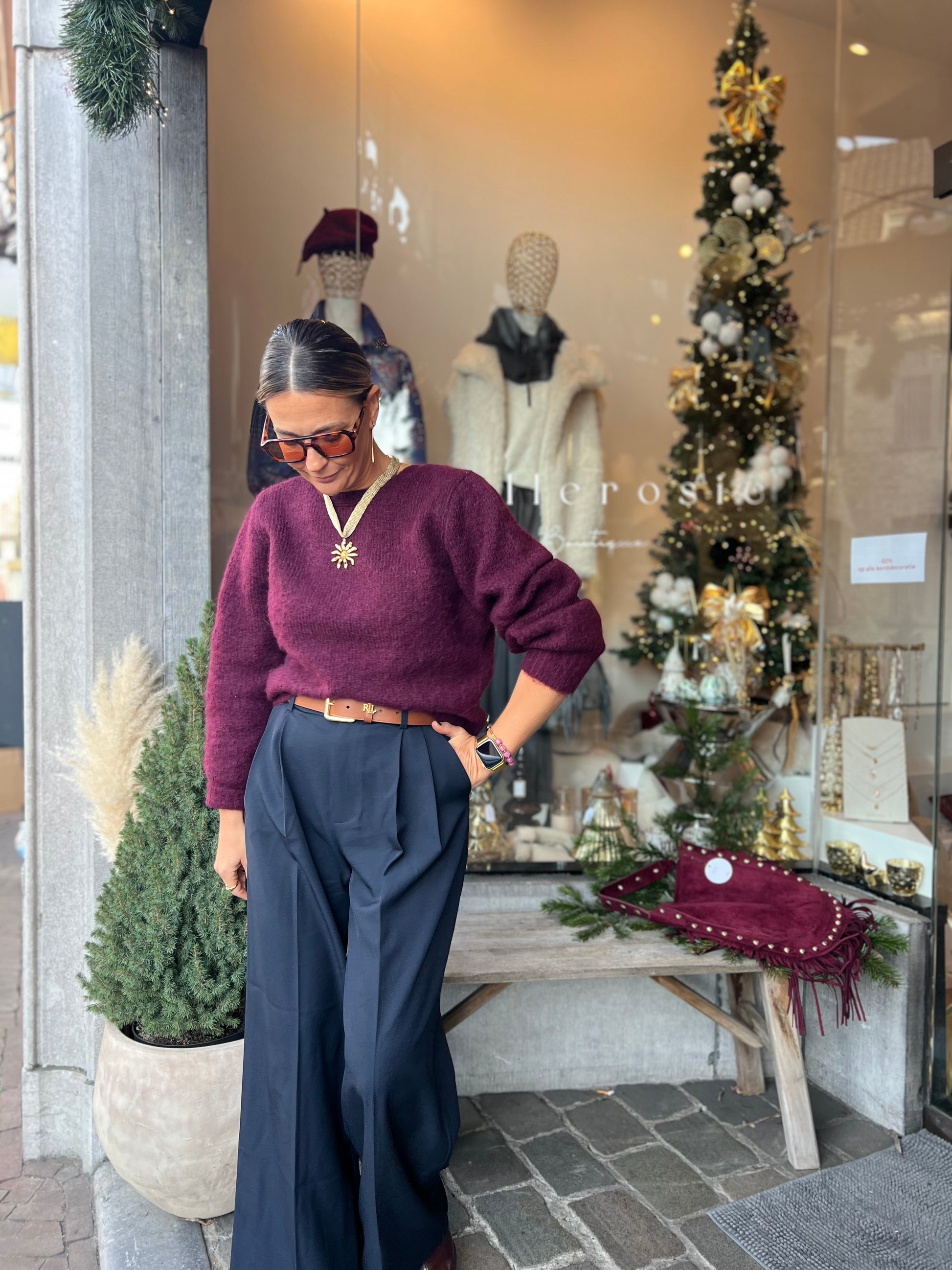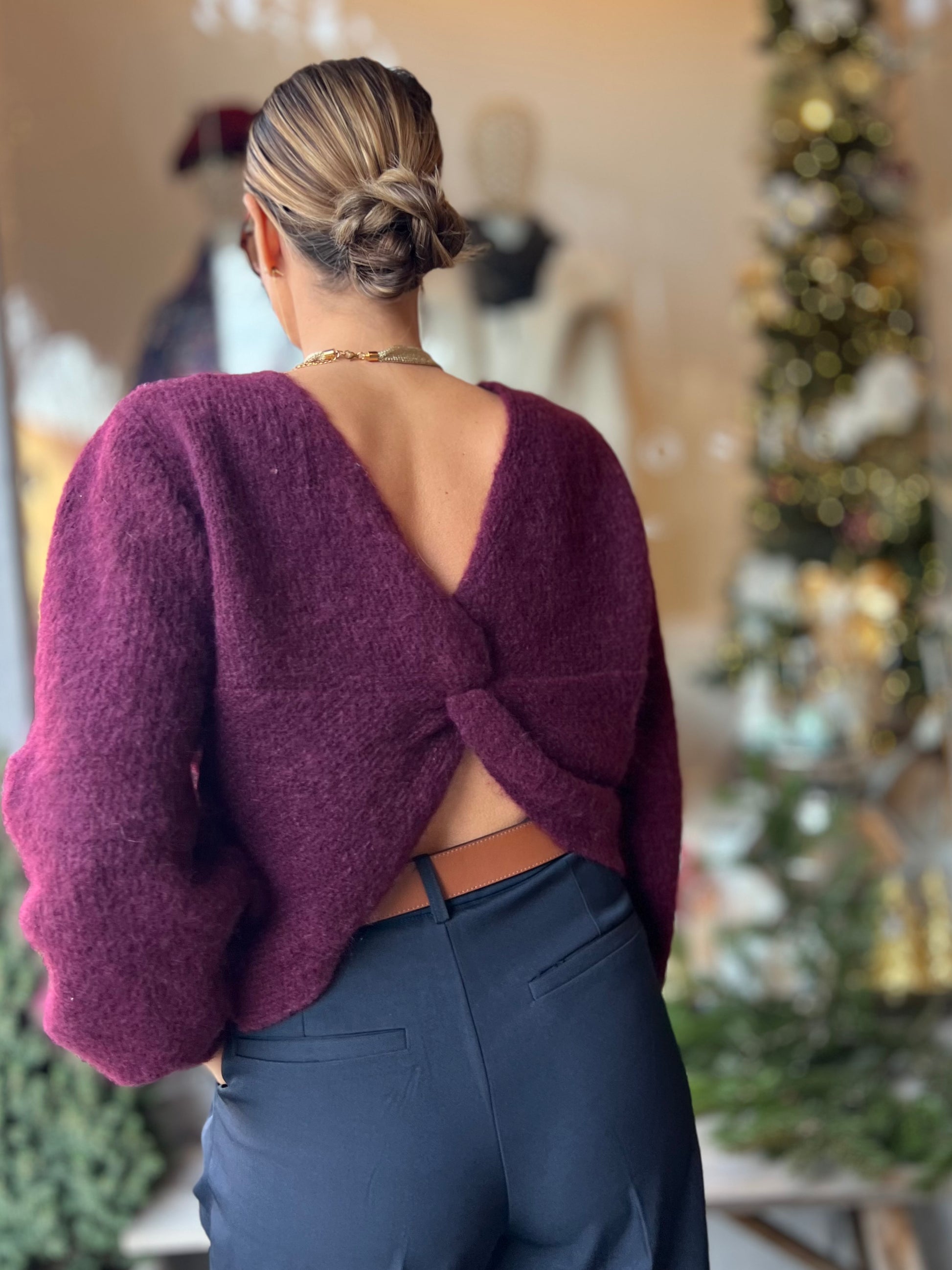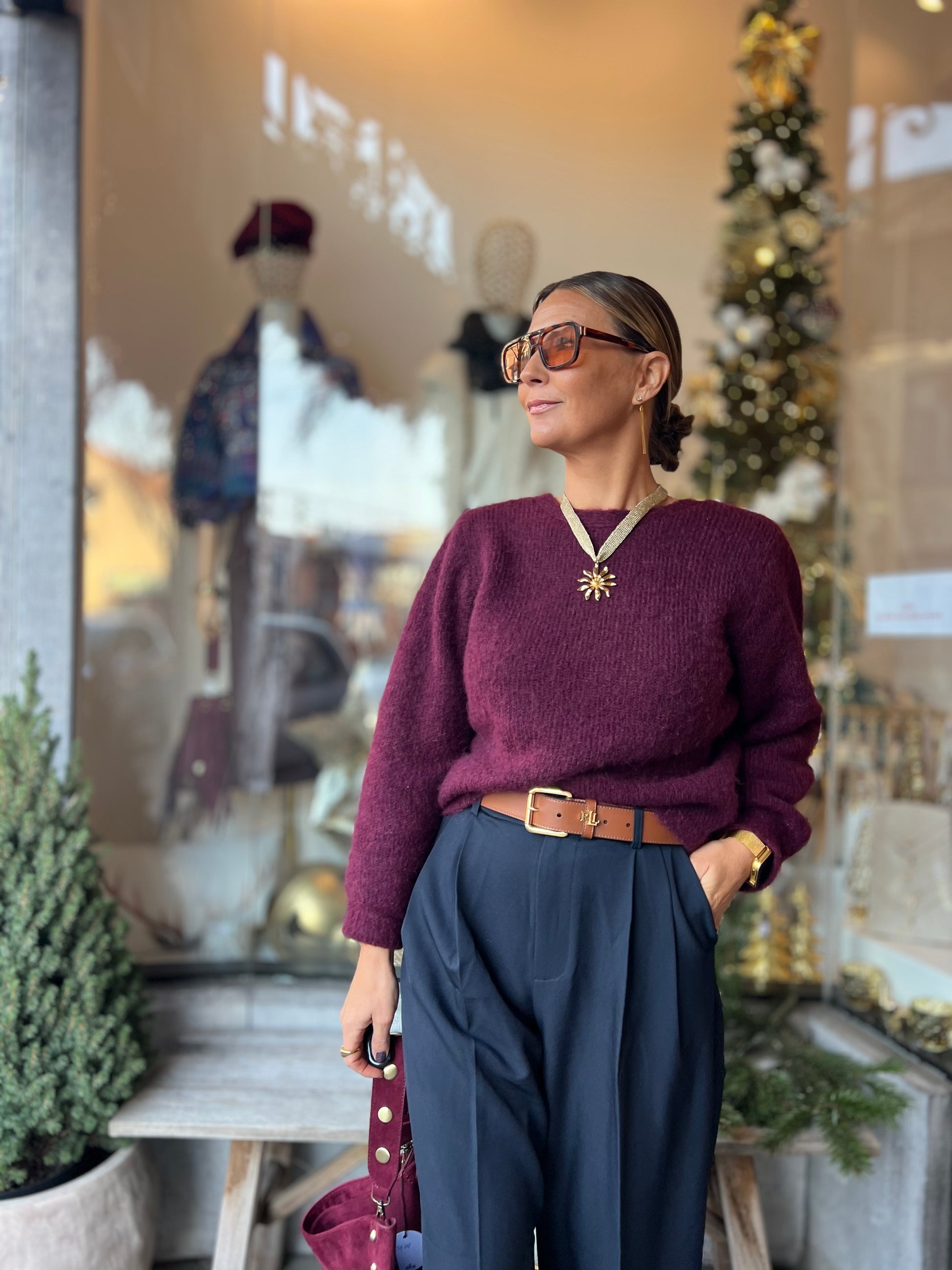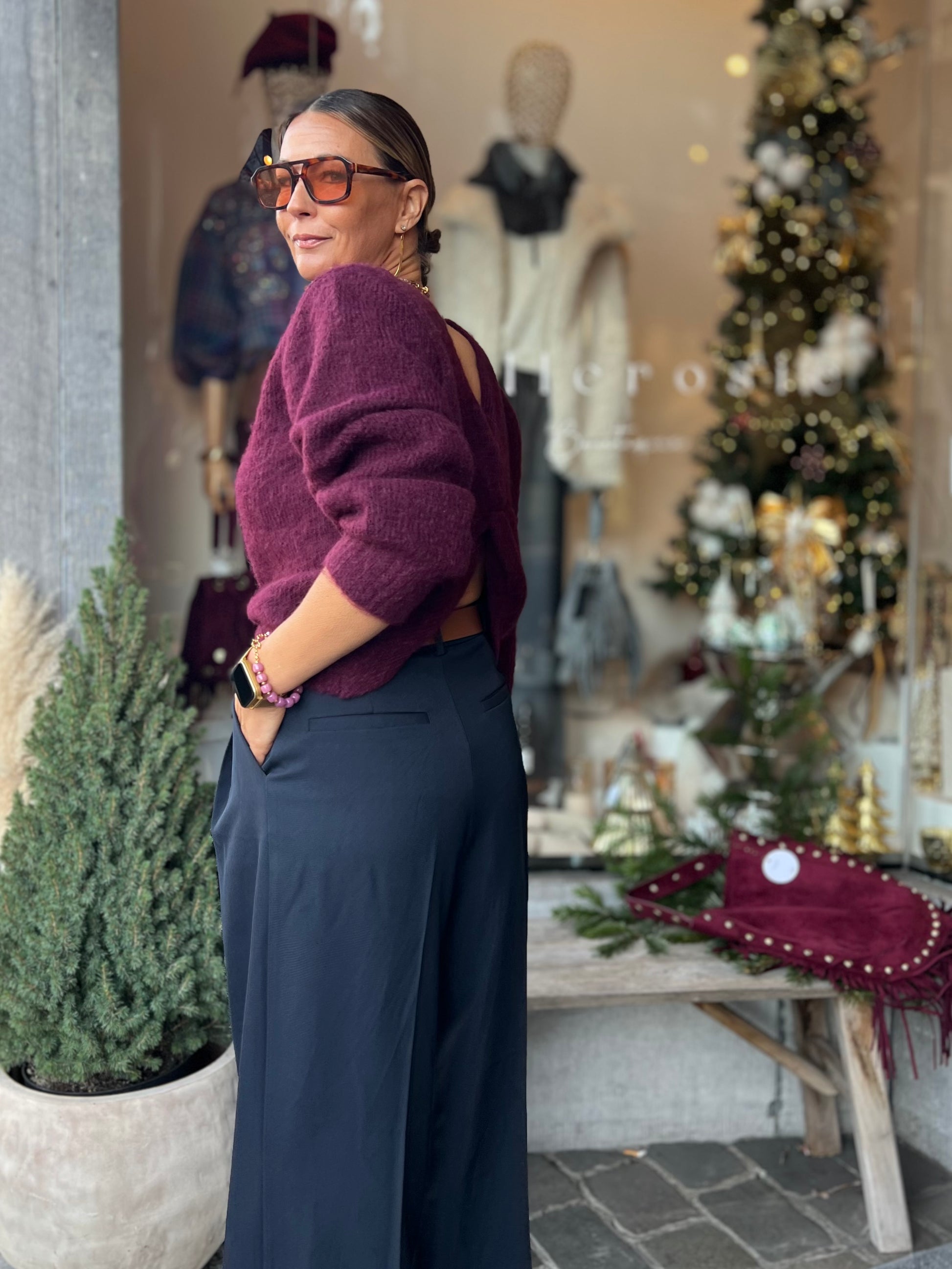 Burgundykleurige pull.
