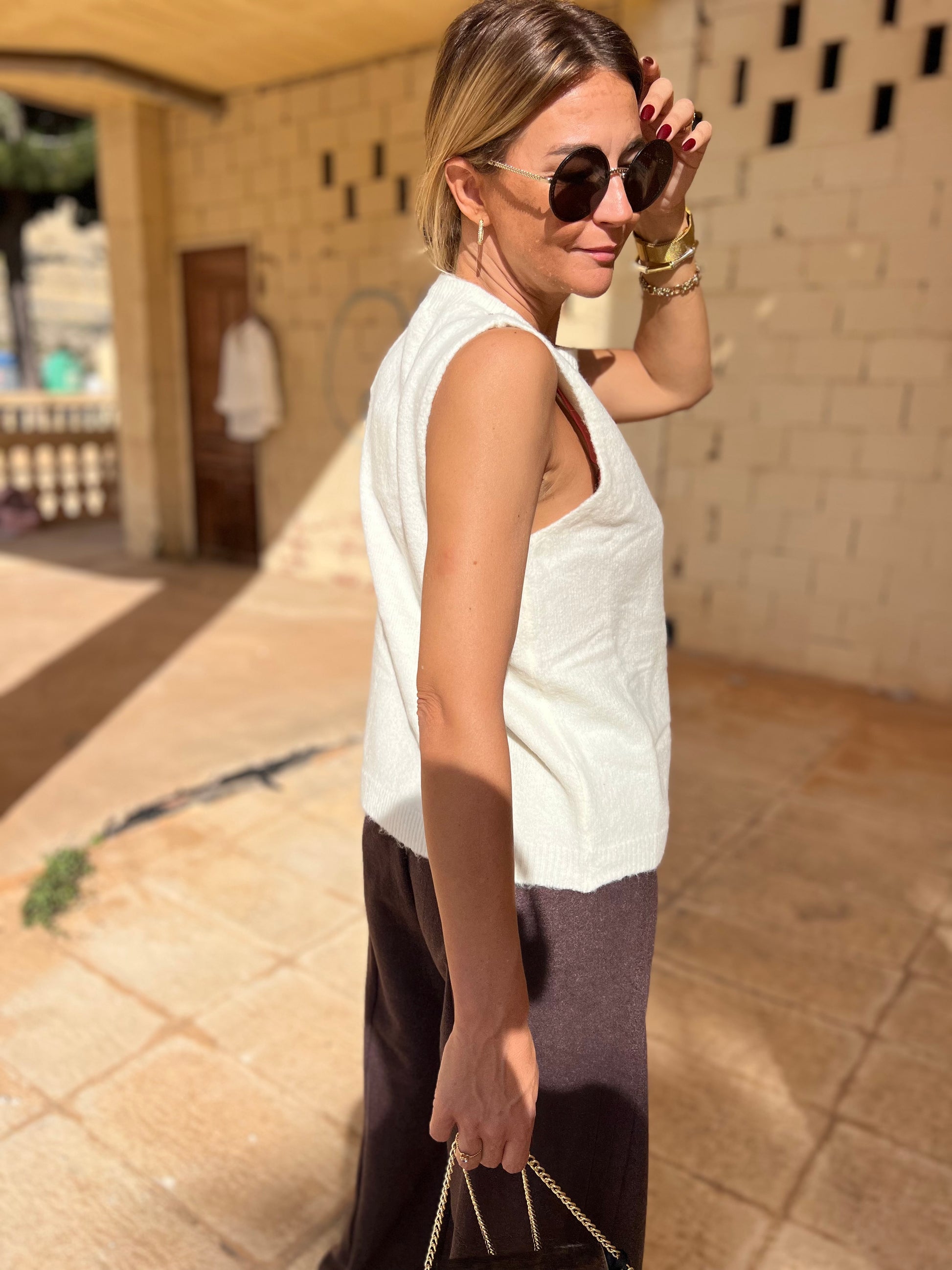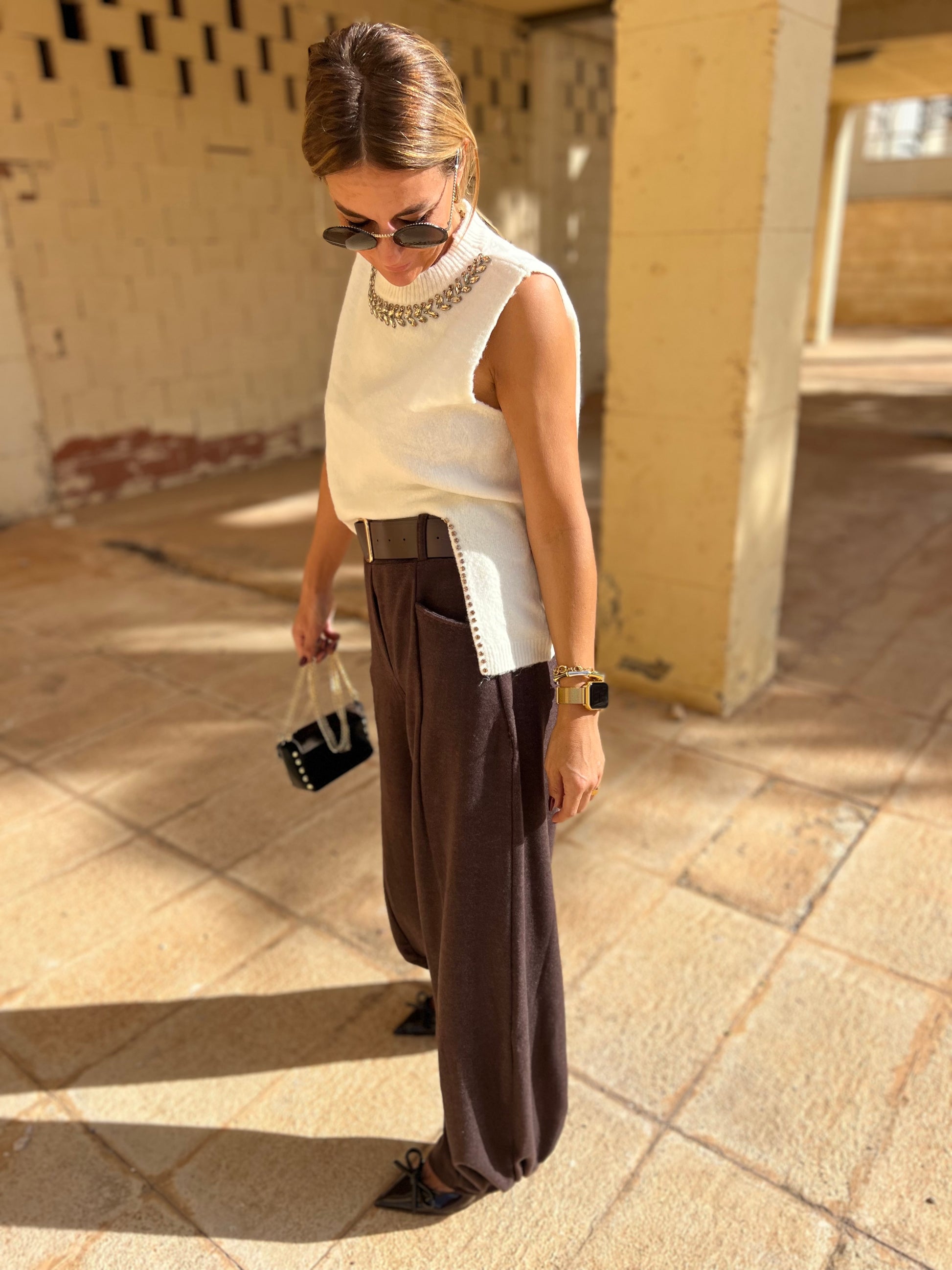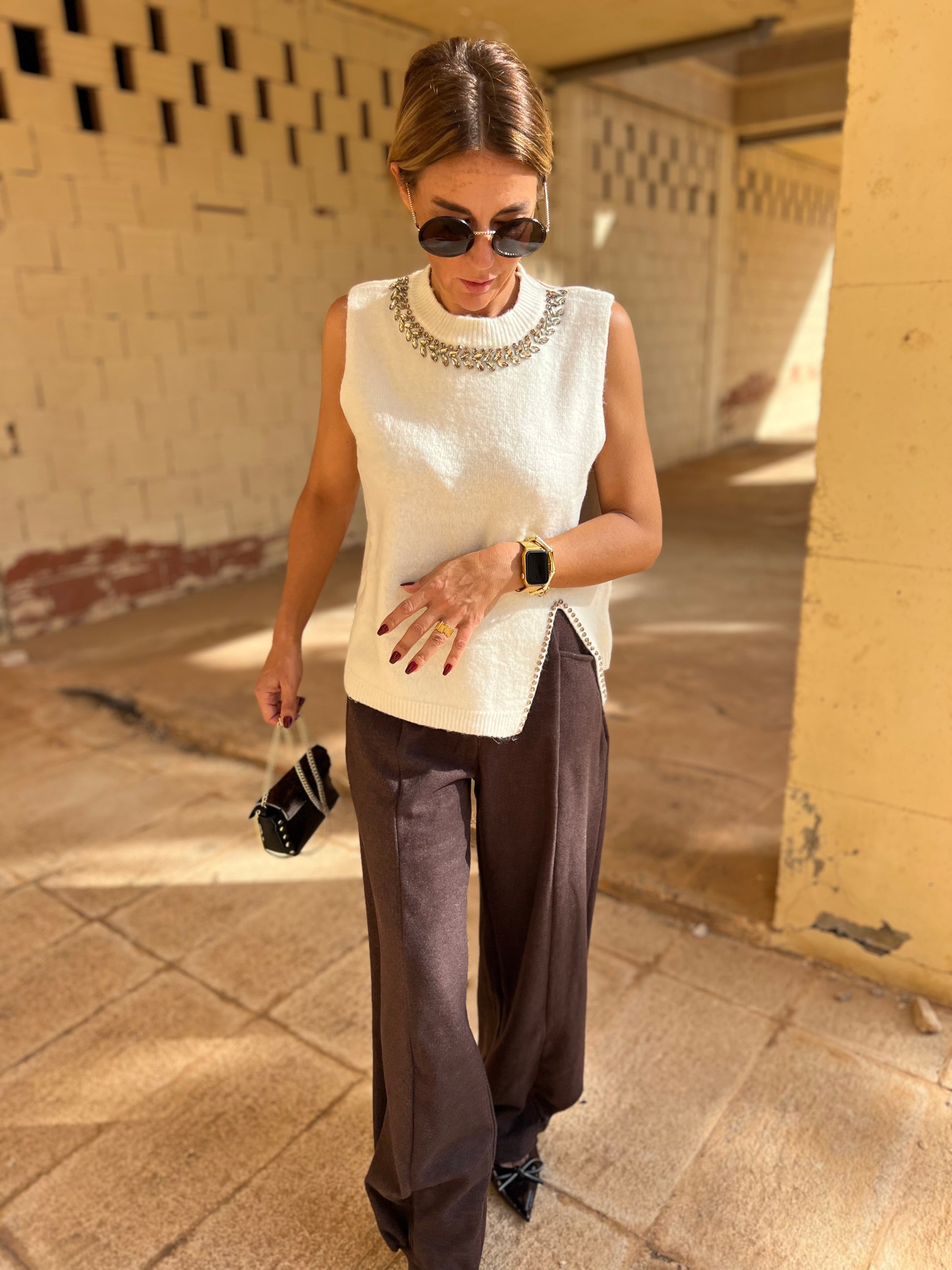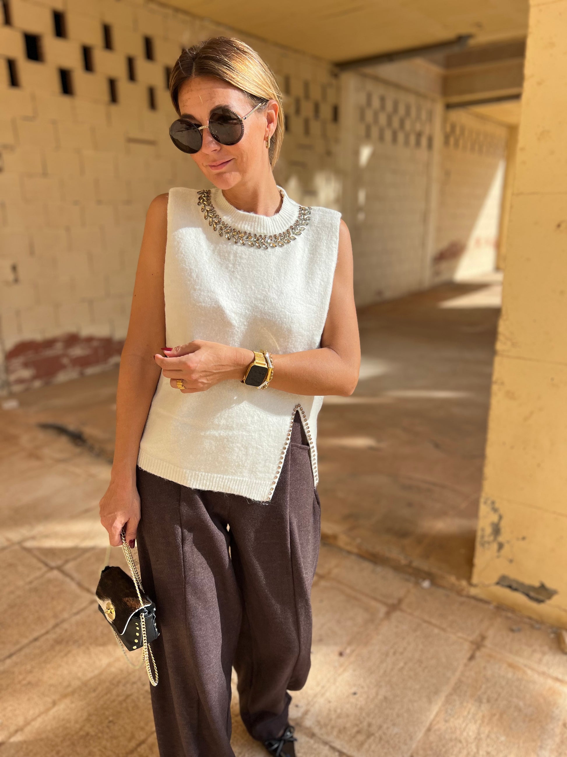 Mouwloze knit top met een kort opstaand kraagje afgewerkt met glinsterende strass details aan de hals en met een splitje onderaan de top ook afgewerkt met glanzende strassjes