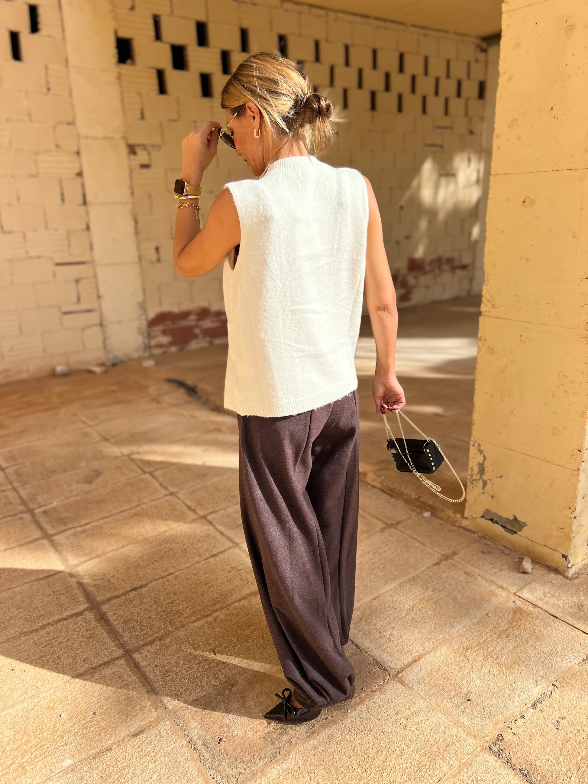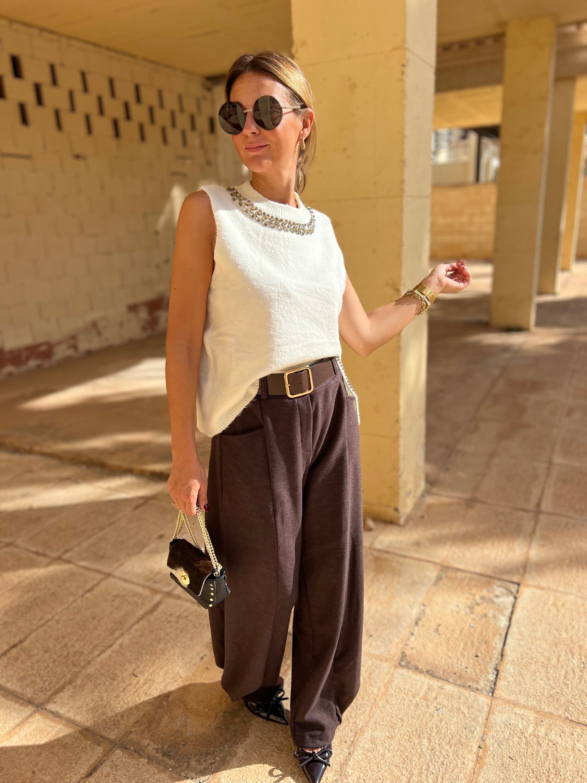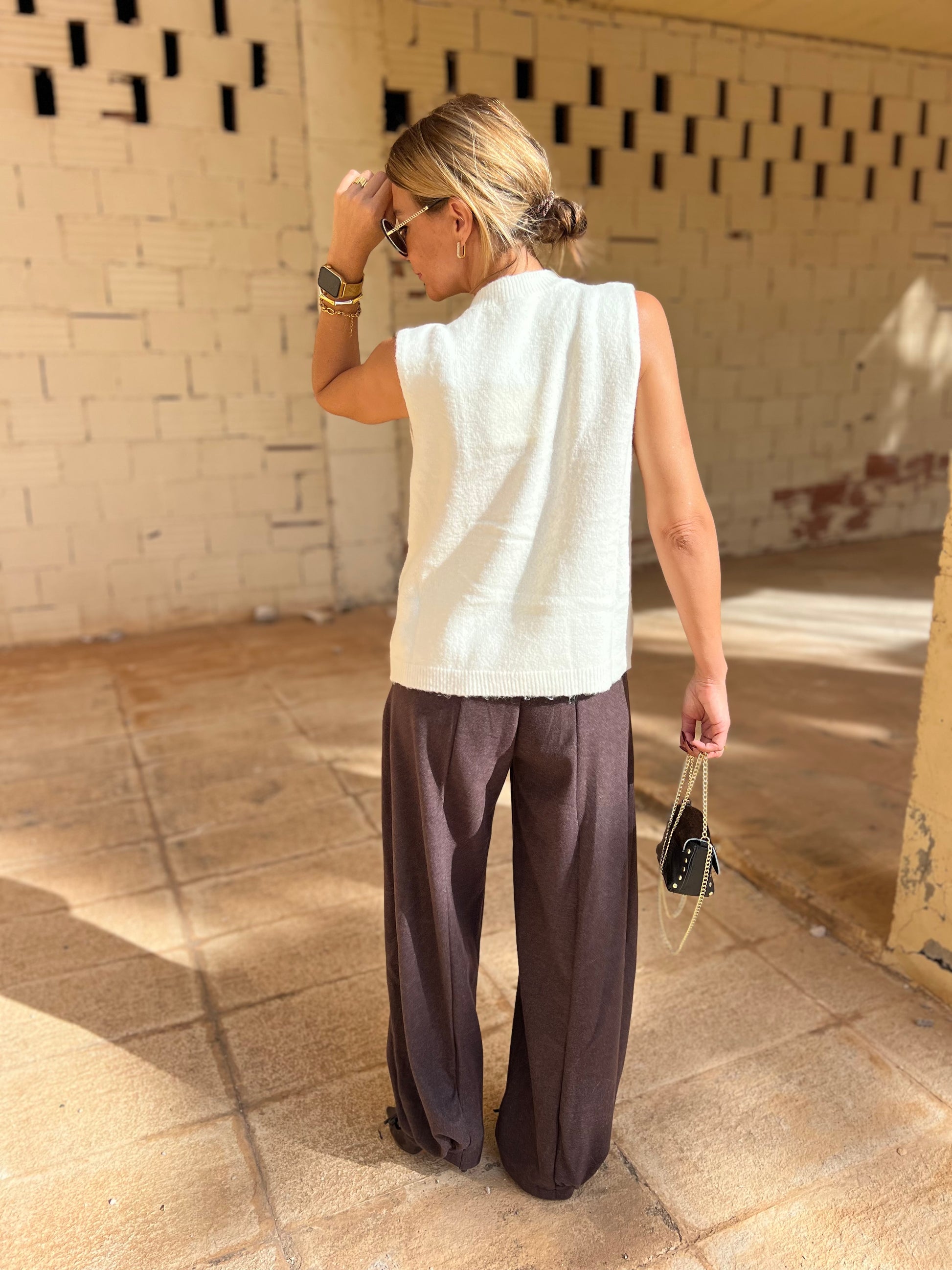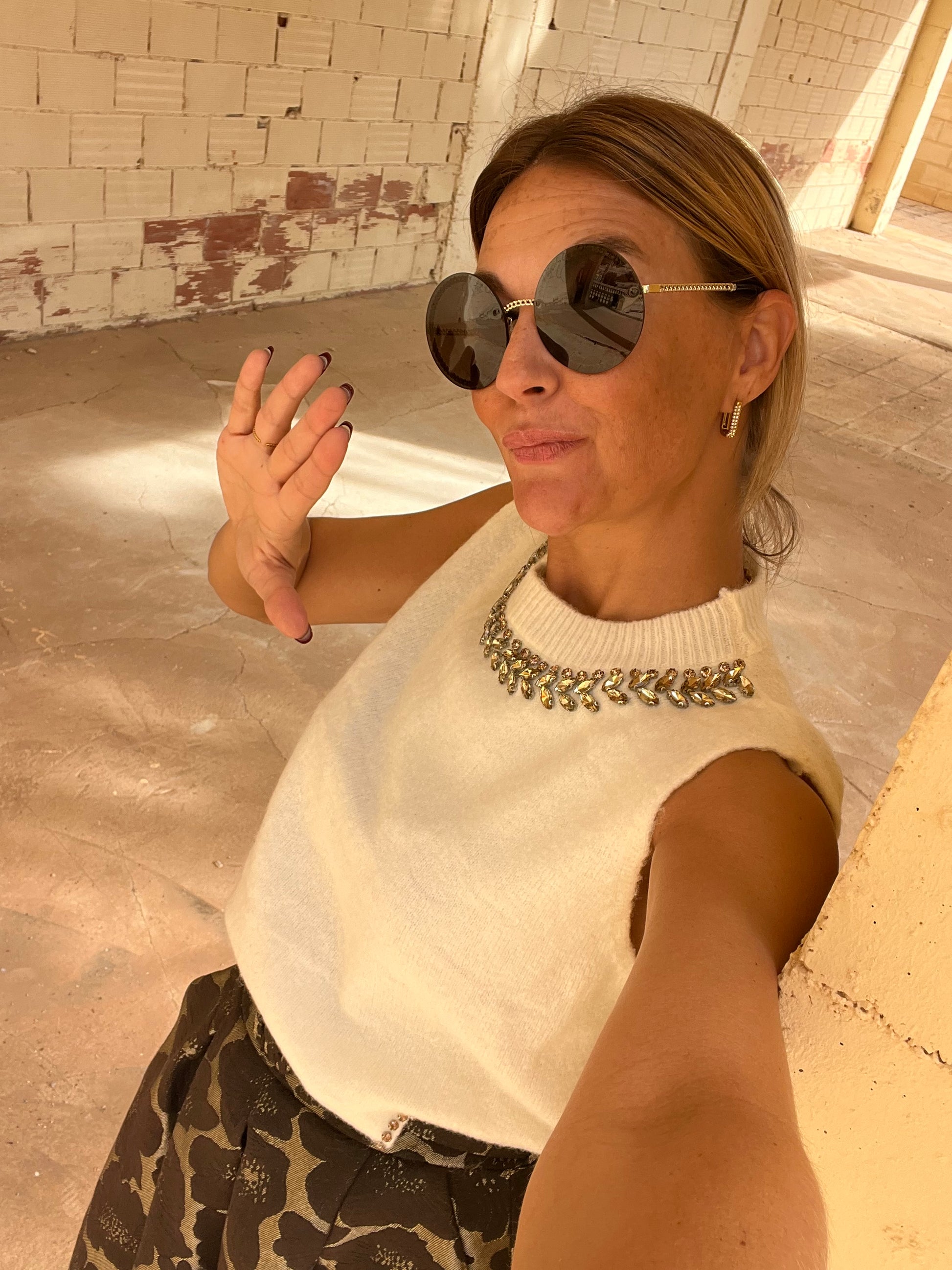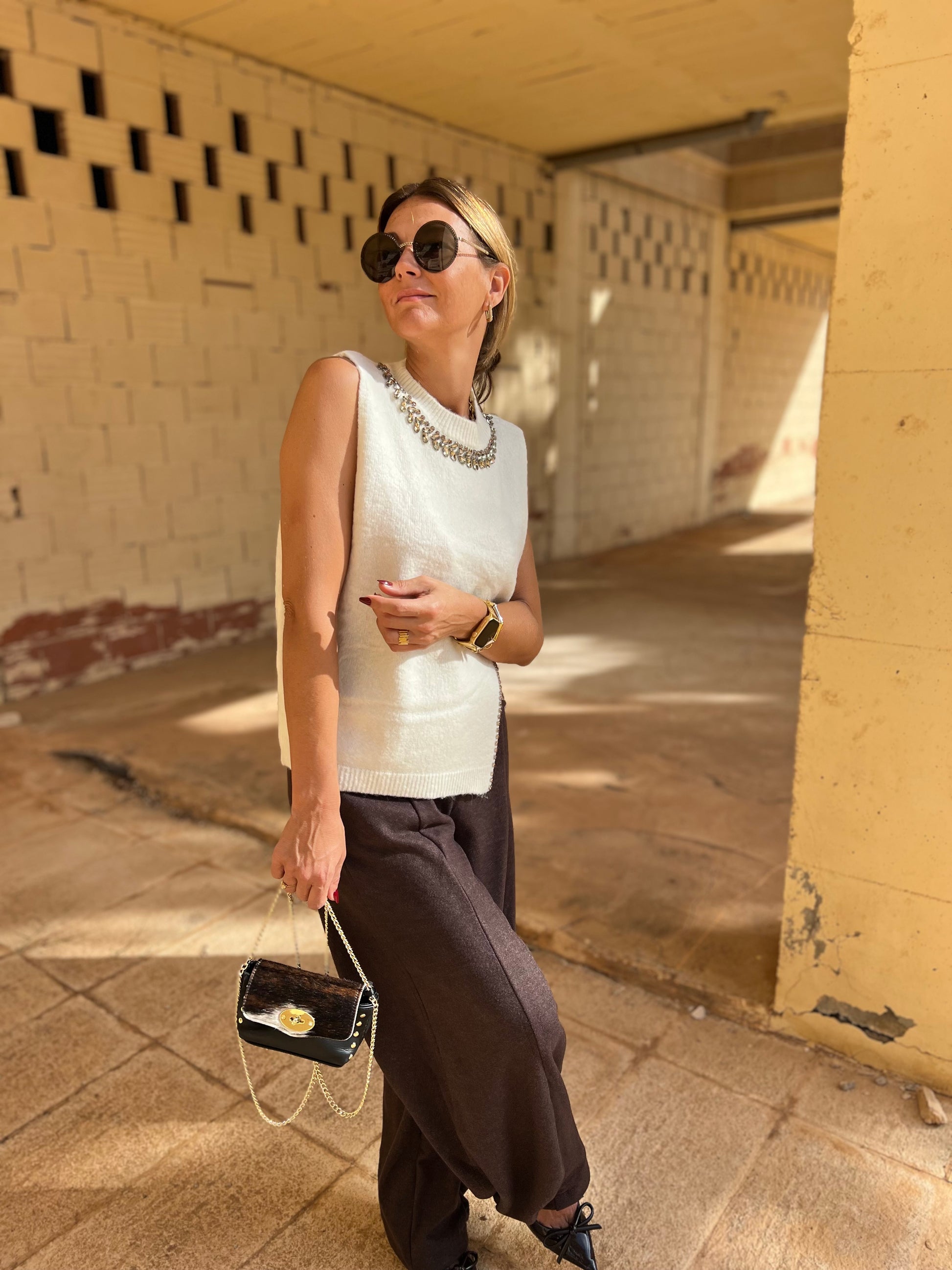Mouwloze knit top met een kort opstaand kraagje afgewerkt met glinsterende strass details aan de hals en met een splitje onderaan de top ook afgewerkt met glanzende strassjes