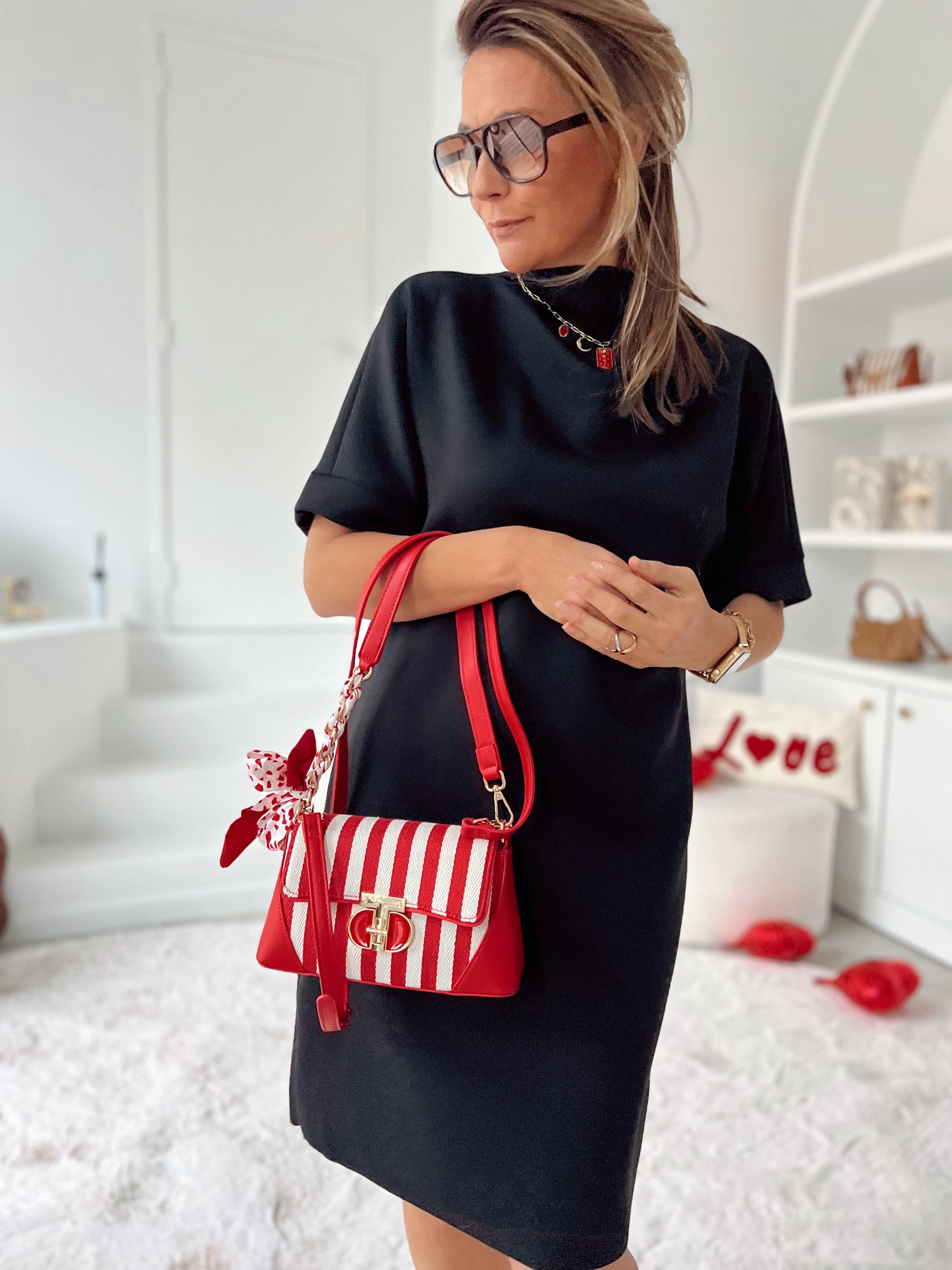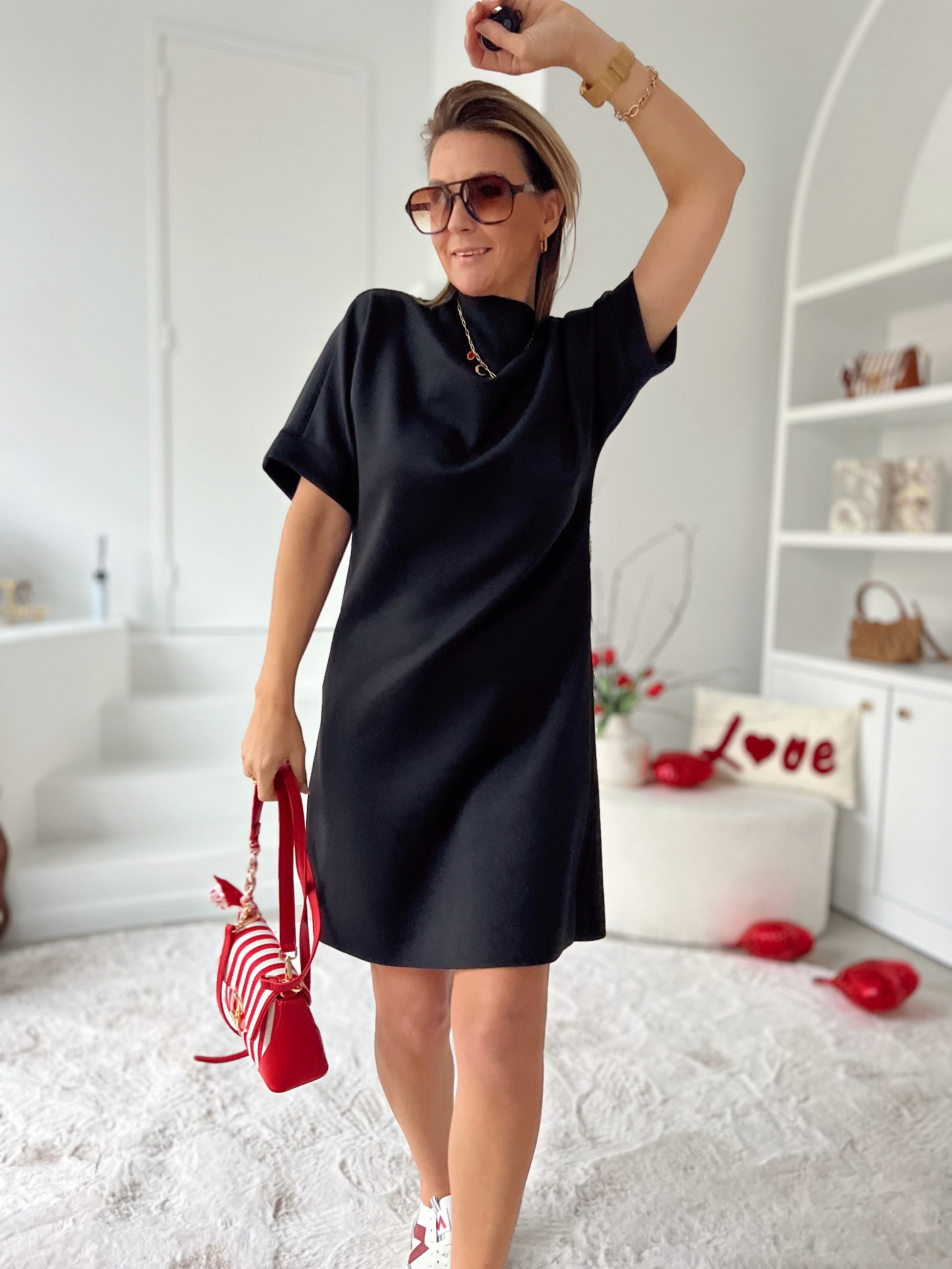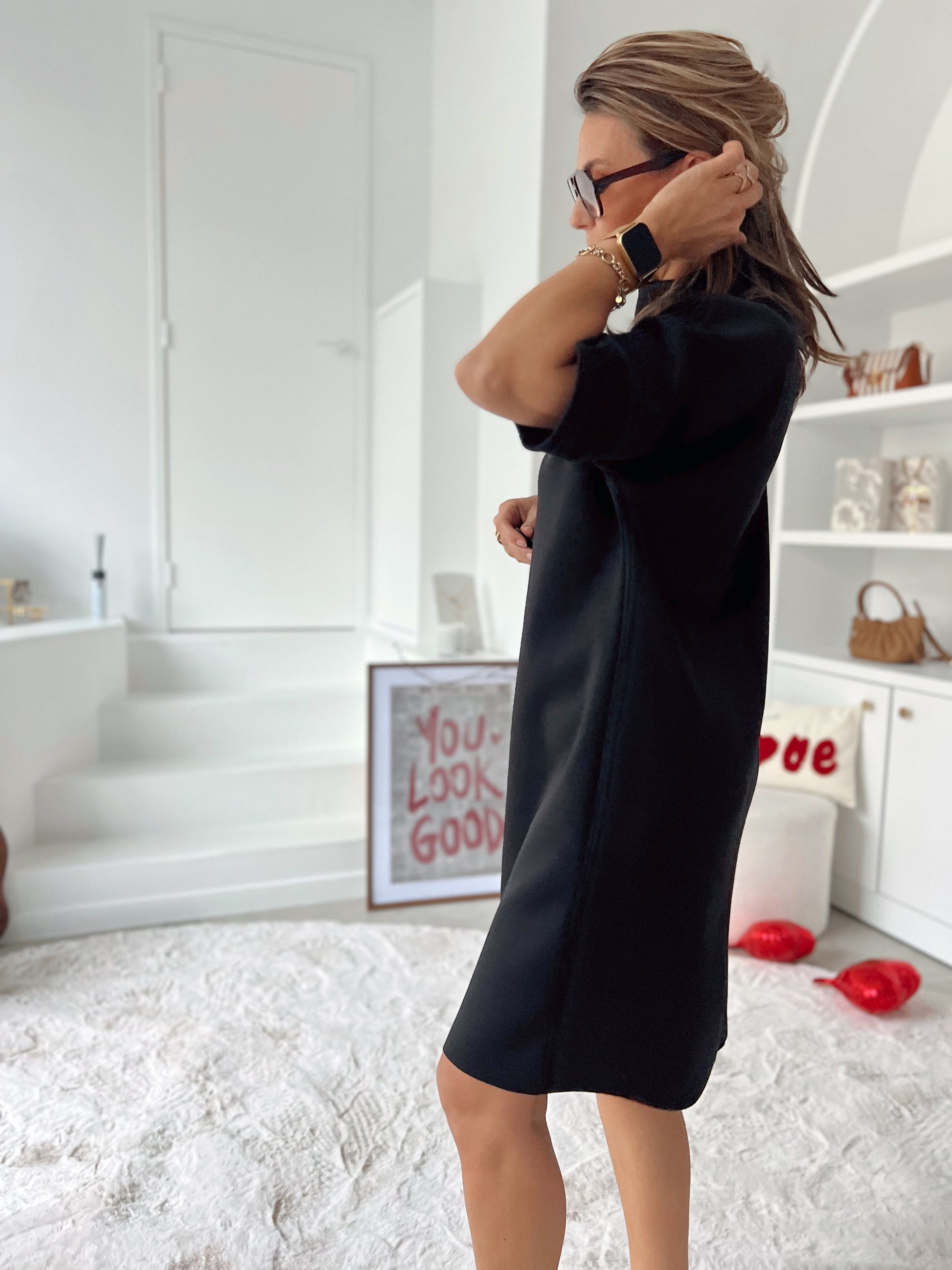 De zwarte kleur straalt rust en elegantie uit, terwijl de rechte, losvallende snit zorgt voor een comfortabele maar verfijnde look. De subtiele opstaande hals en omgeslagen mouwtjes geven het kleedje net dat tikkeltje extra.