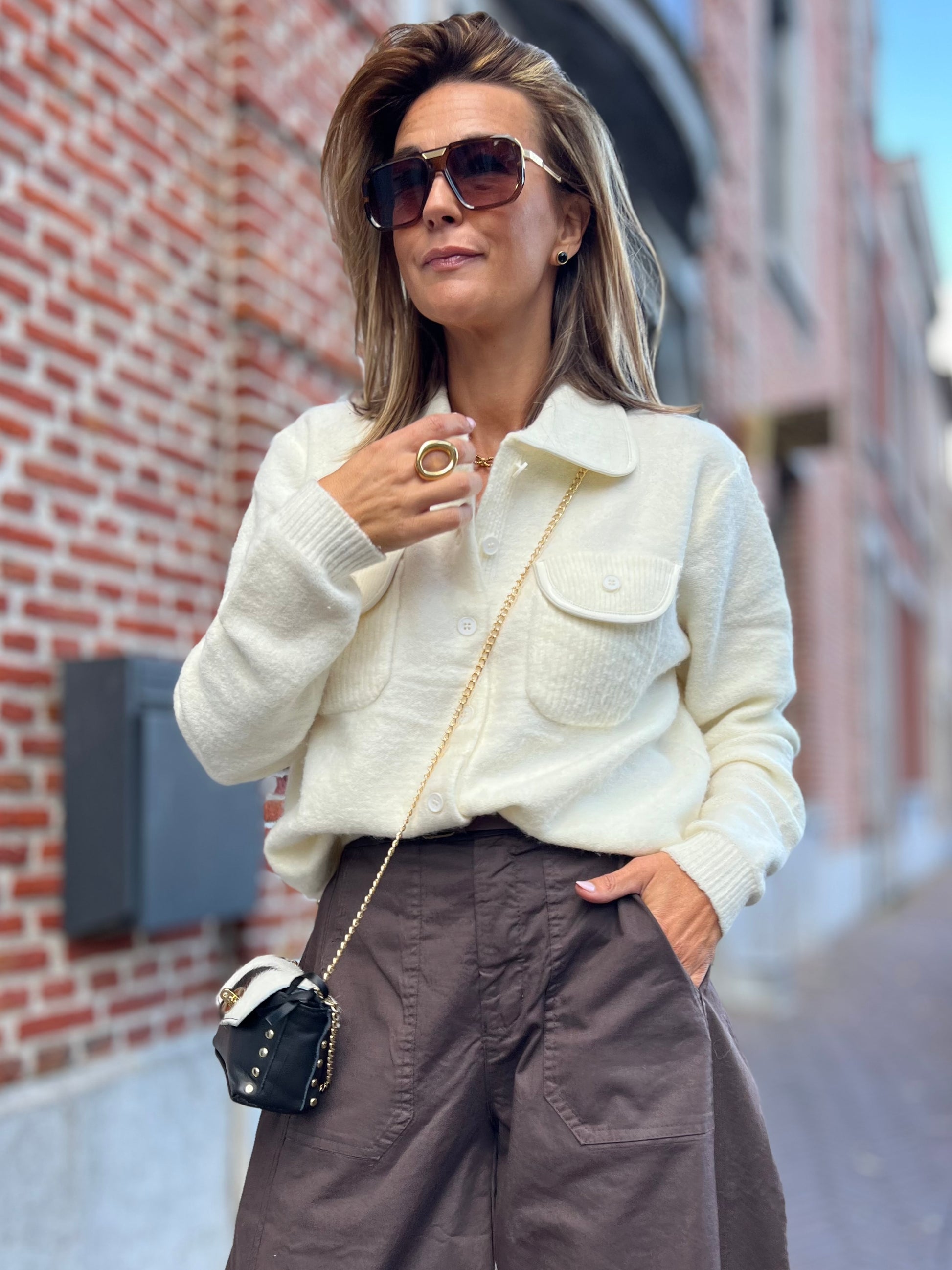 met korte en lange goudkleurige schakelketting.