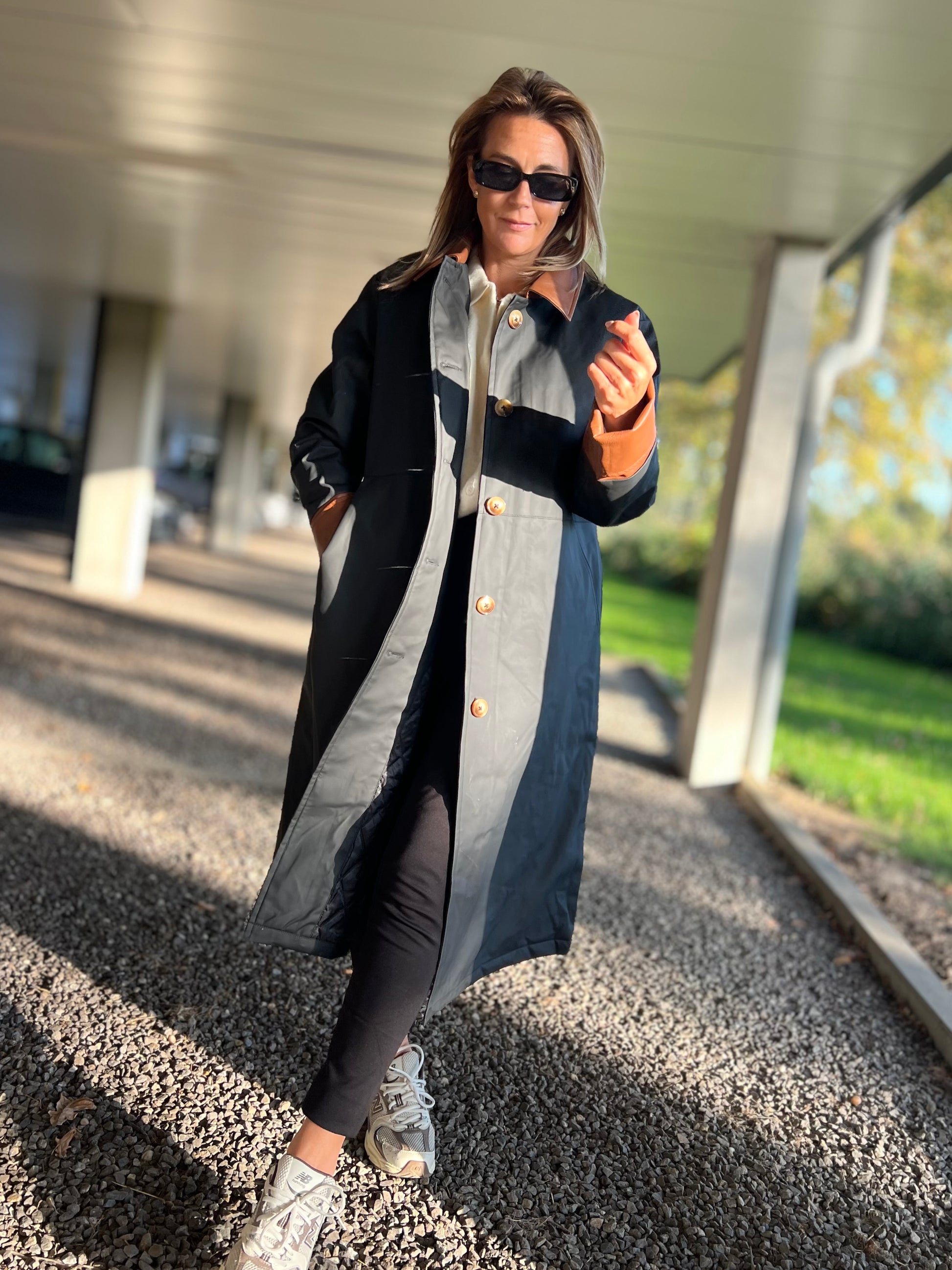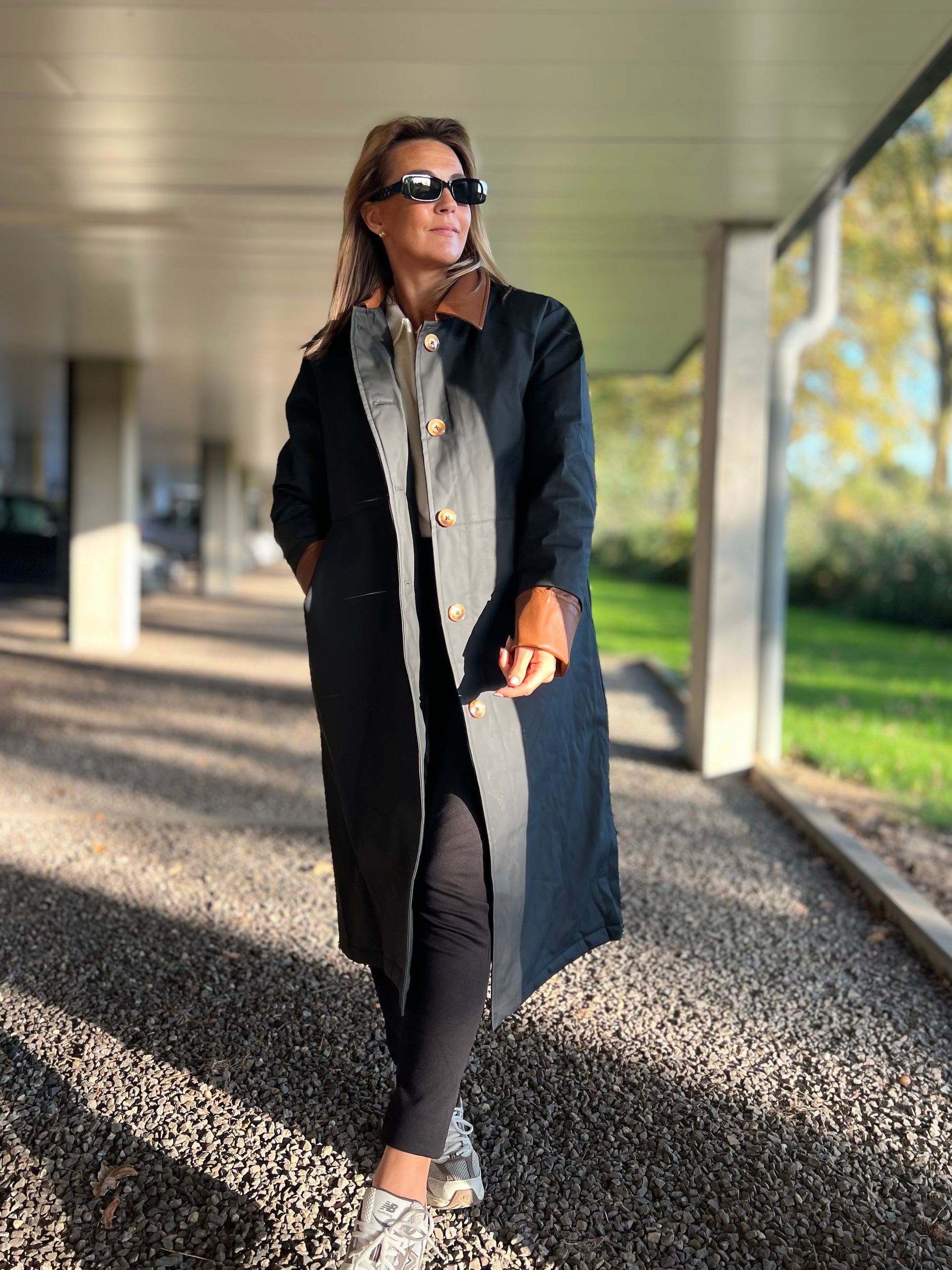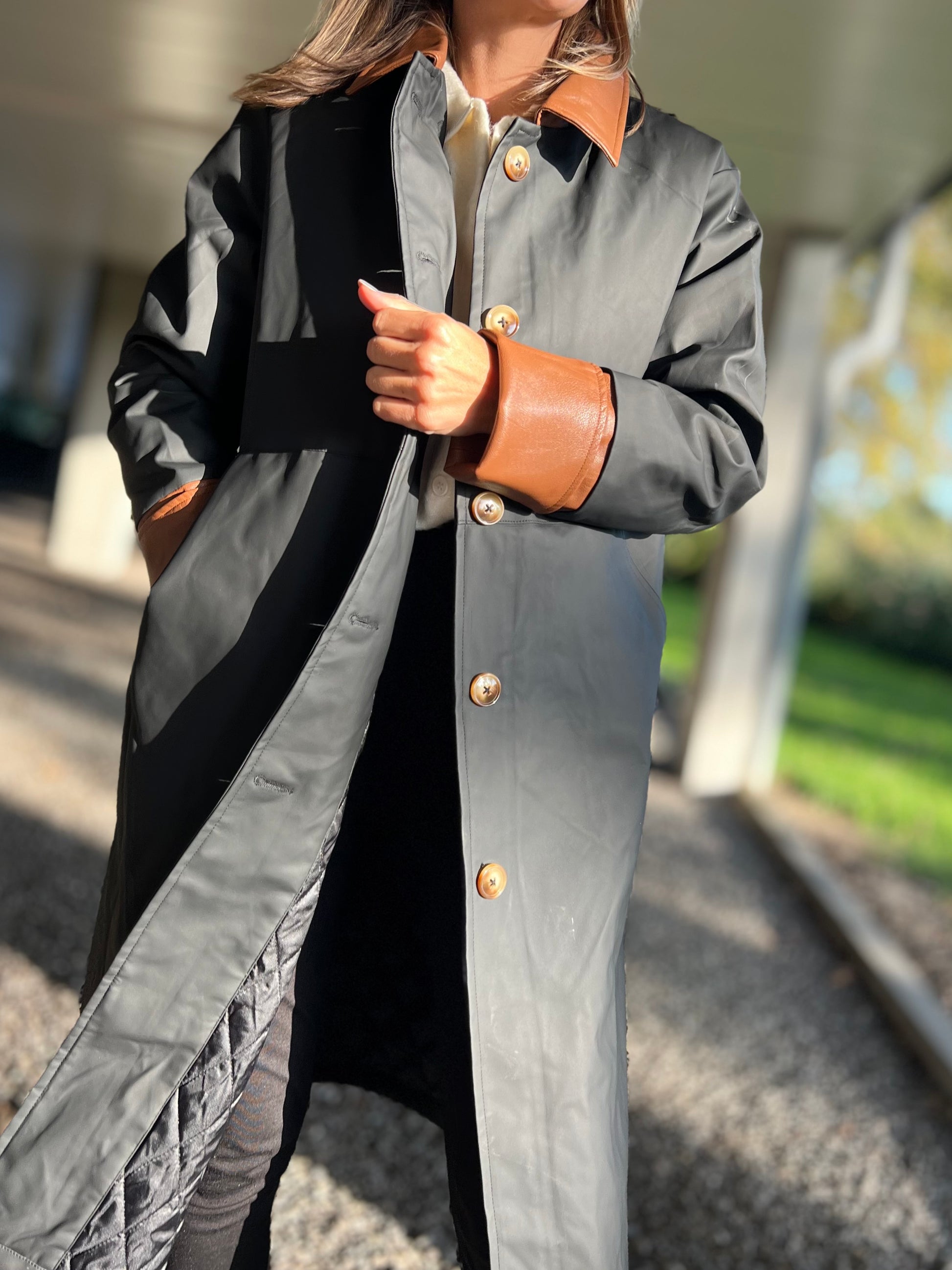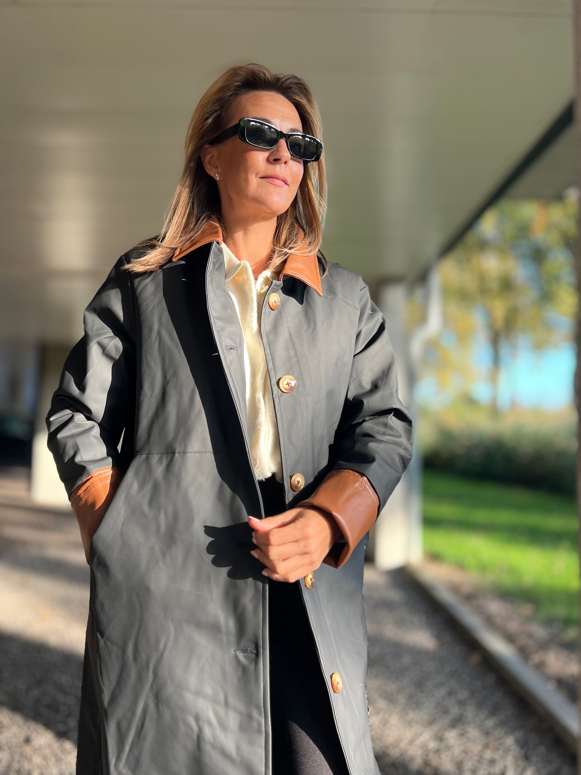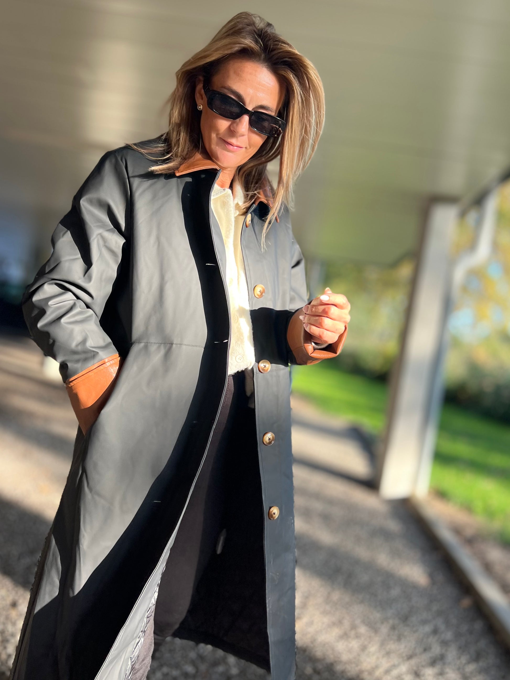 Ontdek tijdloze elegantie met deze lange trenchcoat in zwart met contrasterende kraag en manchetten in cognac. De jas heeft een rechte, moderne snit die moeiteloos over elke outfit valt — van casual tot chic. De glanzende knopen en subtiele details geven hem een luxueuze uitstraling, terwijl de waterafstotende stof zorgt voor comfort en functionaliteit in elk seizoen.