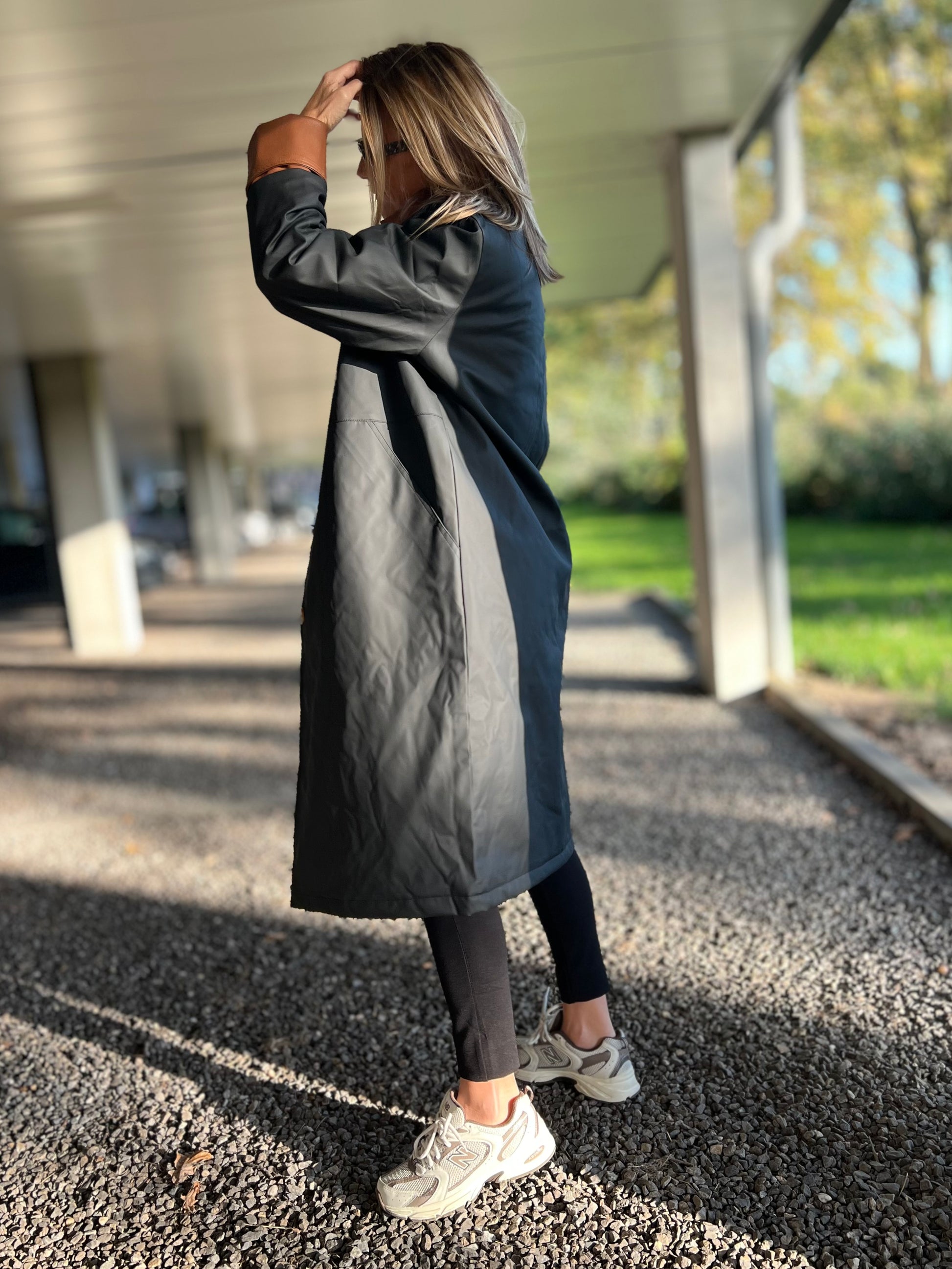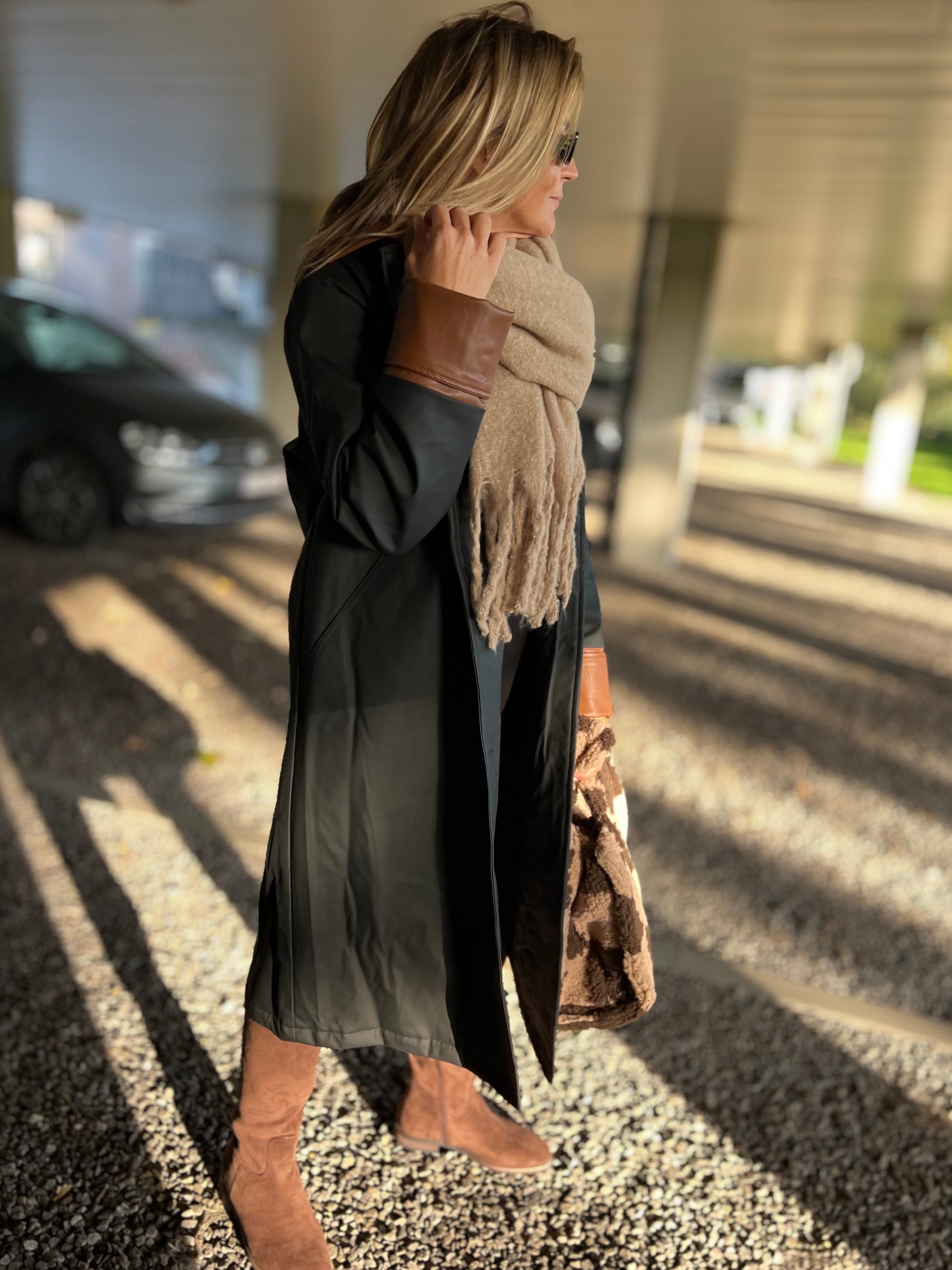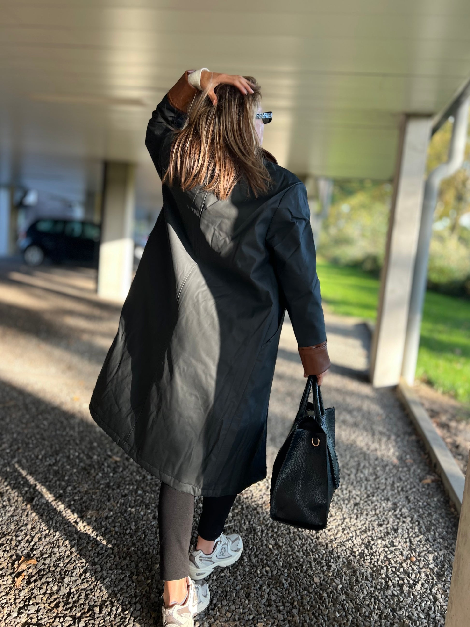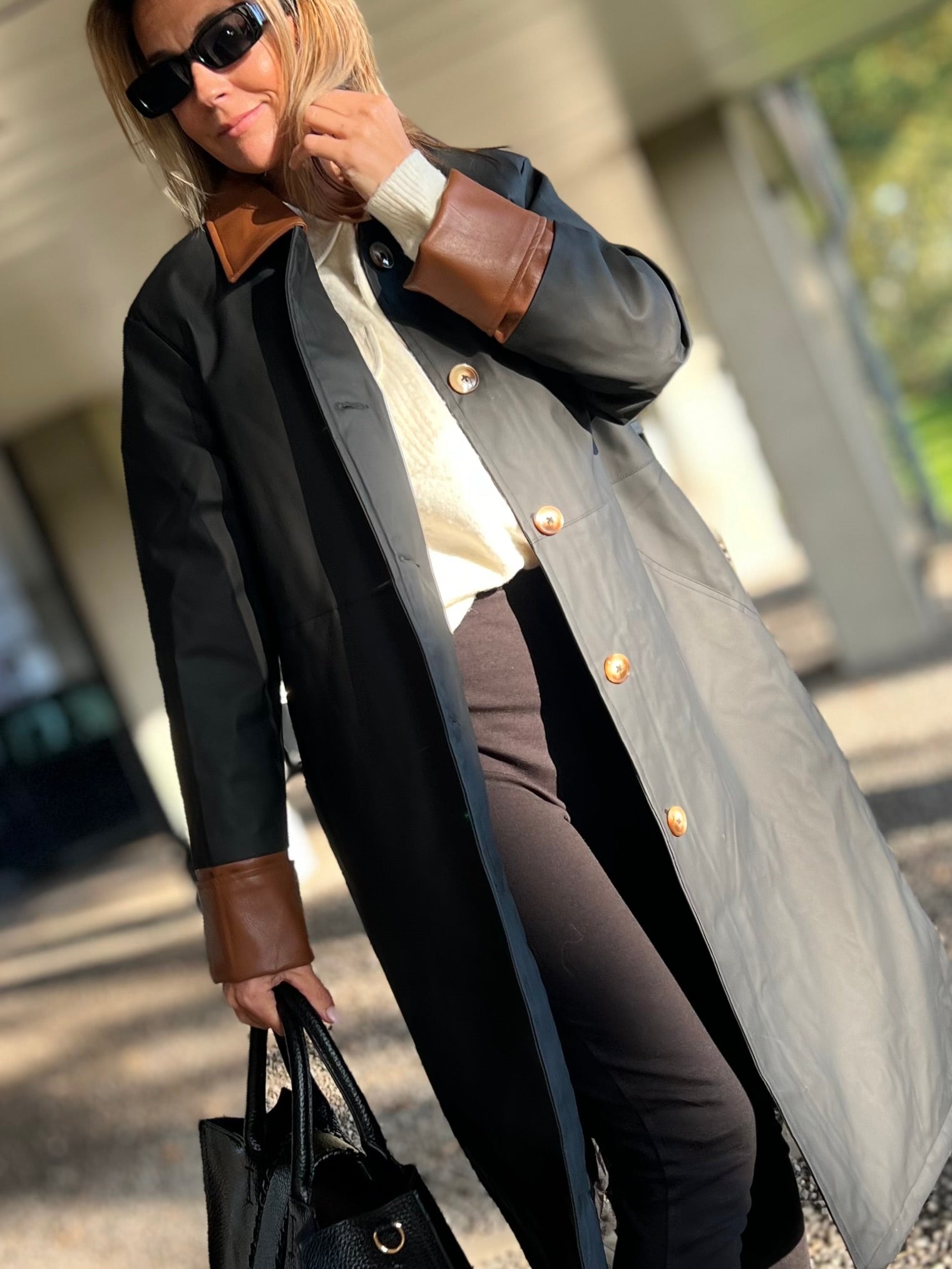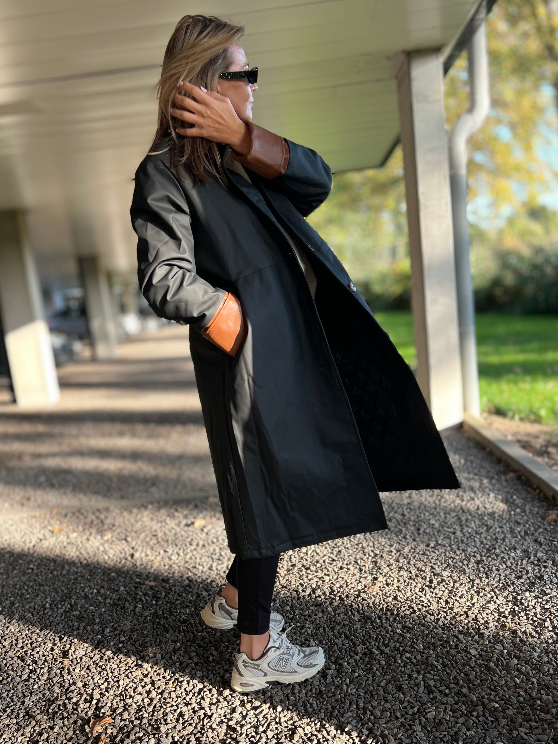 Ontdek tijdloze elegantie met deze lange trenchcoat in zwart met contrasterende kraag en manchetten in cognac. De jas heeft een rechte, moderne snit die moeiteloos over elke outfit valt — van casual tot chic. De glanzende knopen en subtiele details geven hem een luxueuze uitstraling, terwijl de waterafstotende stof zorgt voor comfort en functionaliteit in elk seizoen.
