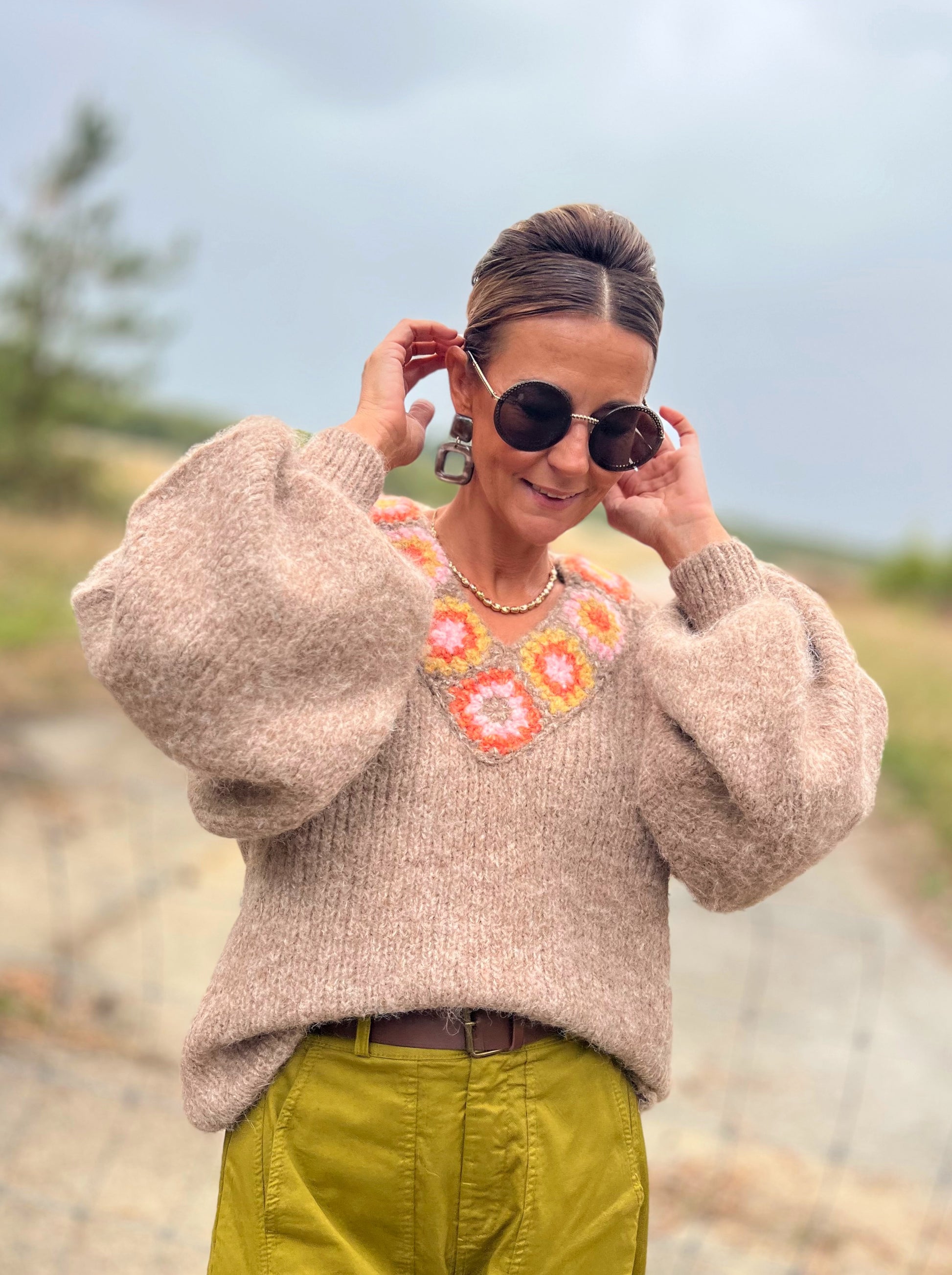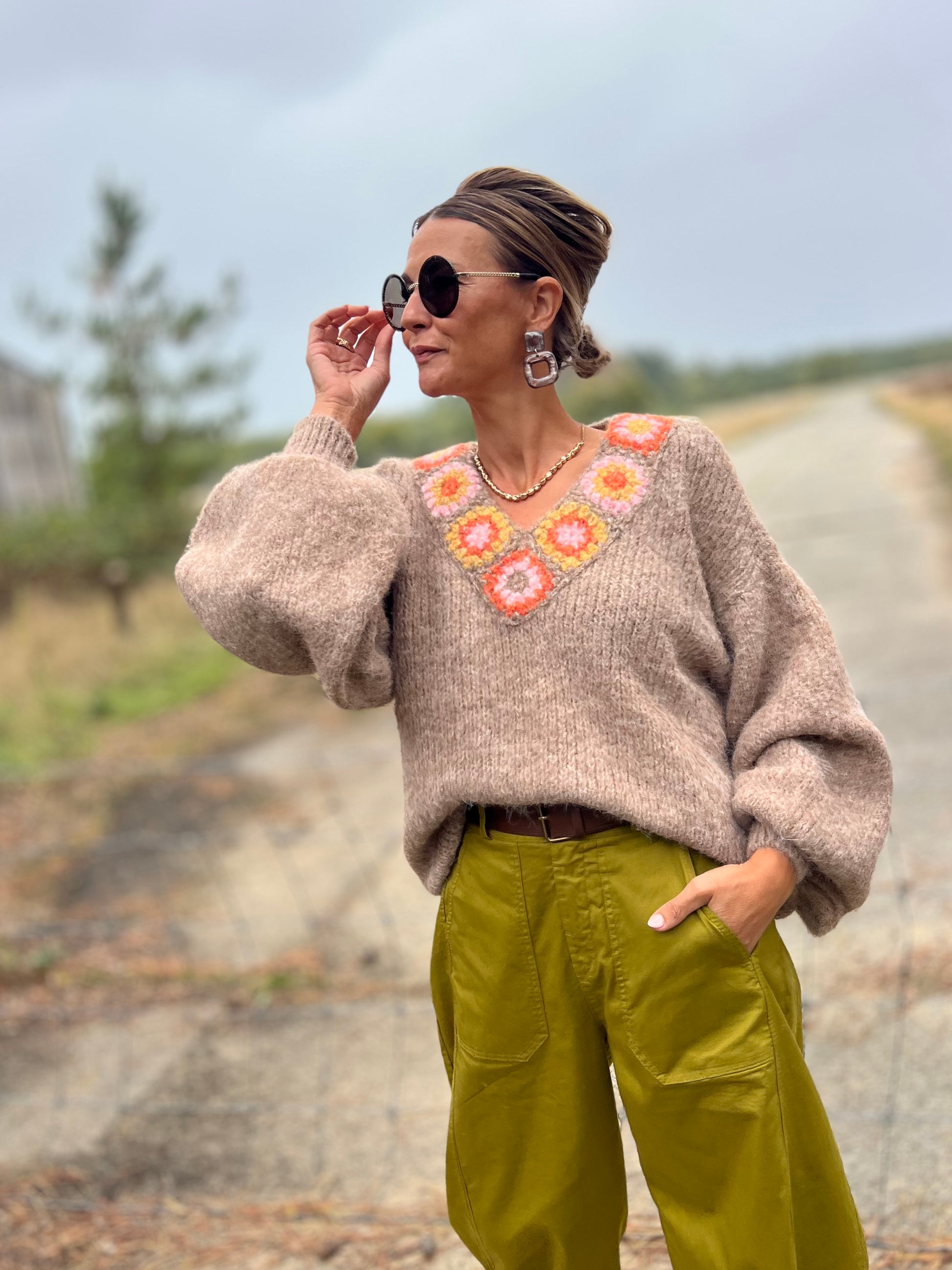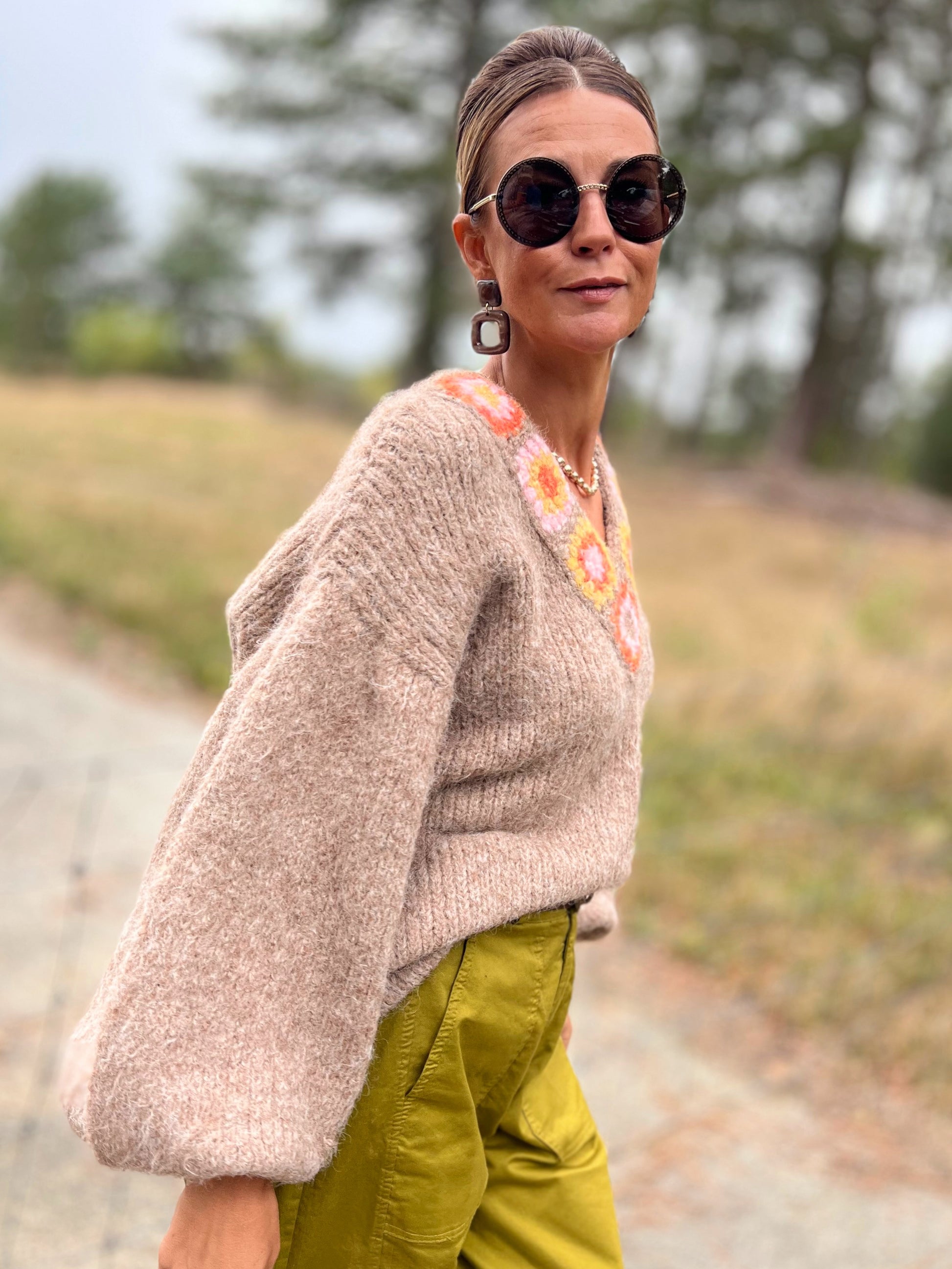 Heerlijk warme trui met v-hals en bloemendetail vooraan.