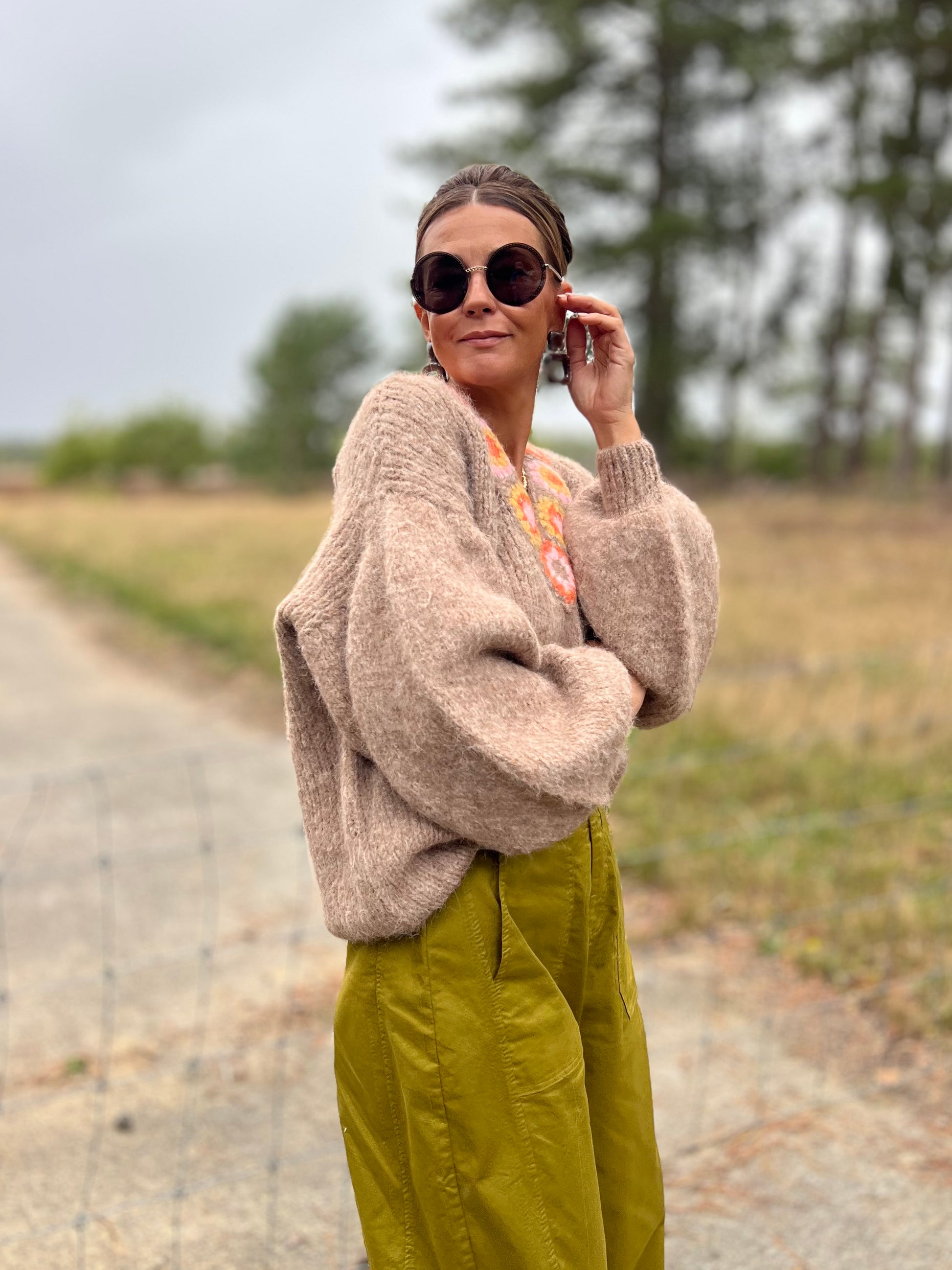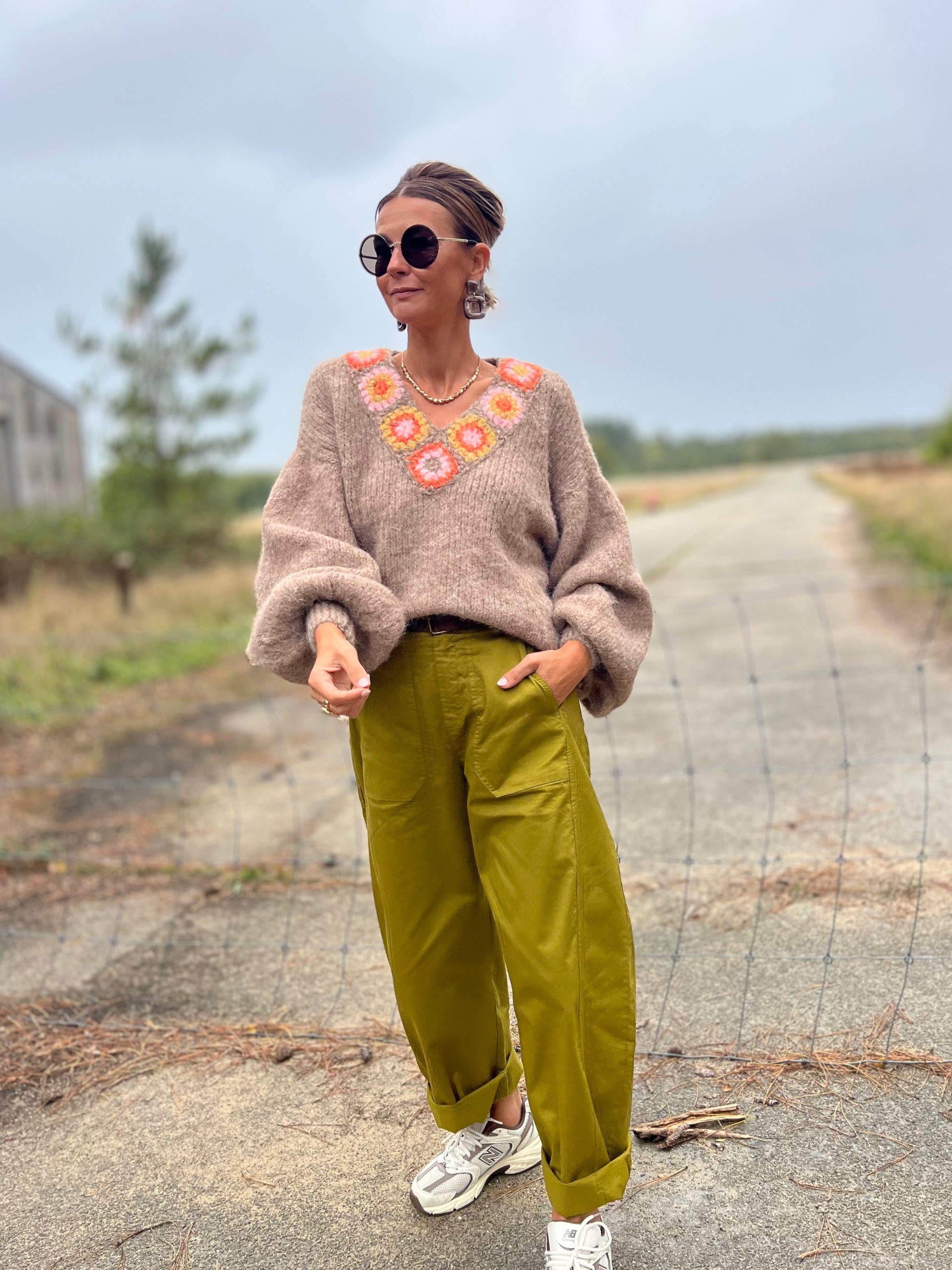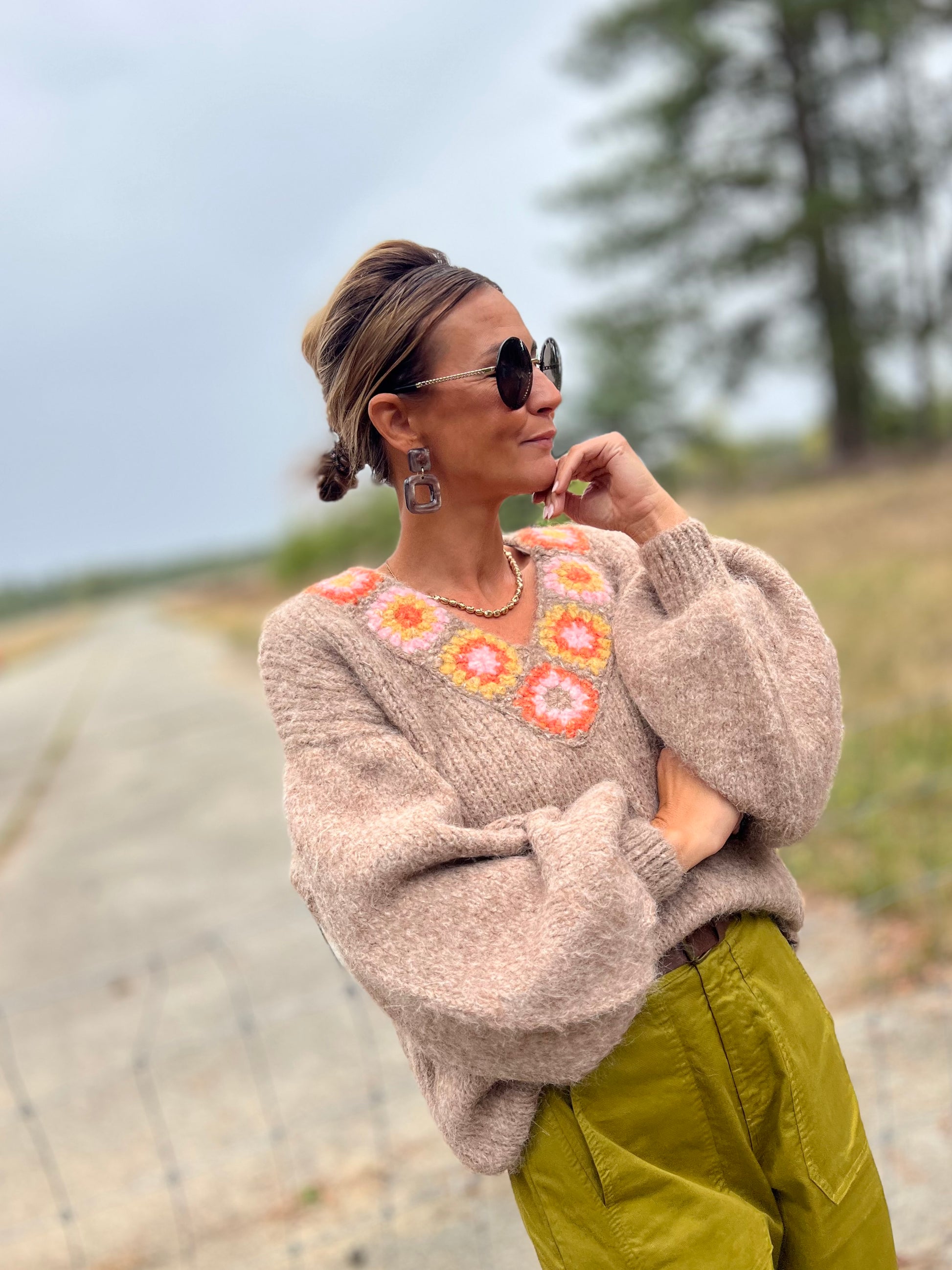 Heerlijk warme trui met v-hals en bloemendetail vooraan.