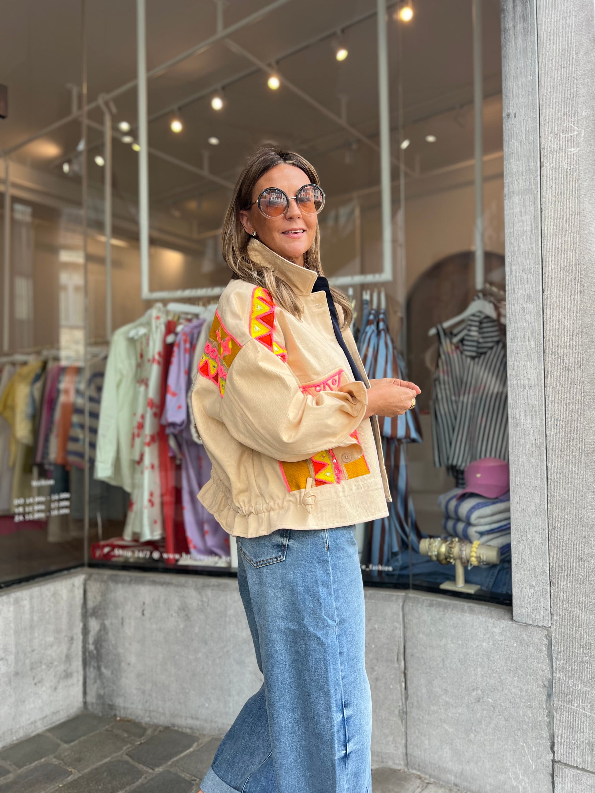 Deze unieke in een warm beige basis krijgt een speelse, opvallende twist dankzij de kleurrijke borduursels in warme tinten. Het cropped model en de lichte stof zorgen voor een casual, maar toch verfijnde uitstraling.