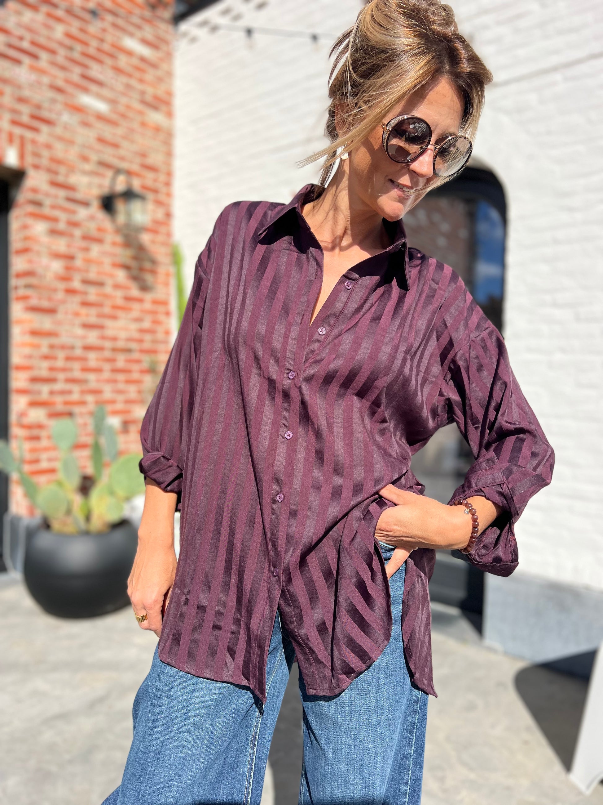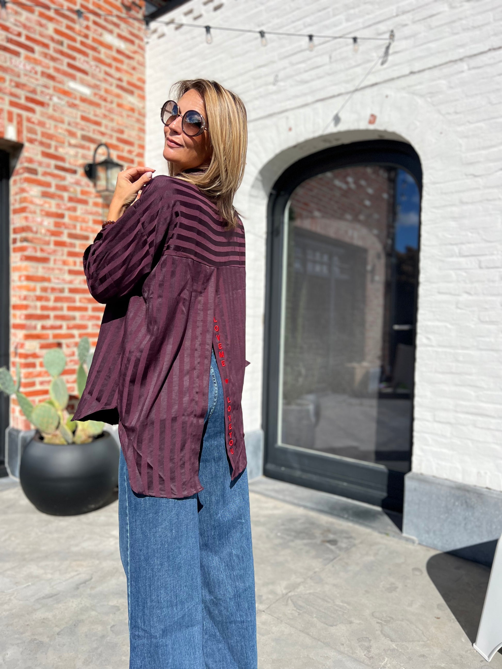 Licht glanzende blouse in bordeaux tinten en speels rugdetail.