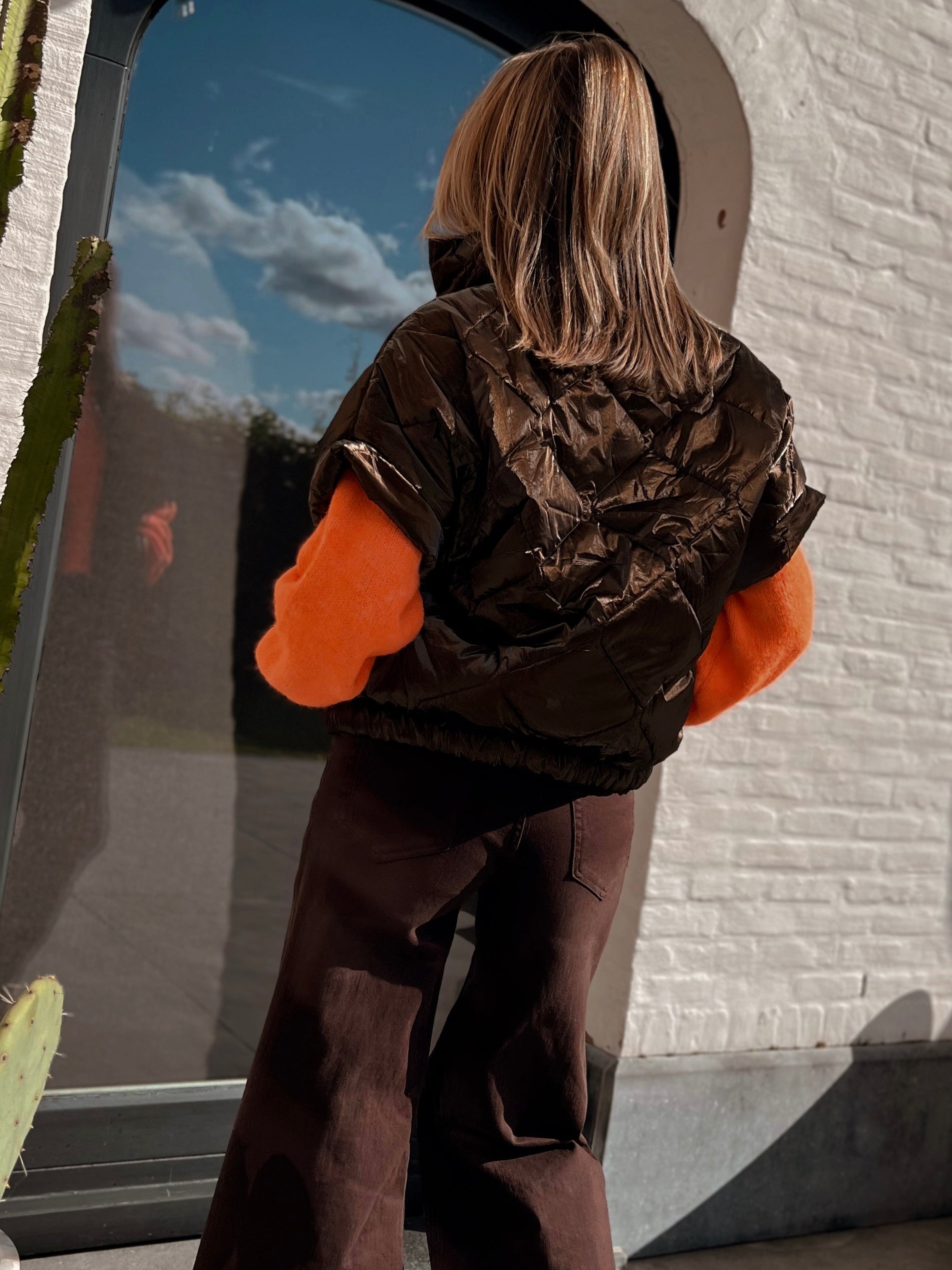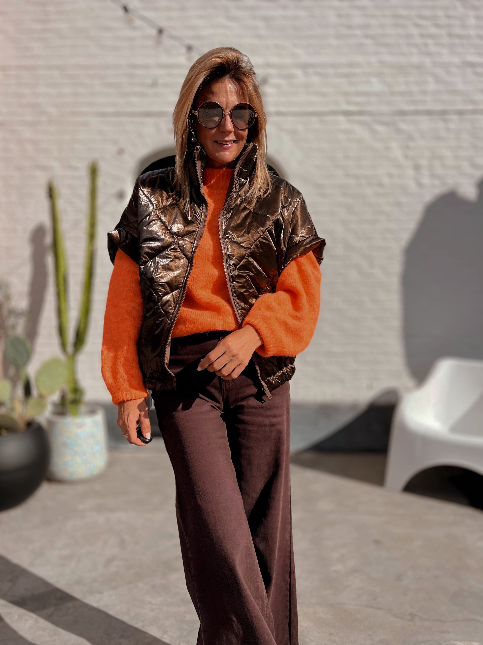 Warmbruine metallic doorstikte gilet.
