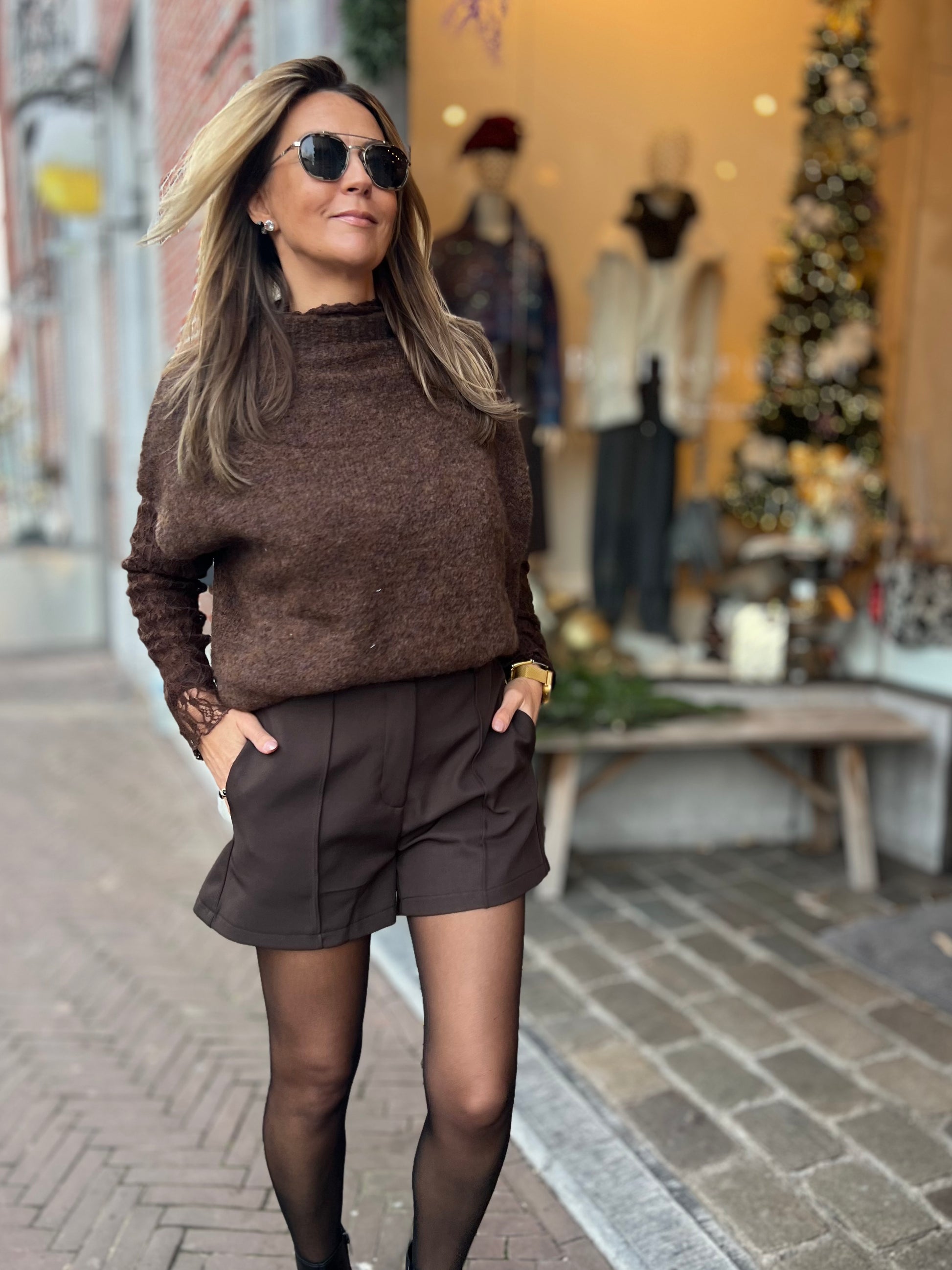 Bruine short, gekleed model met 2 zakken vooraan.