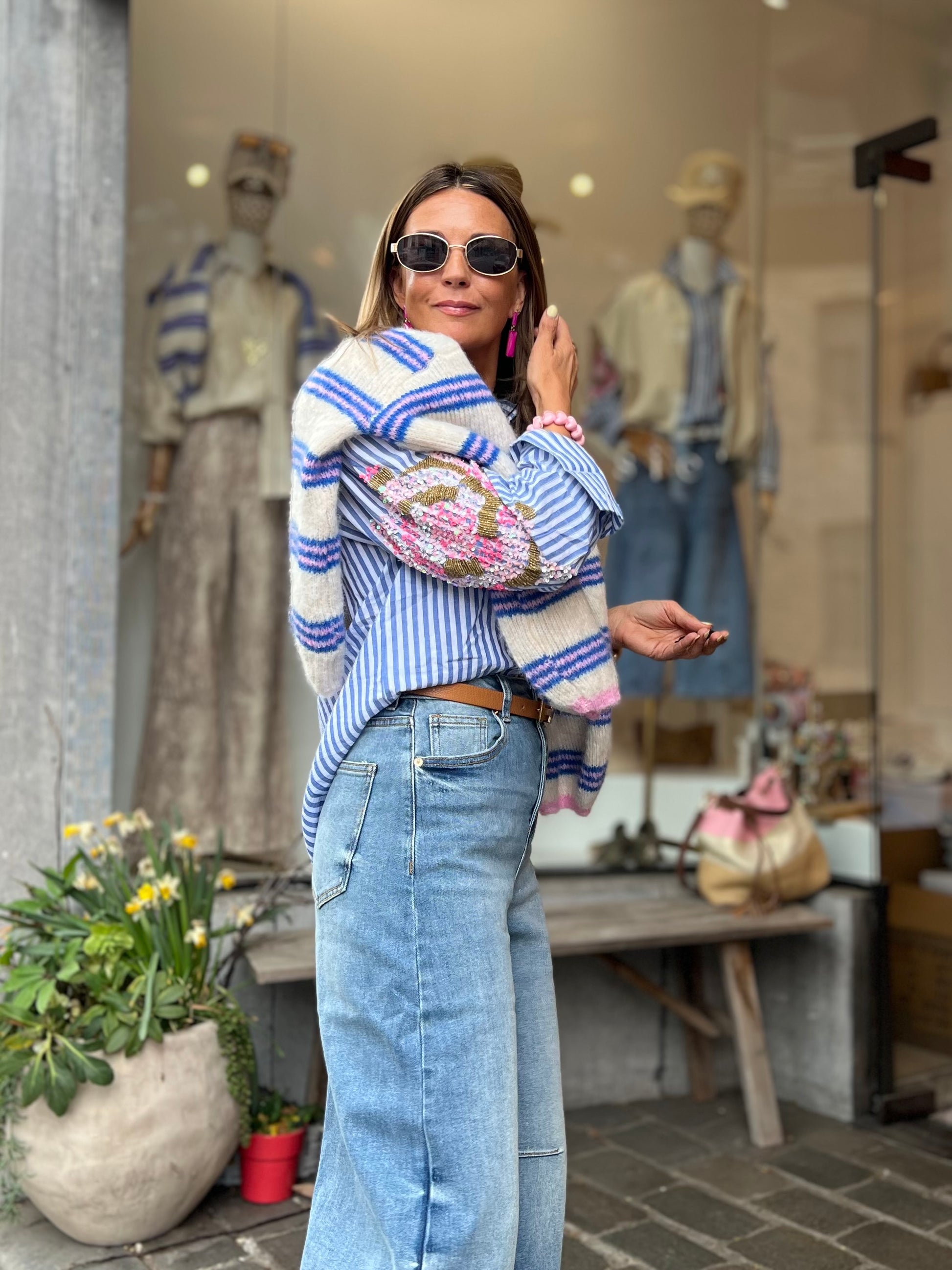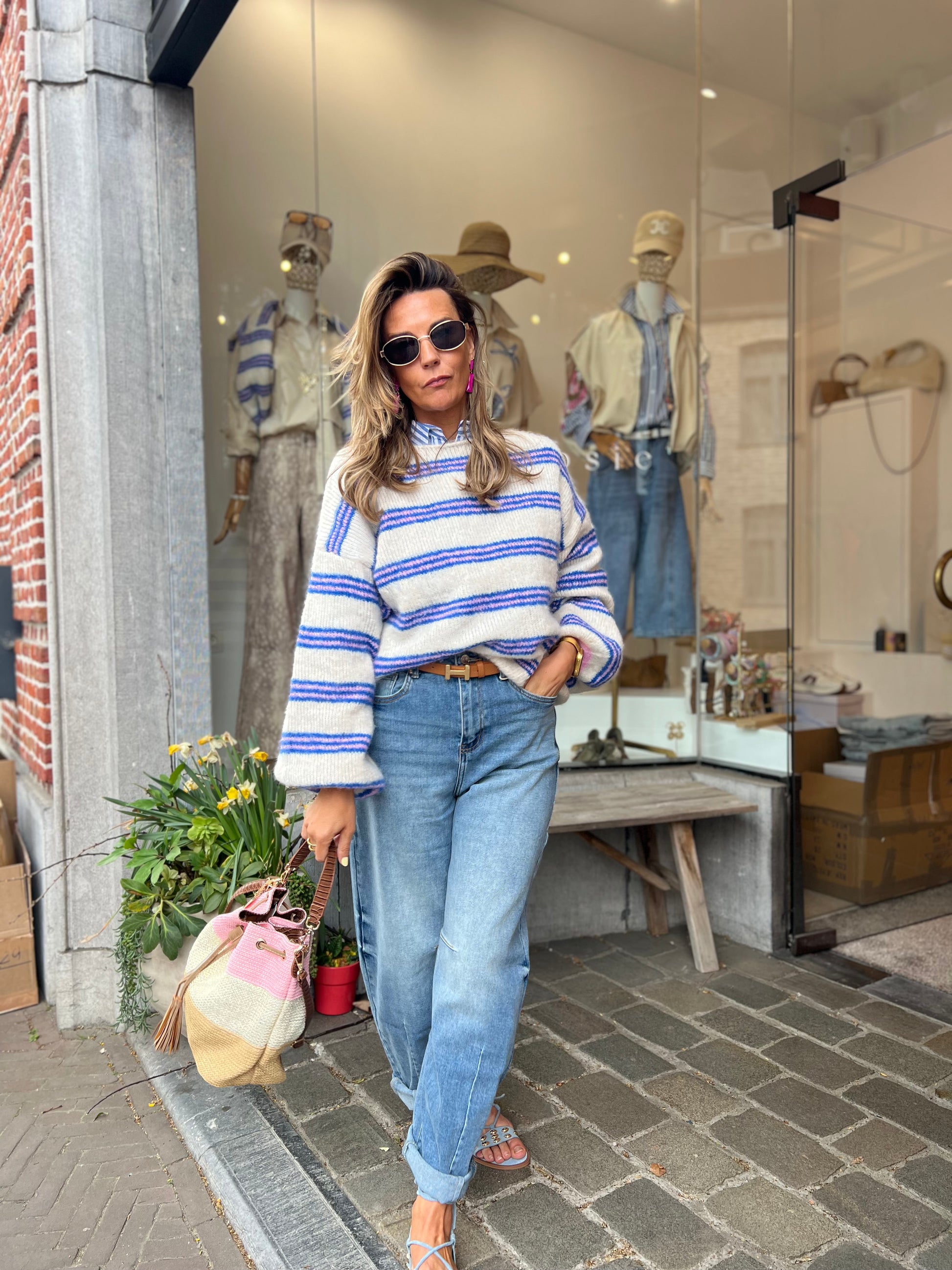 Kleuren: ecru, pastelroze en blauw