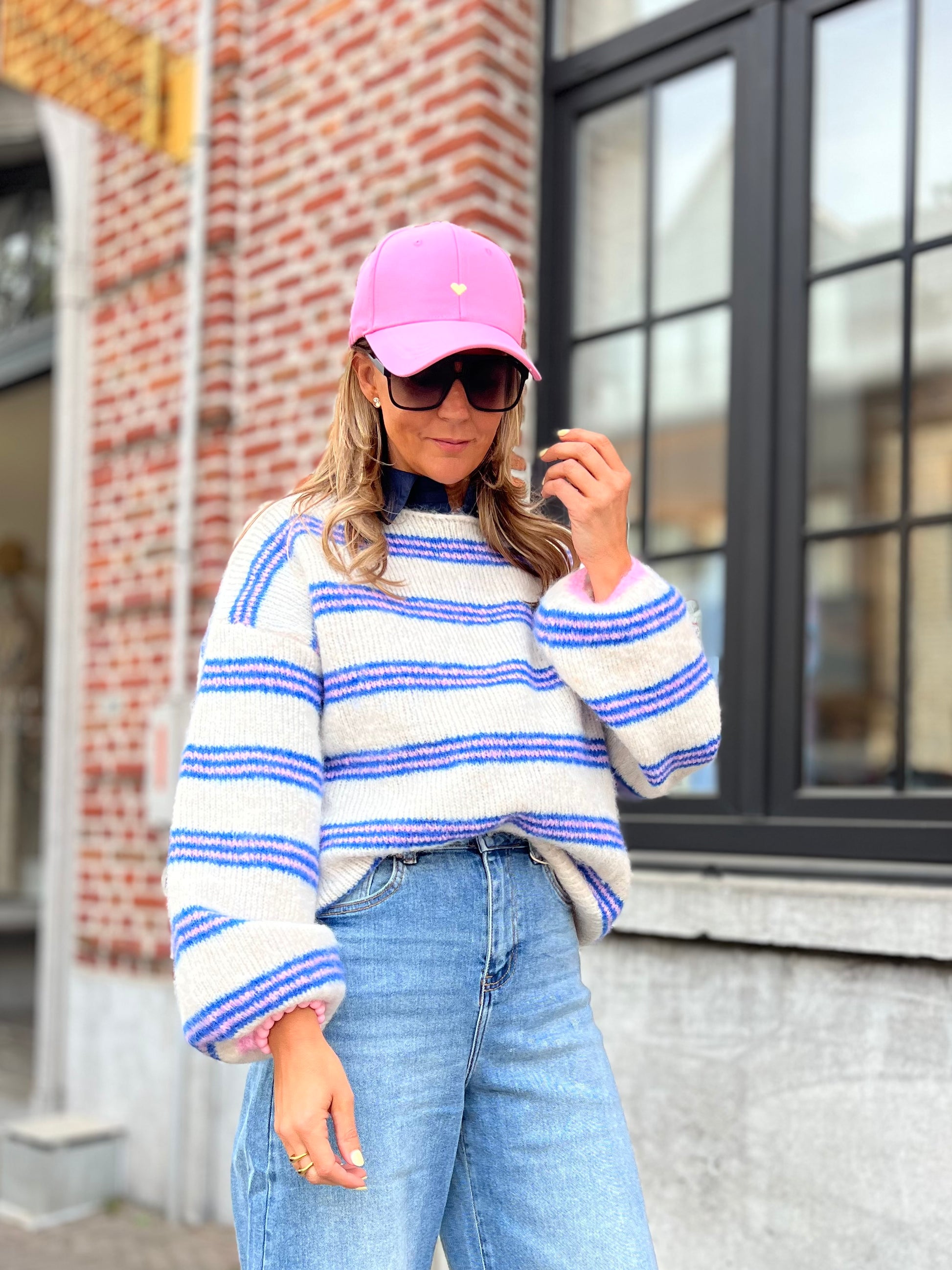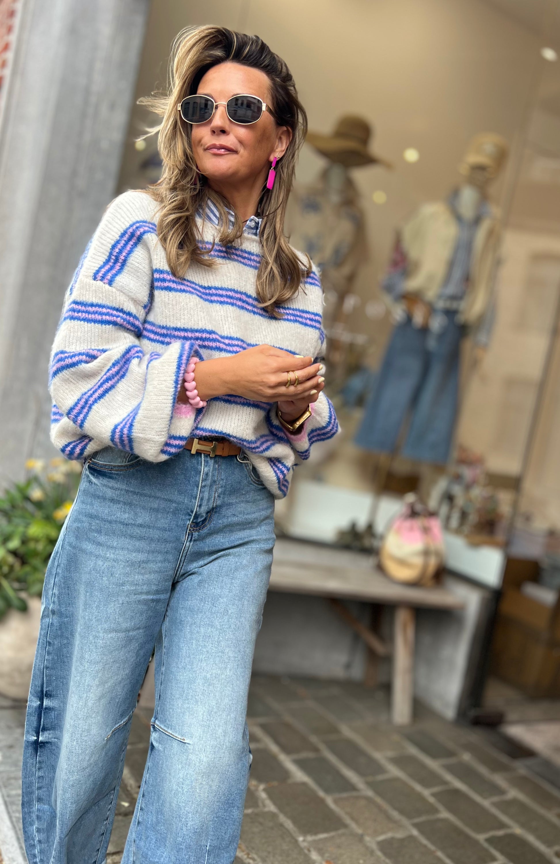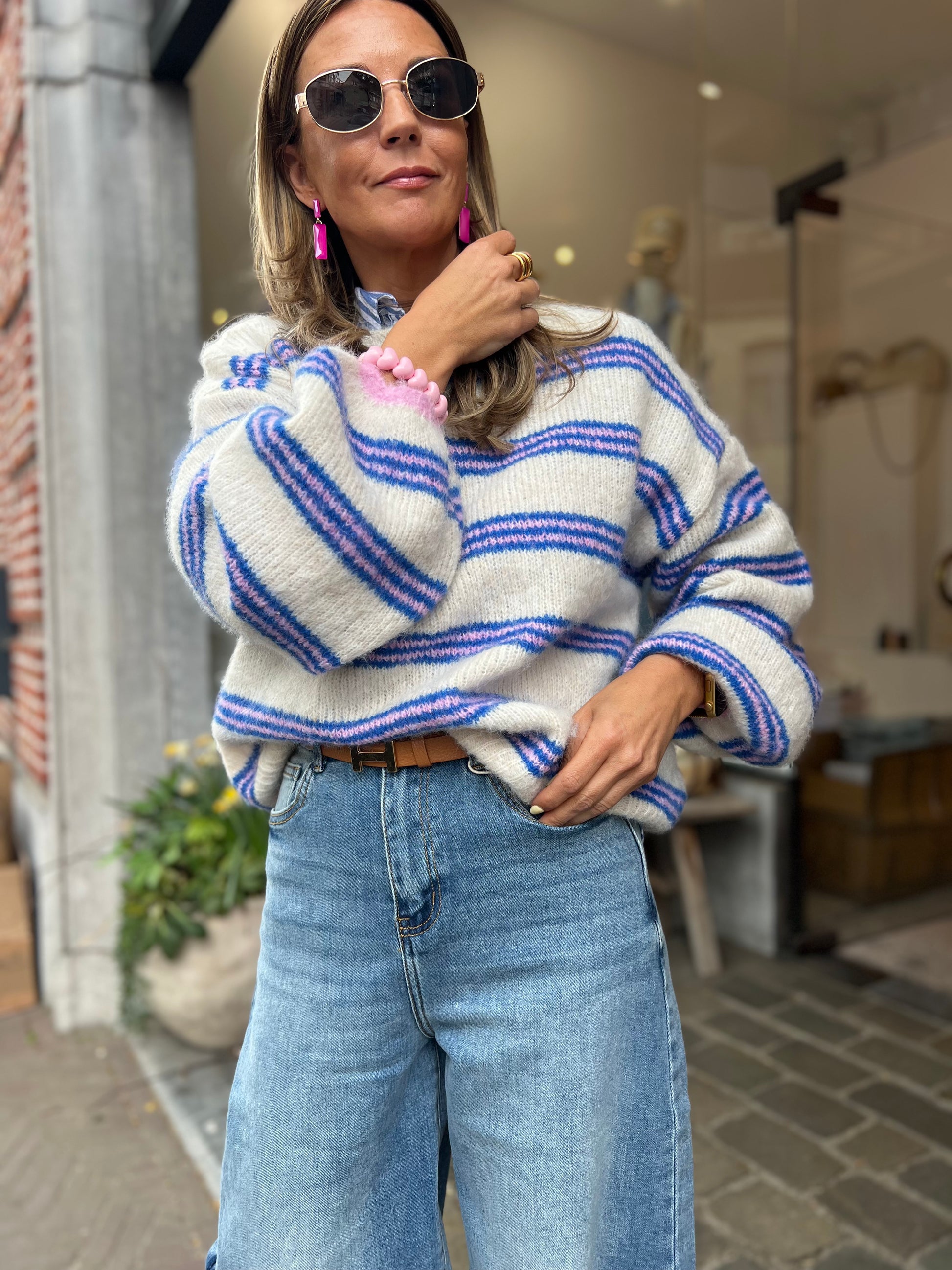 Gebreide met wijde hals en ballonmouwen.