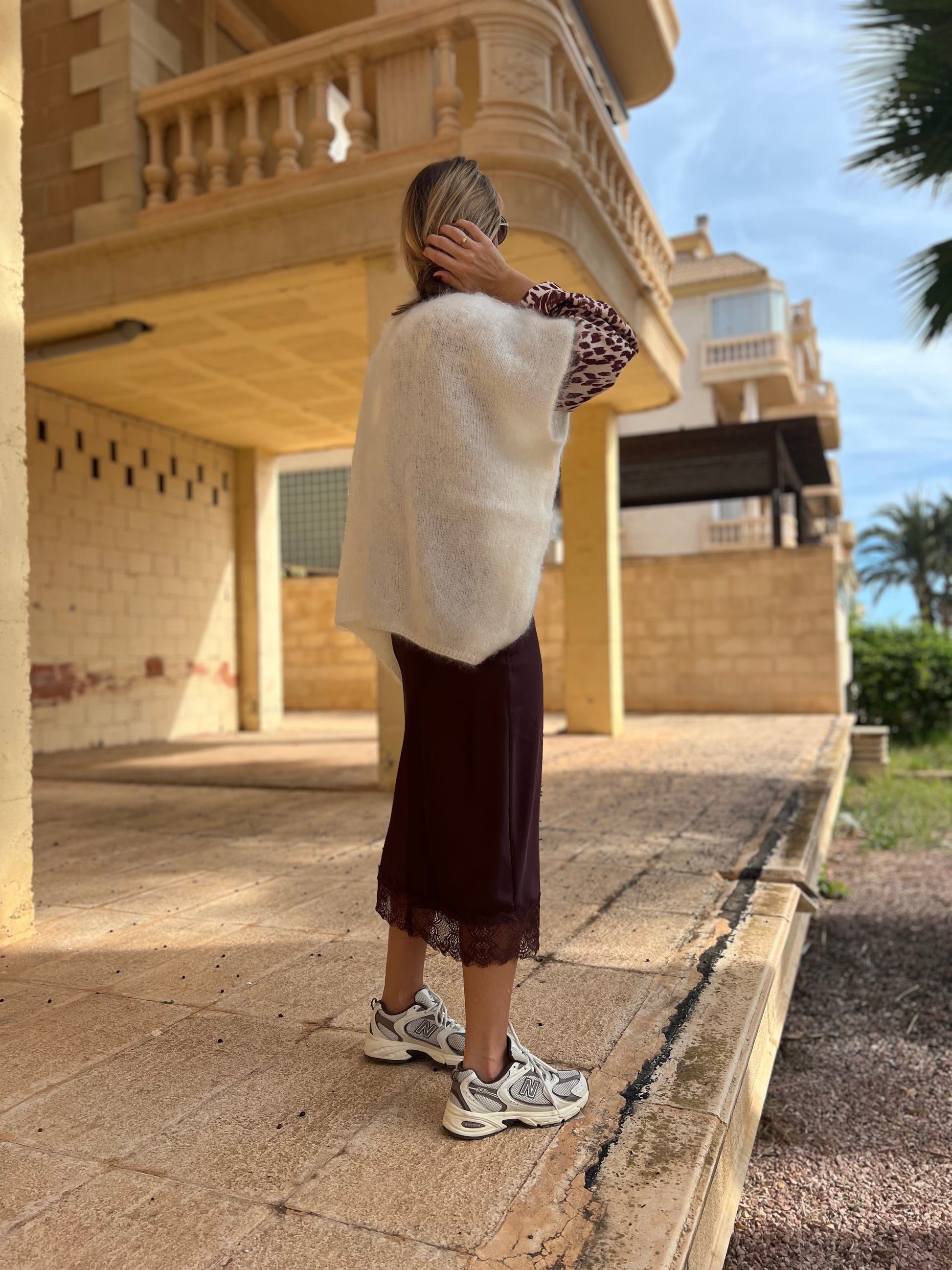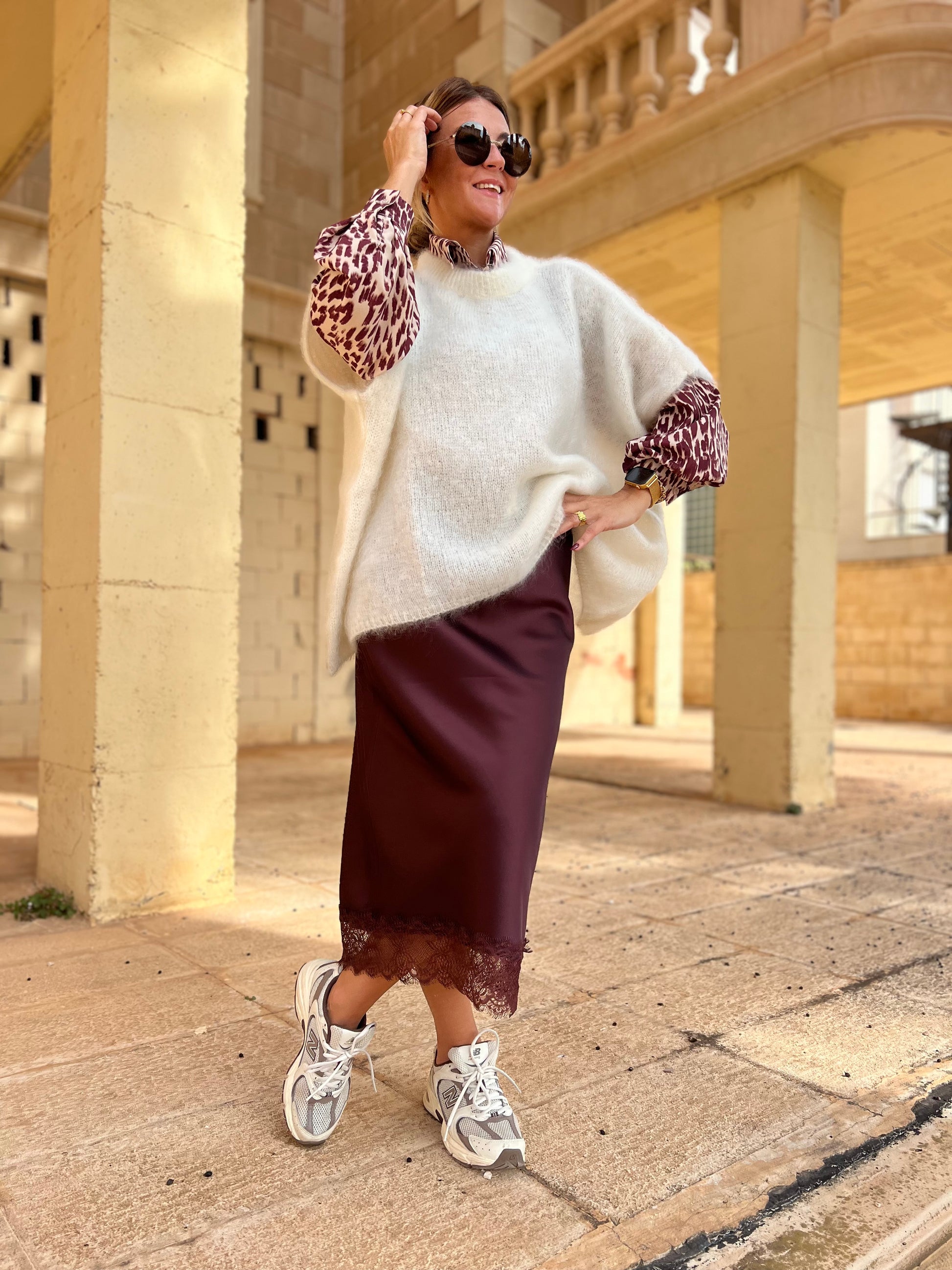 Satijnglans rok in een auberginerode kleur met elastische tailleband.