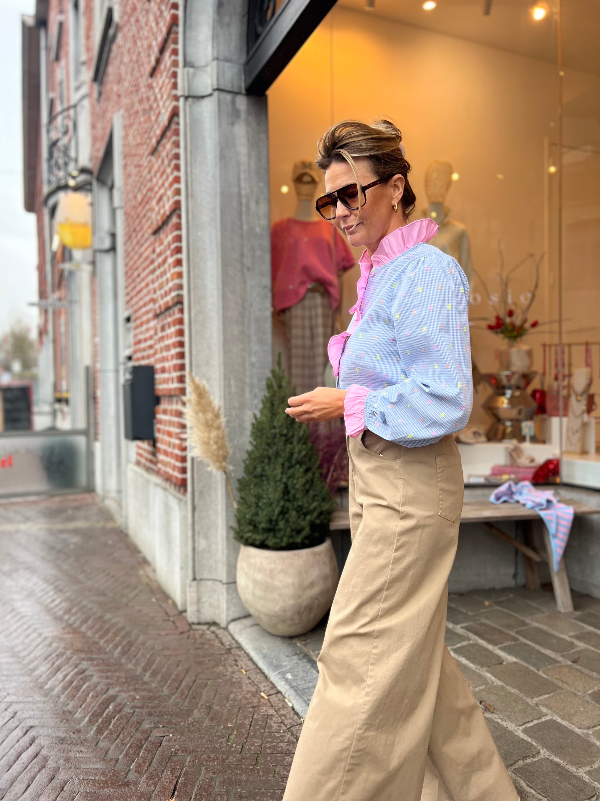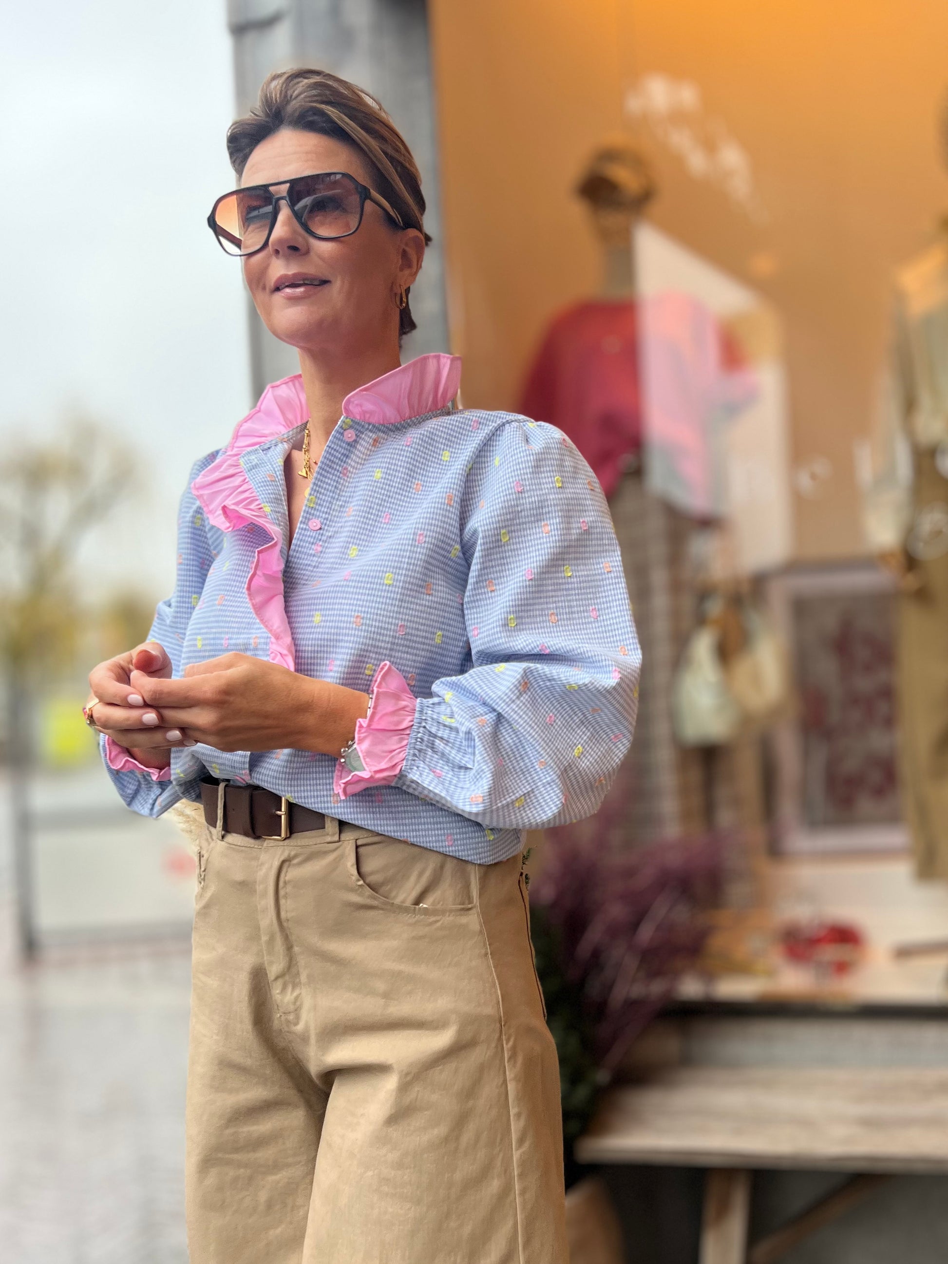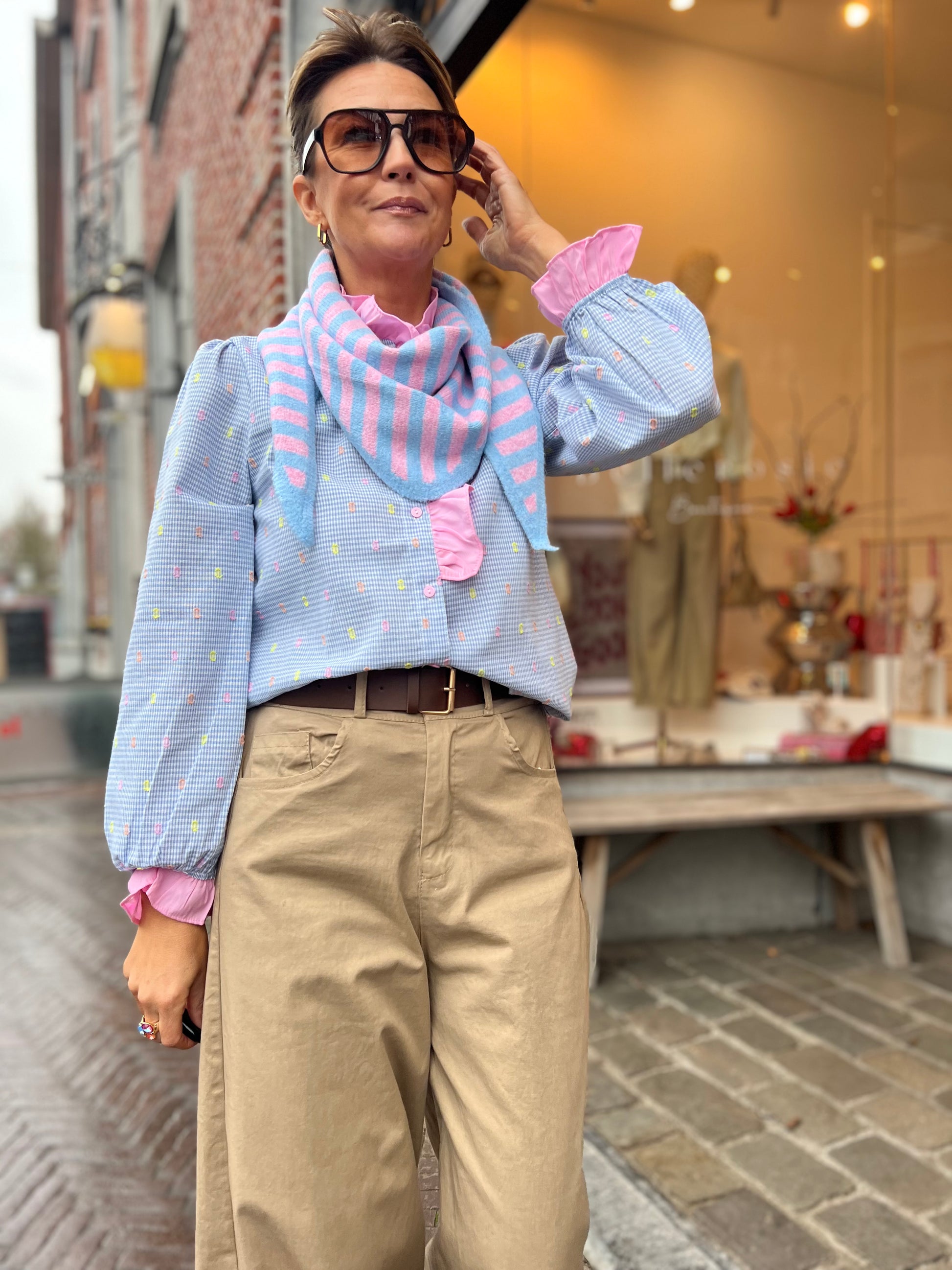 Lichtblauwe blouse met een fijn ruitje en romantisch roze ruffles details.
