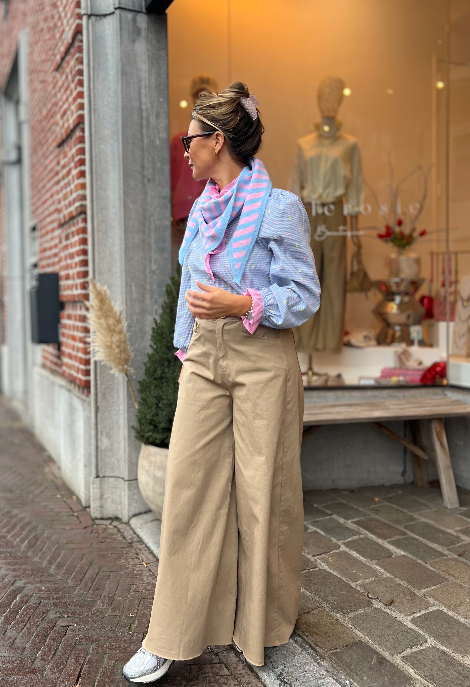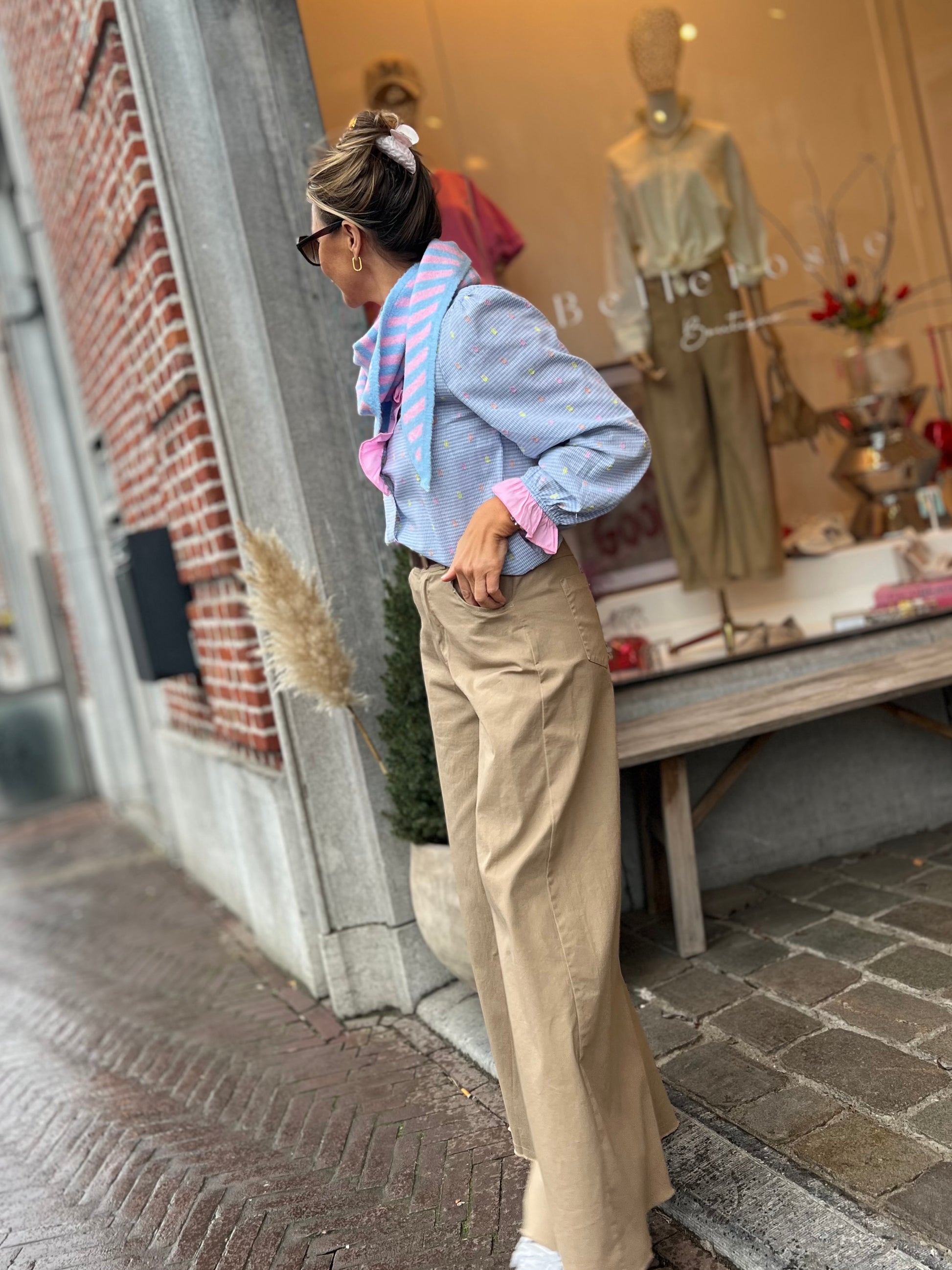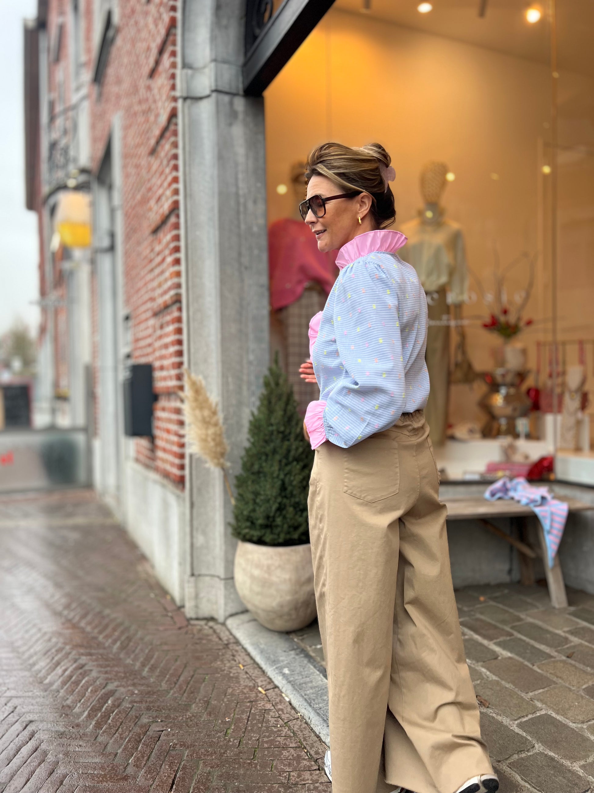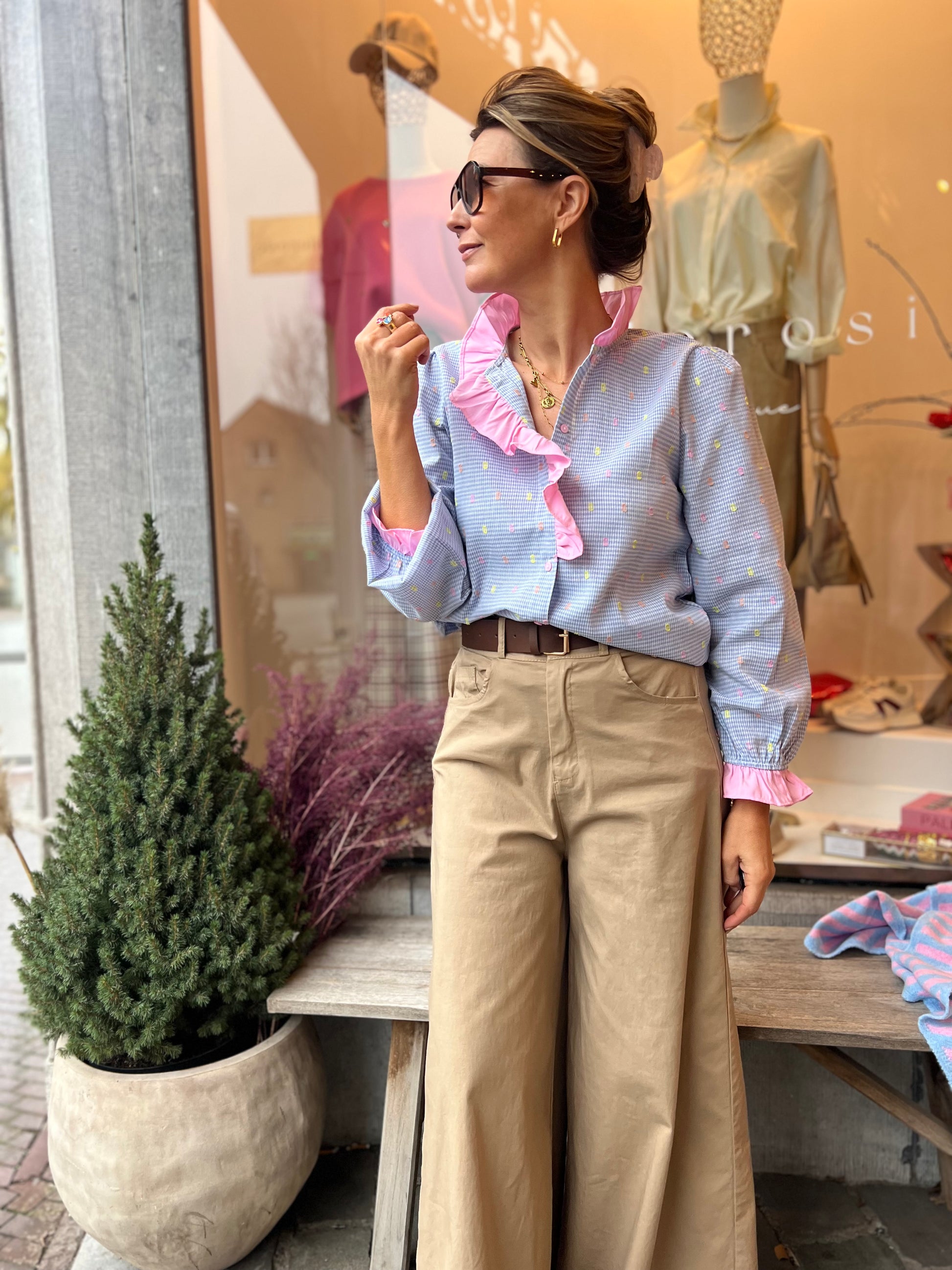 Lichtblauwe blouse met een fijn ruitje en romantisch roze ruffles details.