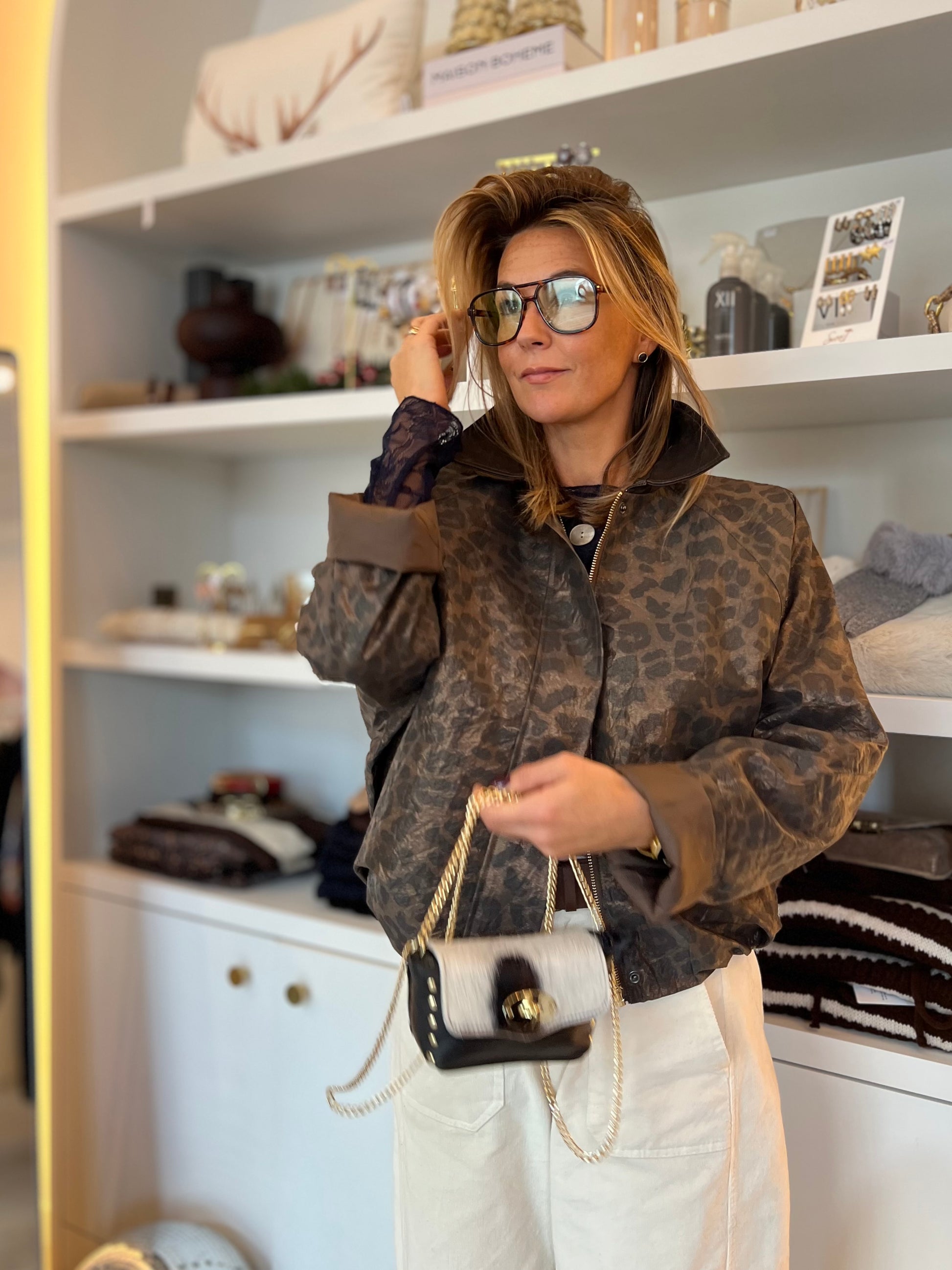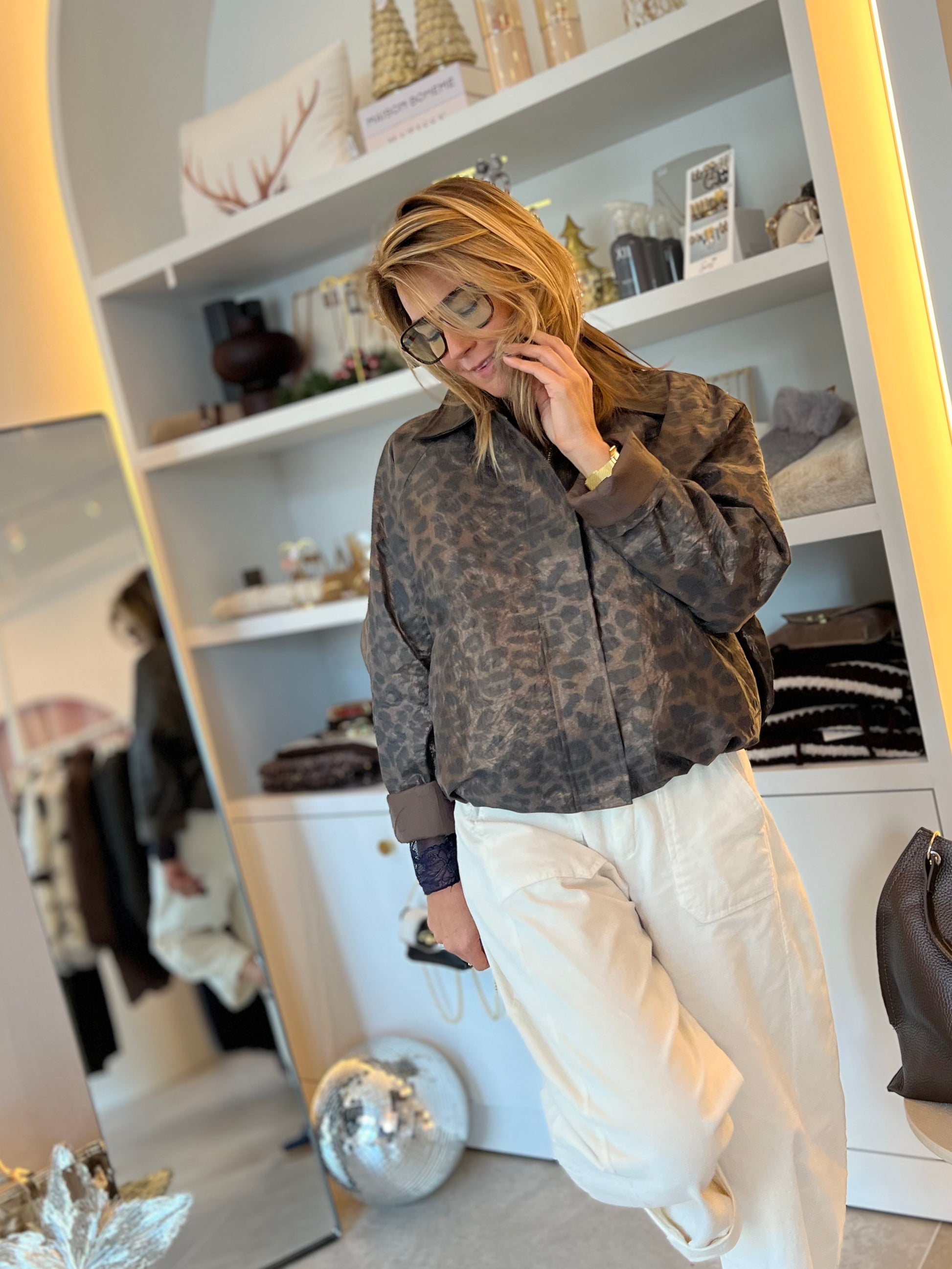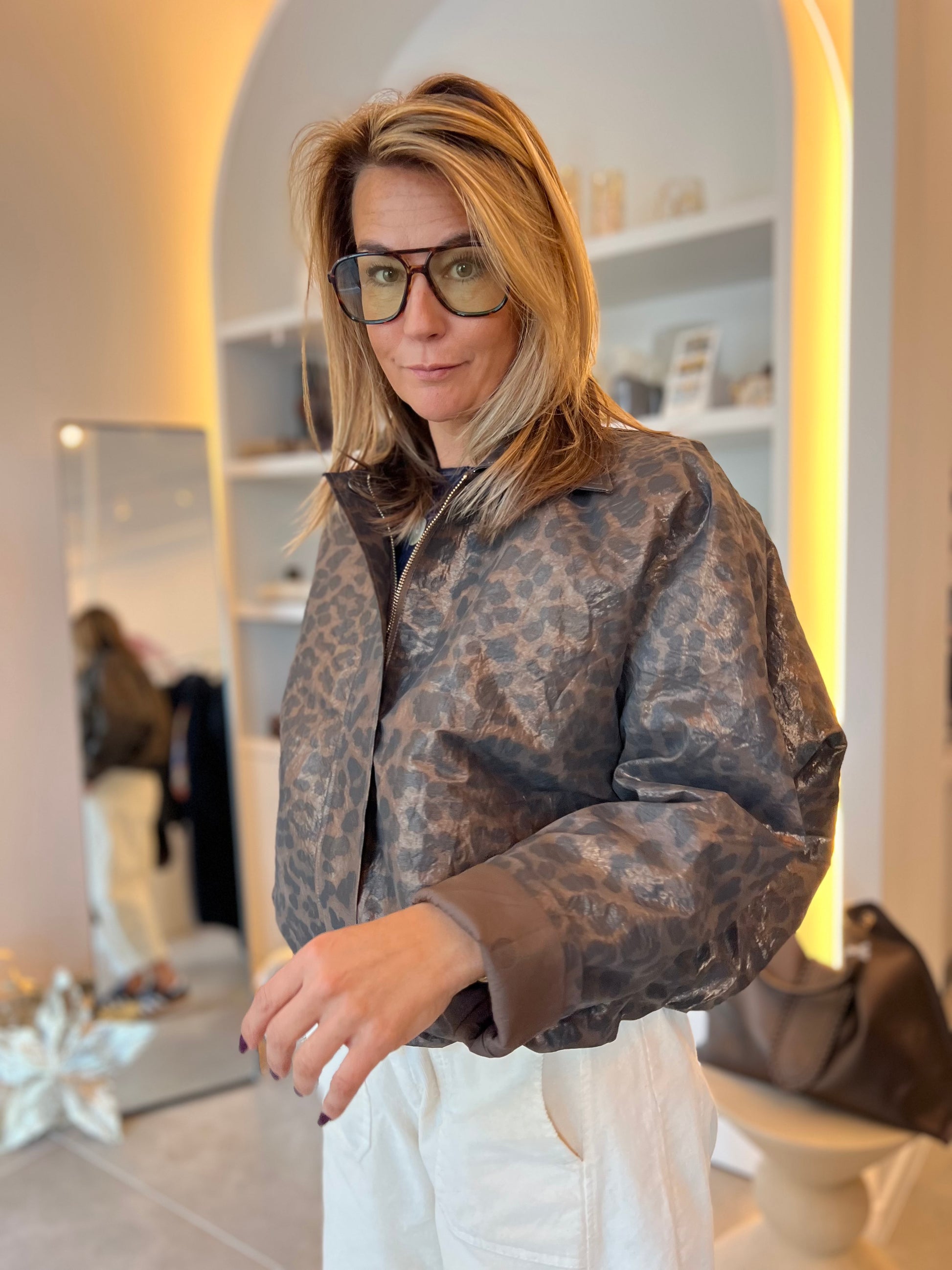 Deze unieke jas combineert een losse, moderne fit met een luxueuze glansfinish. De rijke brons-bruine leopardprint geeft hem een edgy, high-fashion uitstraling, terwijl de zachte structuur en het lichte volume zorgen voor ultiem draagcomfort.