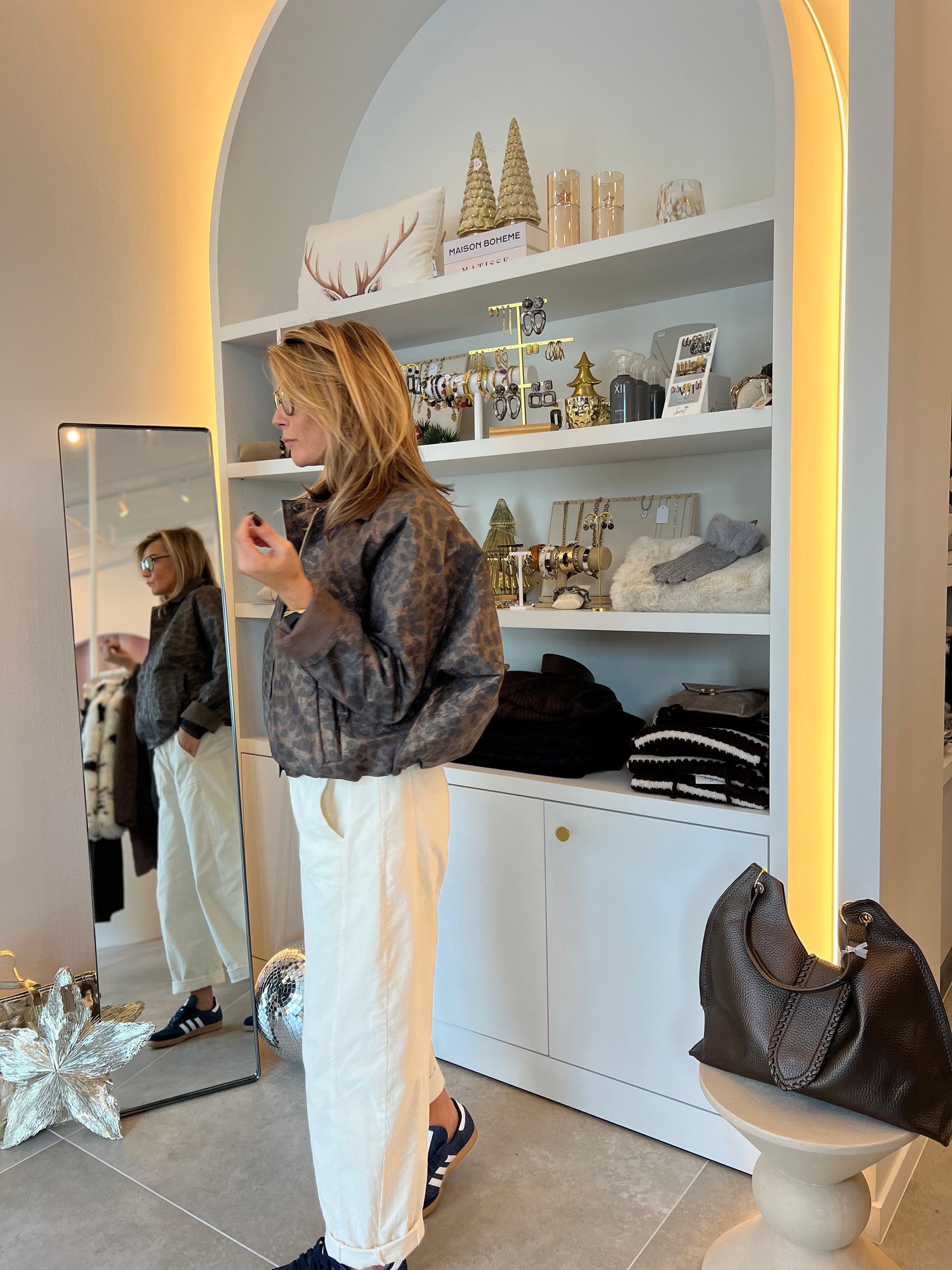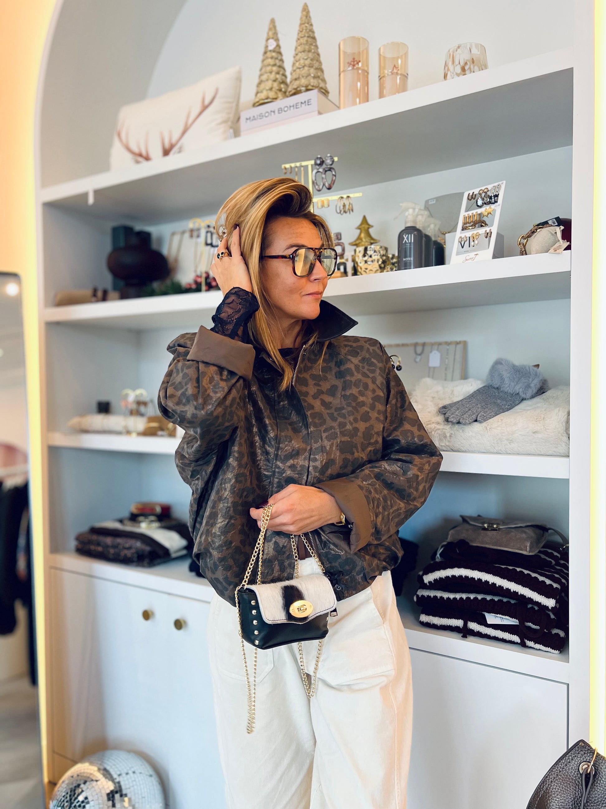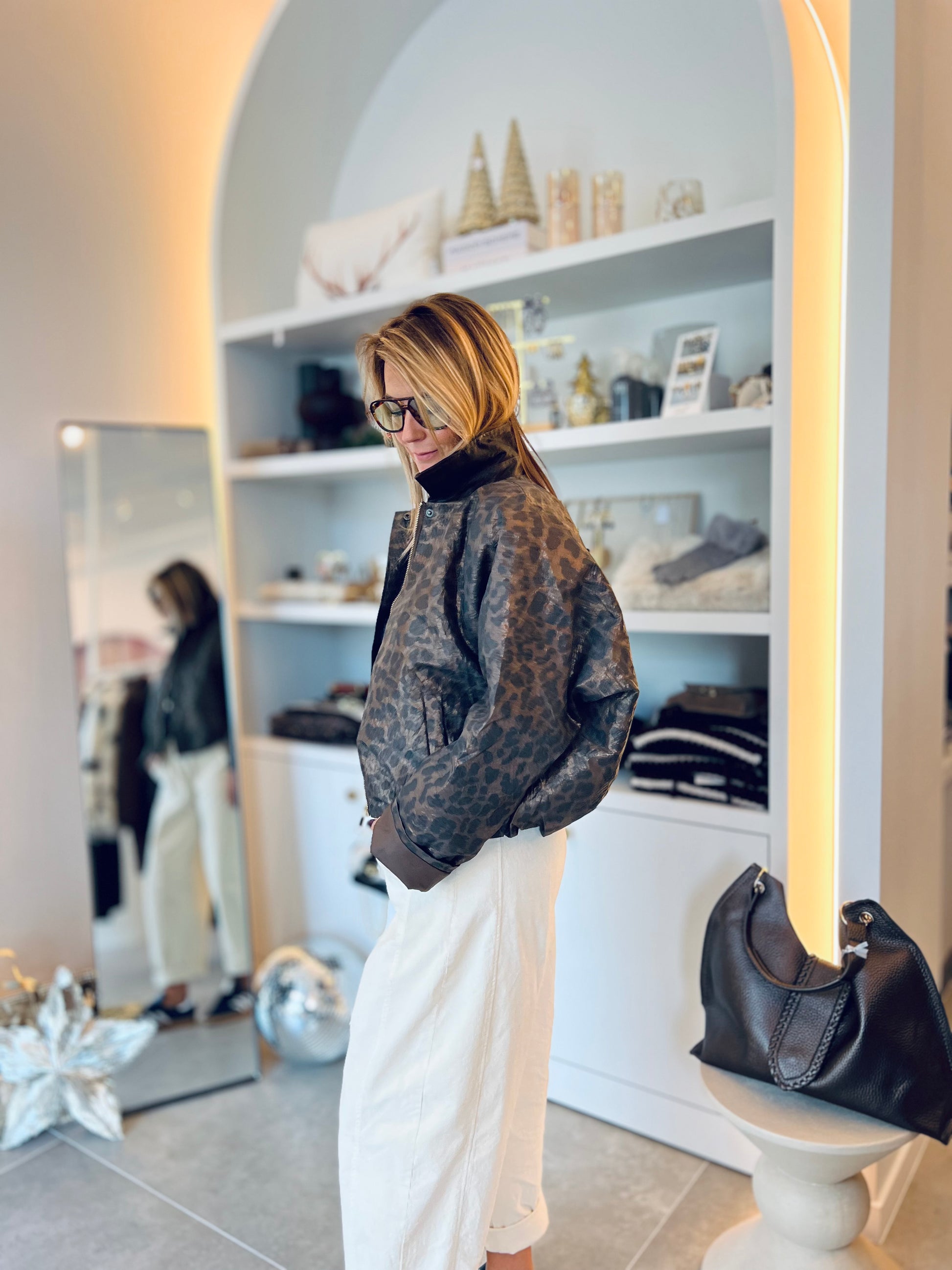 Deze unieke jas combineert een losse, moderne fit met een luxueuze glansfinish. De rijke brons-bruine leopardprint geeft hem een edgy, high-fashion uitstraling, terwijl de zachte structuur en het lichte volume zorgen voor ultiem draagcomfort.