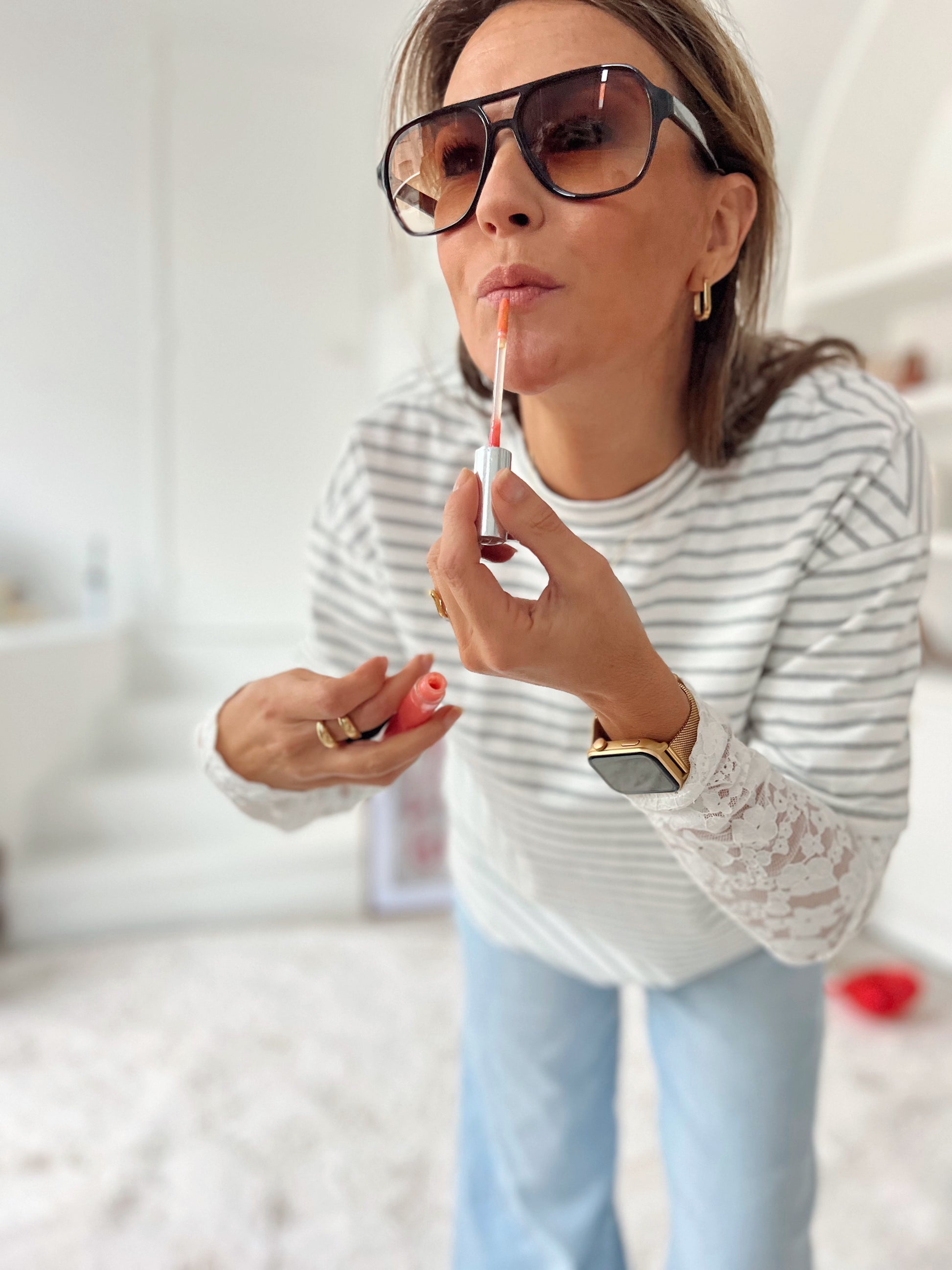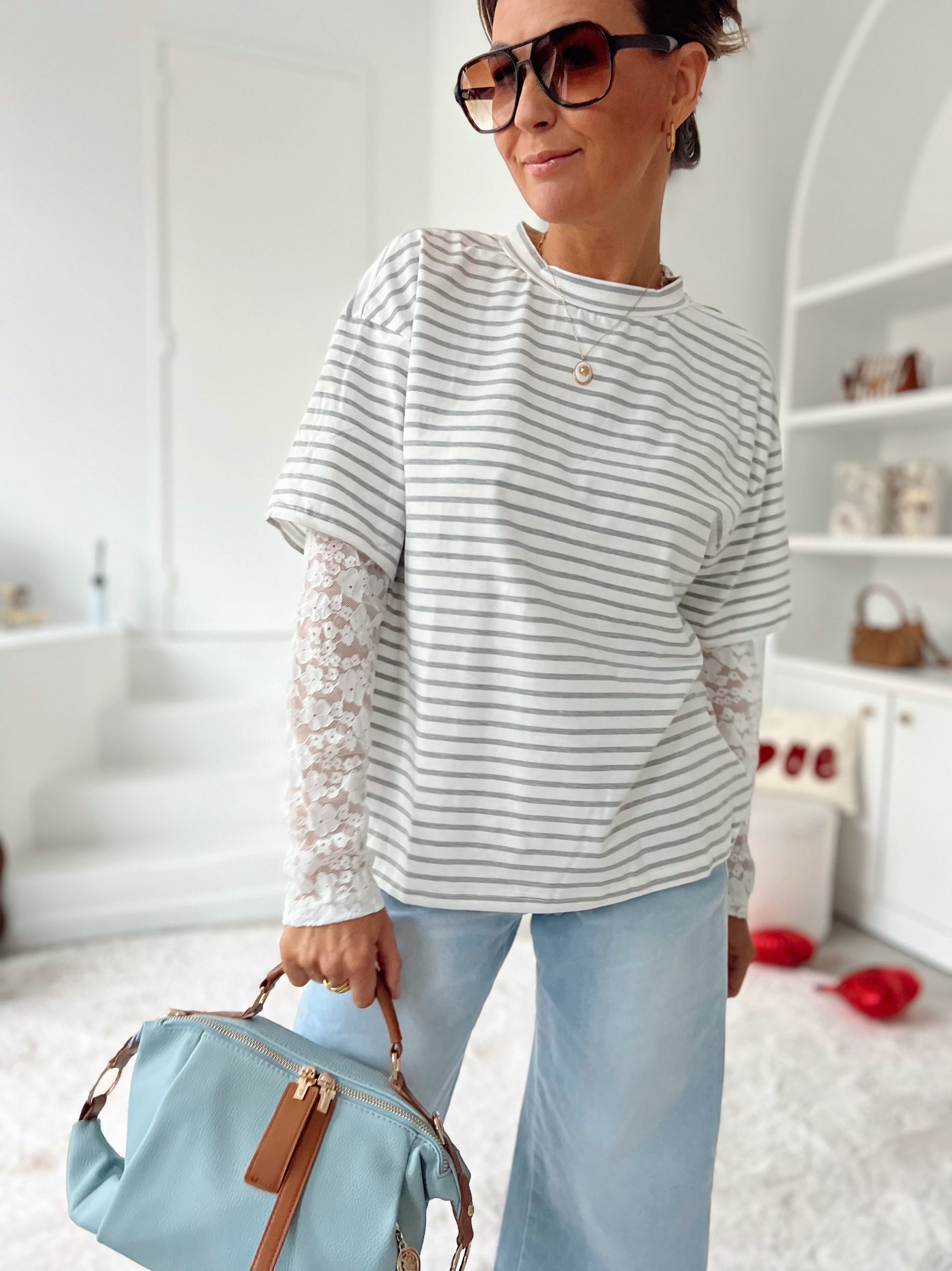 Friswit en grijs gestreept shirt met kanten mouwen.