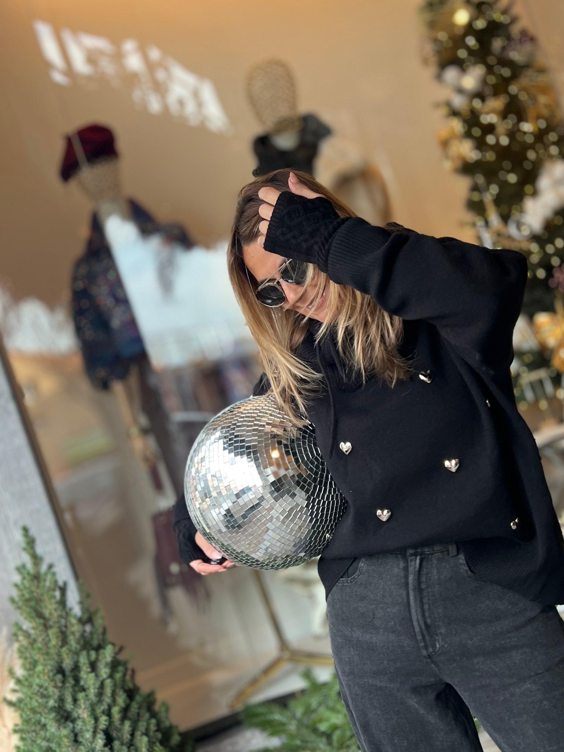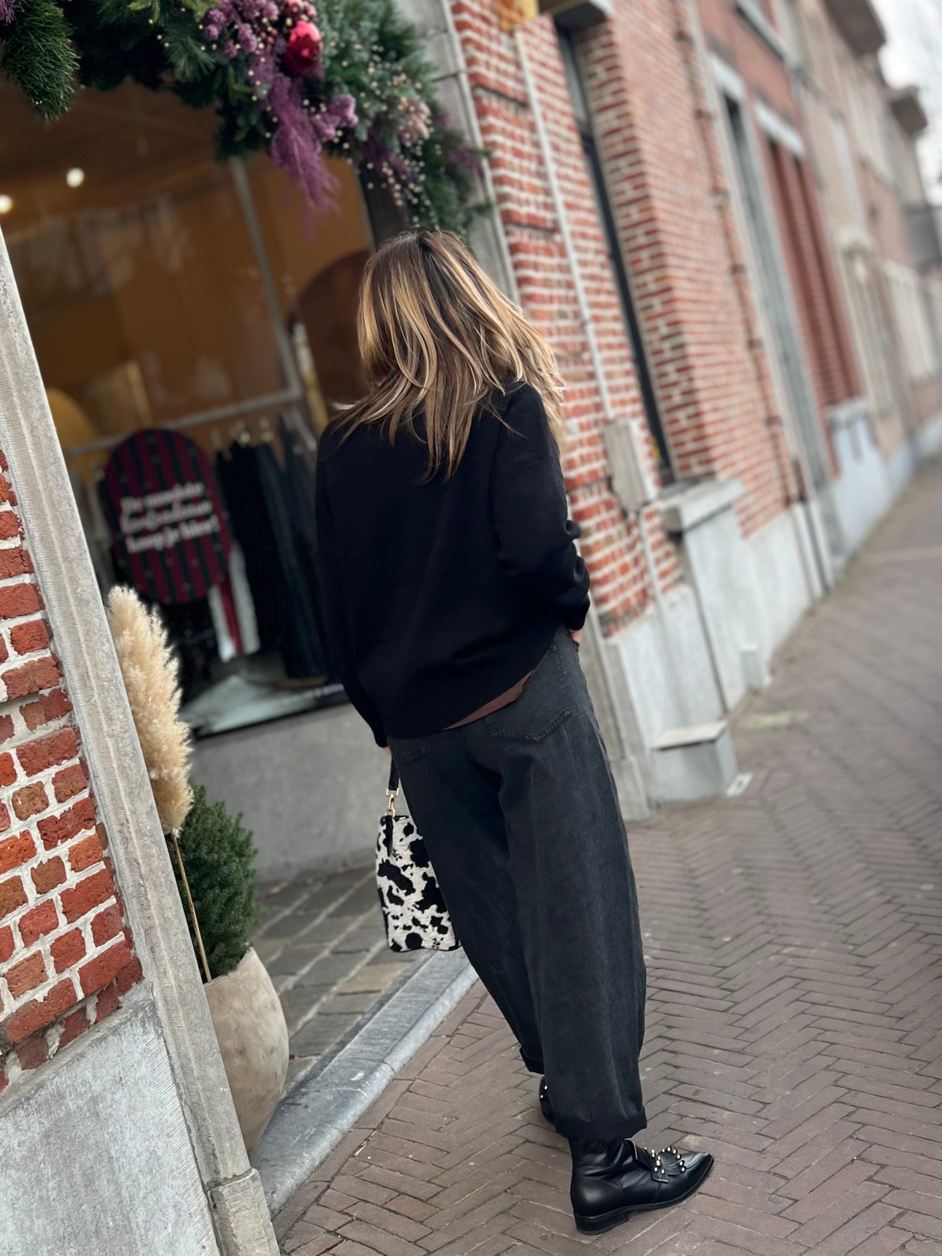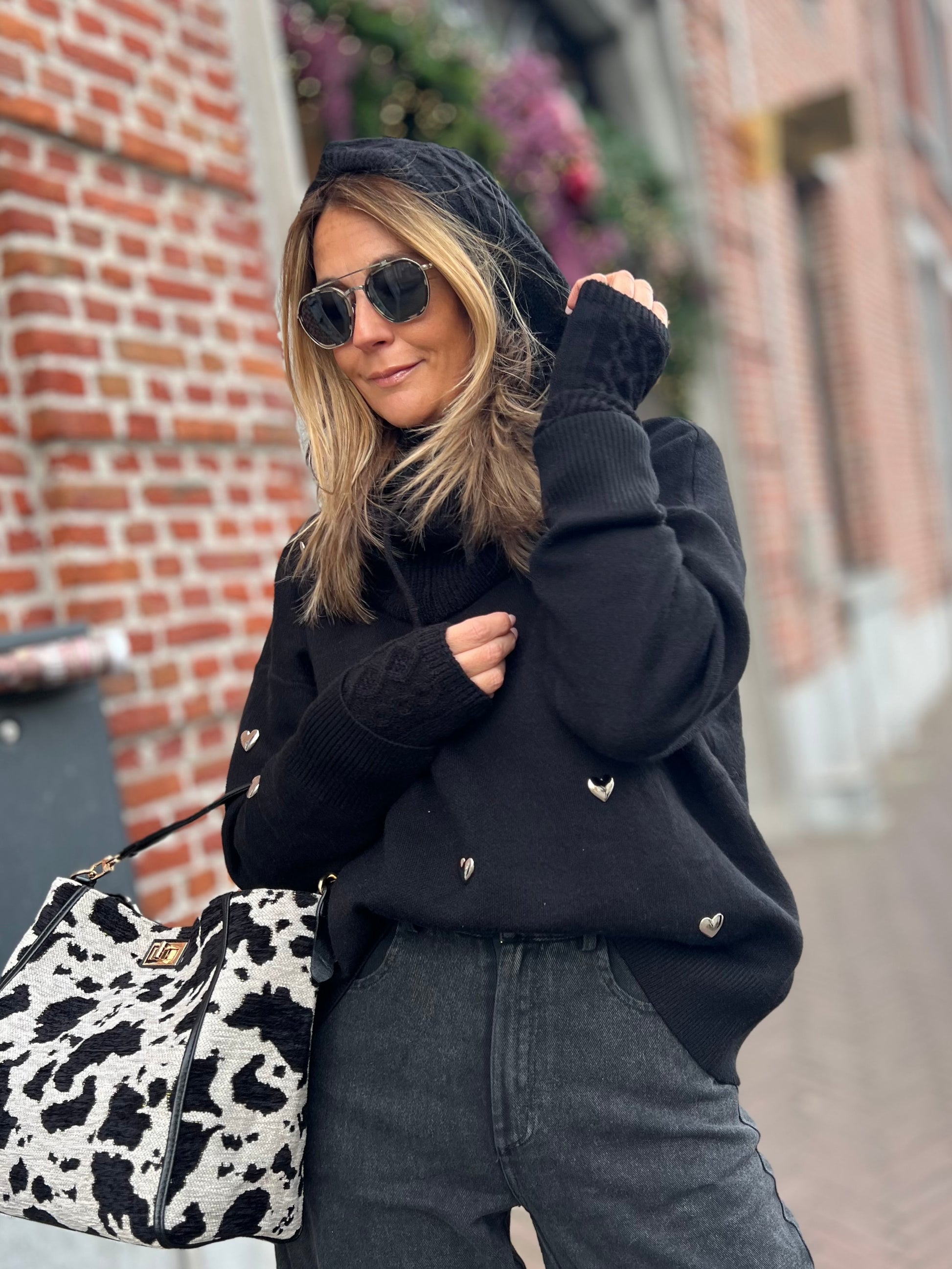 Zwarte pull met opstaand kraagje.