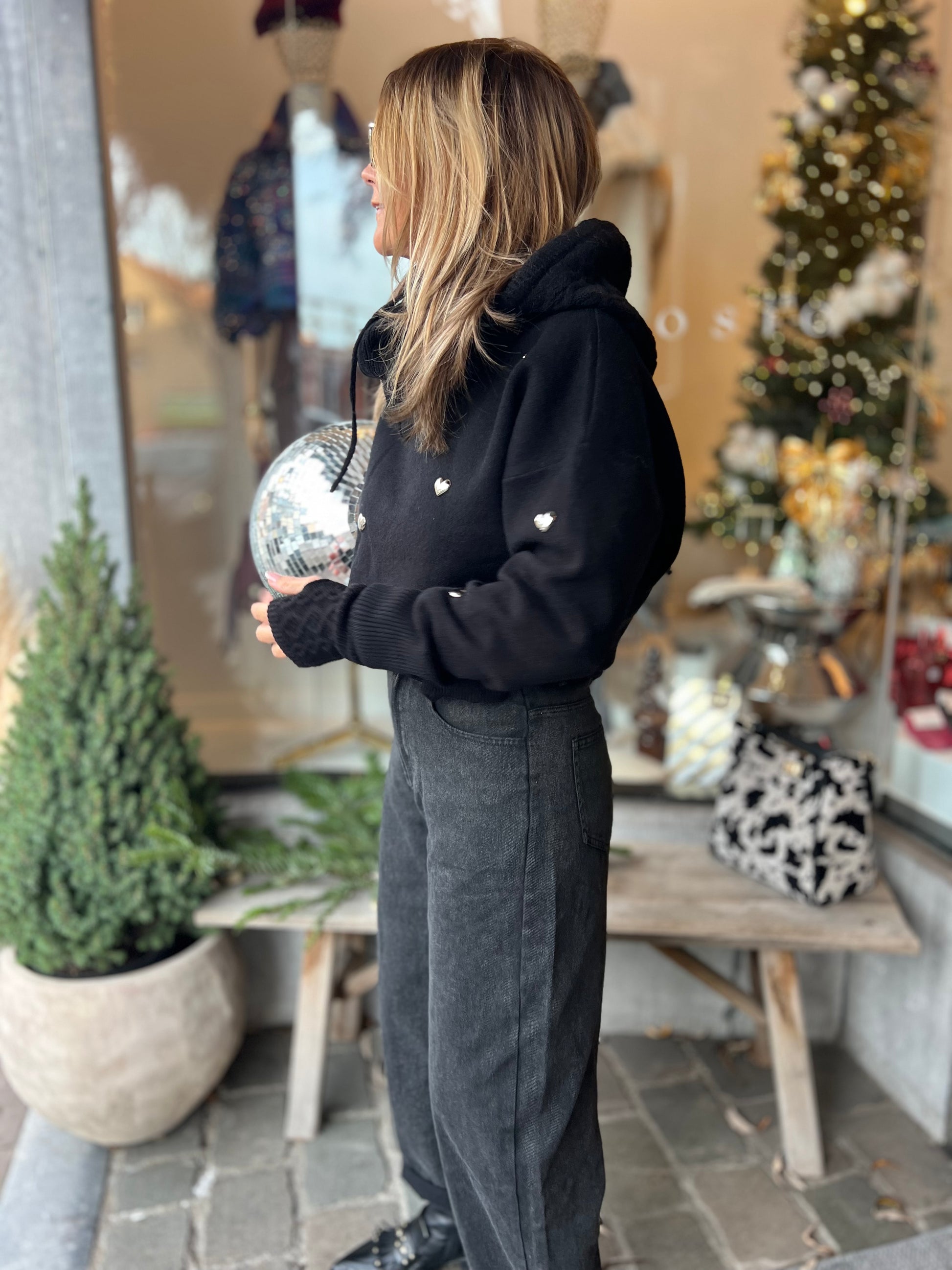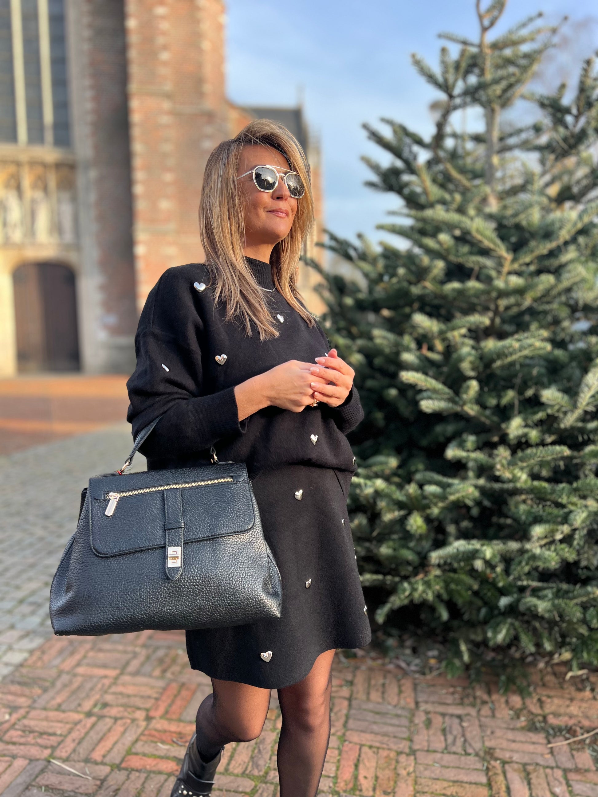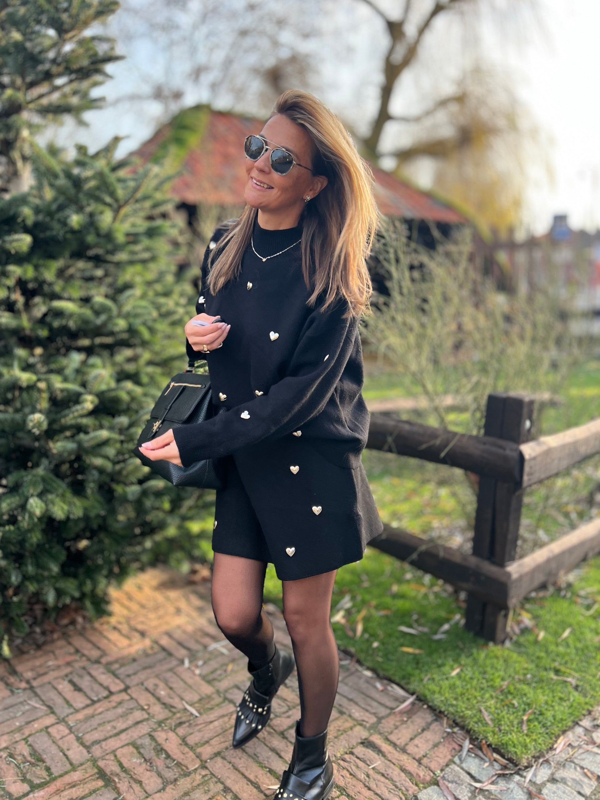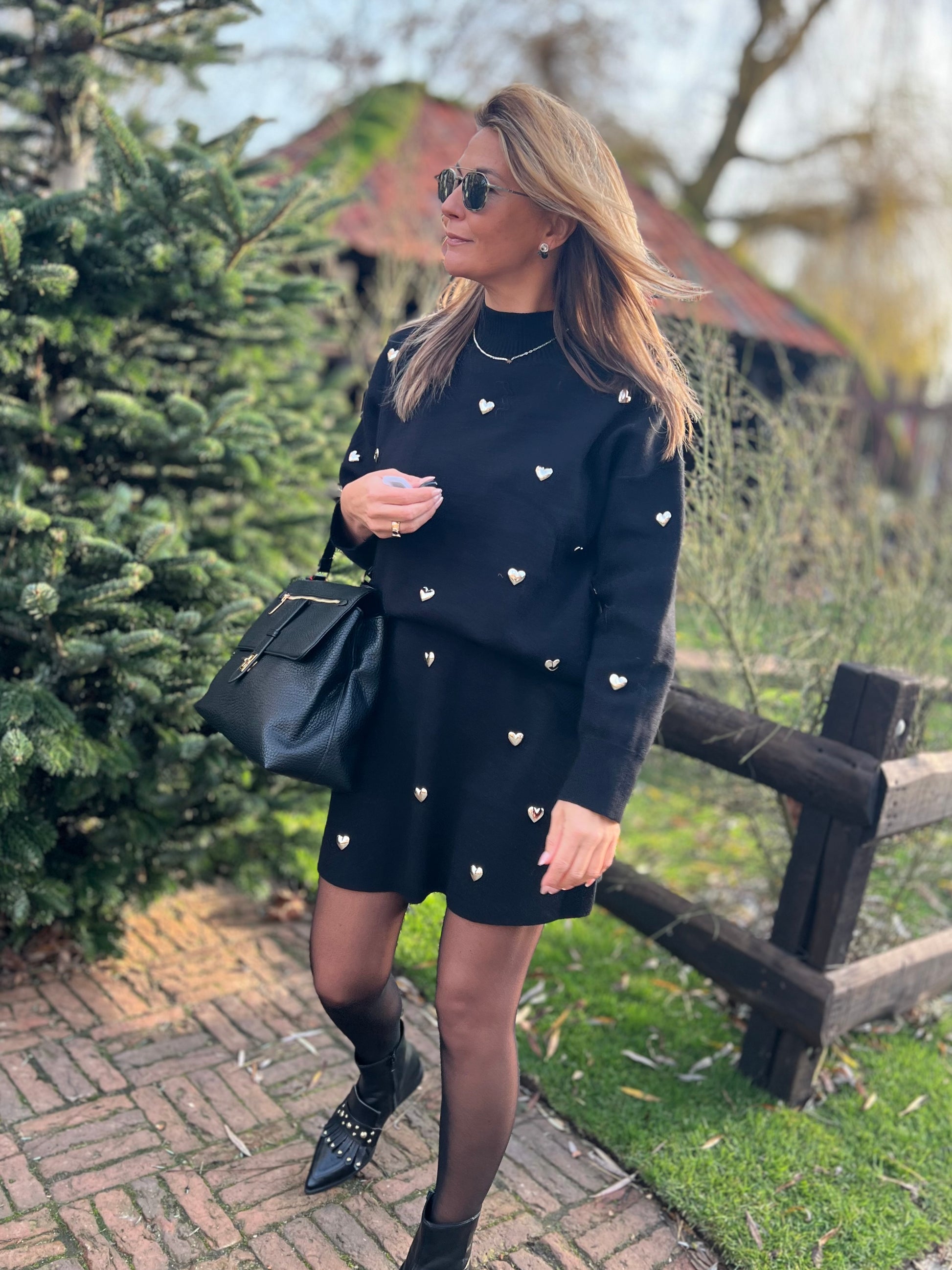 Versierd met zilverkleurige metalen hartjes.