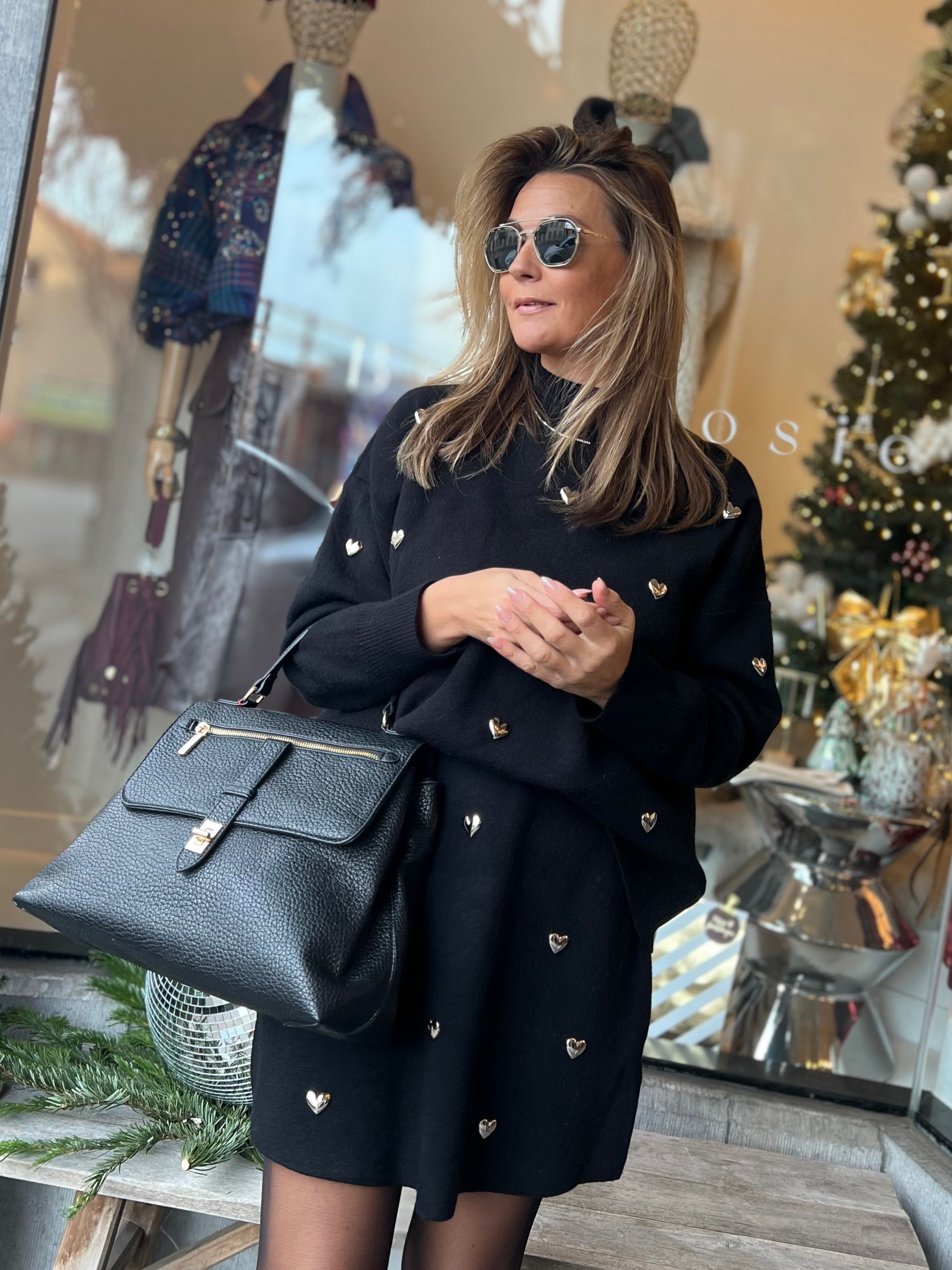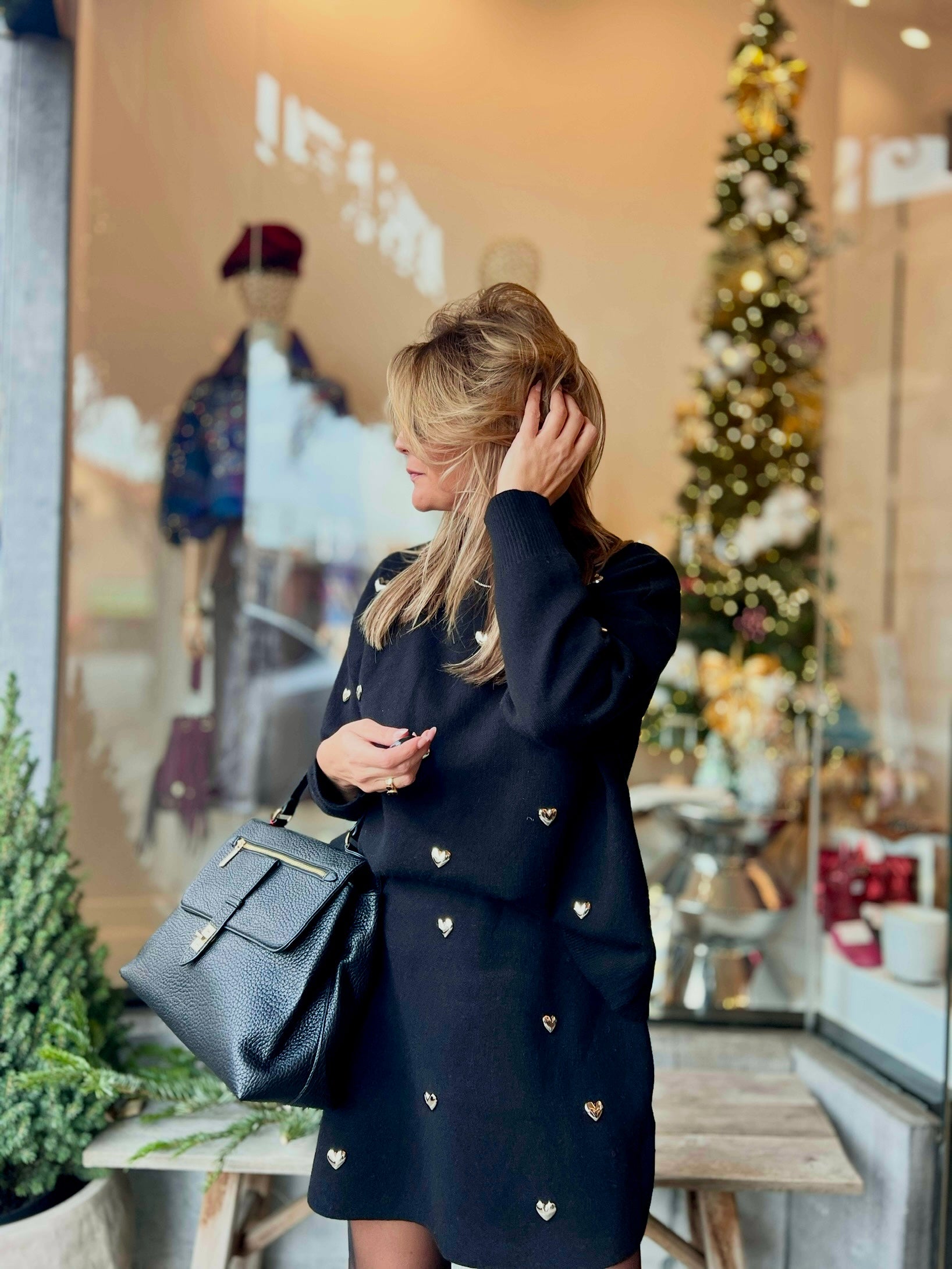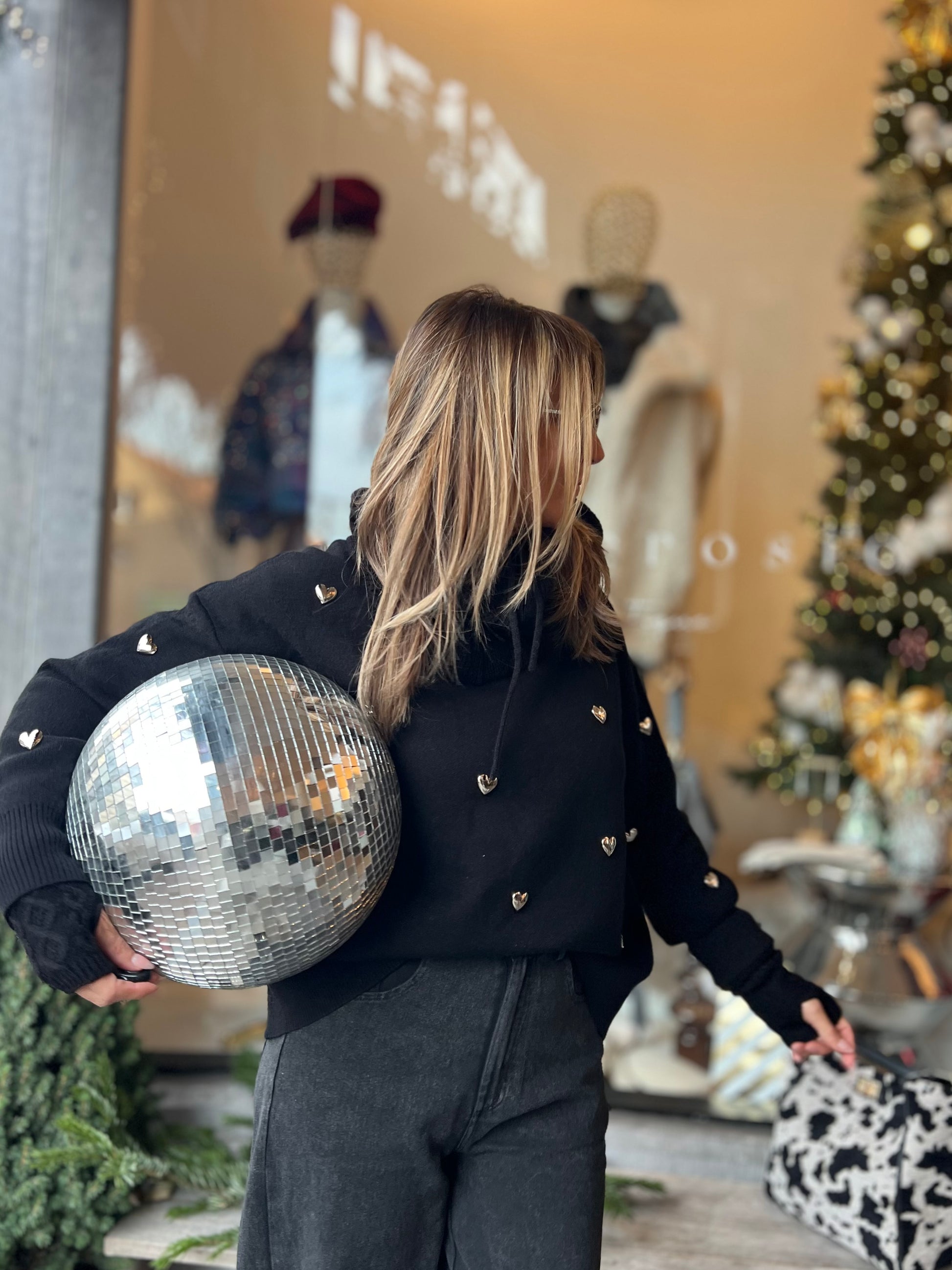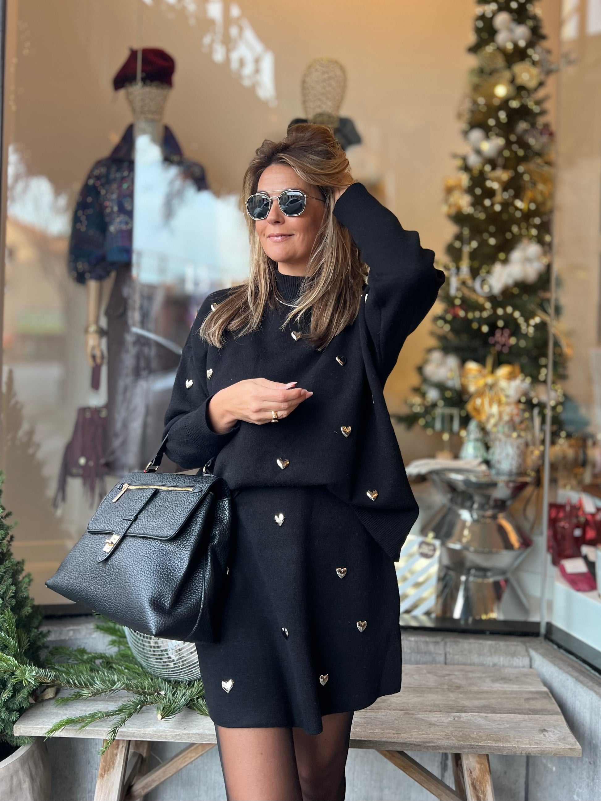 Versierd met zilverkleurige metalen hartjes.